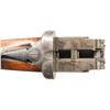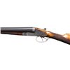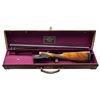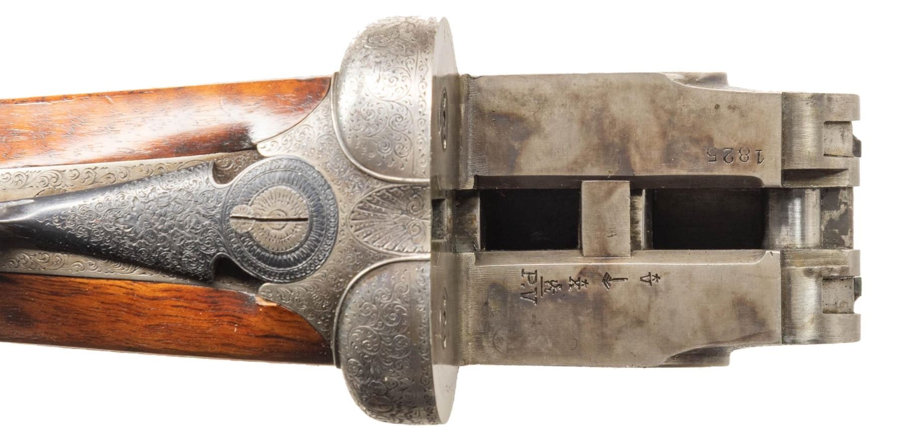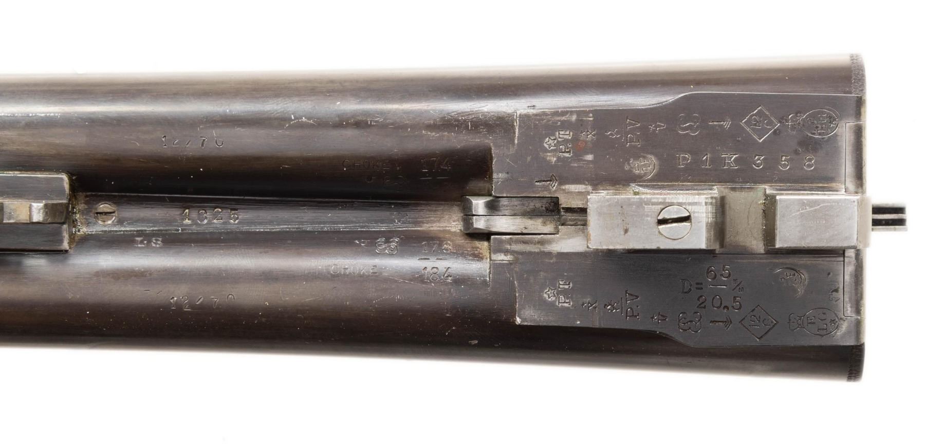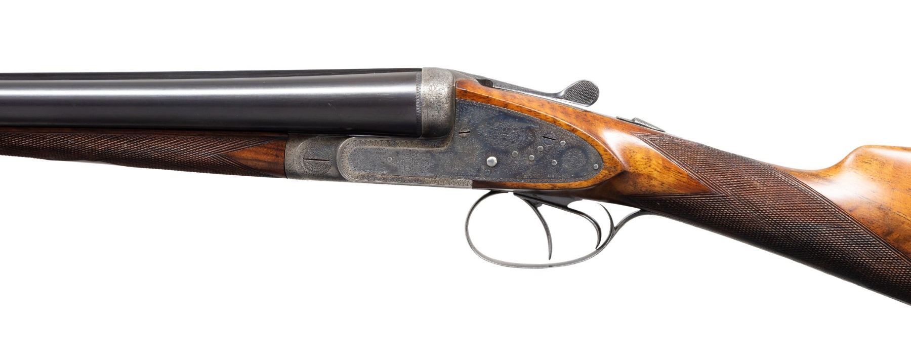 GAME GUN WITH CASE. Cal. 12 Ga. 2-3/4". S# 1825. The 28-1/4" dovetailed barrels are engraved "Auguste Francotte Leige" on slightly raised matted rib. This engraving was definitely done well after this gun was made. Barrel flats are stamped with pre-1920 Belgian nitro proofs for 2-1/2" chambers. Later French nitro proofs and "AF" stamps are also present. Case hardened side lock action is stocked to the fences and features automatic safety, hidden third fastener, bushed strikers and double triggers (front articulated). Action is engraved with very small simple scroll surrounding rose bouquets over nearly all of its surface. No maker's name is present. Steel trigger guard and top lever are engraved to match. Well marbled and nicely fiddle figured European walnut straight grip buttstock measures 14-3/4" over black leather covered pad. Point pattern checkering is at grip. Matching splinter ejector forend has Anson release. MEASUREMENTS: BBLS: Bore Diameter: L .724. R .727. Restriction: L .017 (Mod). R .010 (IC). Wall thickness: L .028. R .029. STOCK: DAH: 2-1/4". DAC: 1-1/2". CAST: about 5/8" off. LOP: 14-3/4". WEIGHT: 6 lb. 15 oz. UNATTACHED ACCESSORIES: gun is housed in leather case with brass corners; lined in burgundy cloth. A black leather gilt label in lid is printed "MAISON FAURE LE PAGE". CONDITION: very fine as partially refinished. Barrels retaining nearly all of an old re-black with newer French proofs and maker's name. Action and lockplates retain about 70% case hardening color. Stocks are lightly refinished. Checkering re-cut. Pad is new. Bores are bright and shiny. Action is tight. Ejectors are slightly out of time. Case leather is good and has added brass accents. Interior is good but shows insect damage. PROVENANCE: From the Private Collection of Berrien Moore III. (25-6017/MGM). CURIO. $2,500-5,500.