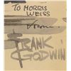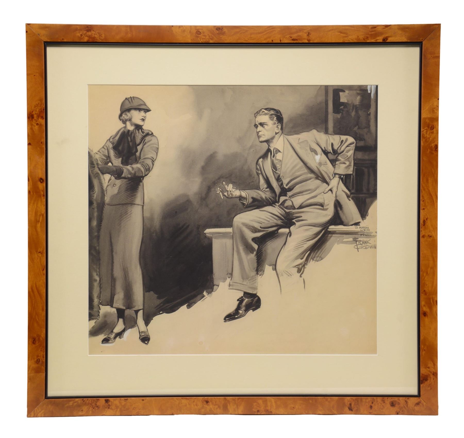 CASE OF THE HOWLING DOG", PERRY MASON. A watercolor magazine illustration for Liberty Magazine circa 1933, depicting a man in a suit with a cigarette consulting a woman in business attire. Captioned "Put on that coat, sister, and then grab a taxi and five to the Breedmont Hotel". Work is addressed to Morris Weiss from Frank Godwin. Housed in a birdseye maple modern frame with liner, matted under glass. SIZE: overall 26" x 27 1/2", sight 18 1/4" x 20". UNATTACHED ACCESSORIES: the book "The Case of the Howling Dog" by Erle Stanley Gardner, Collector's Edition and copy of part of the image an article. CONDITION: very good overall condition. PROVENANCE: from a Private Florida Collection. (05-928/TG). $350-550.