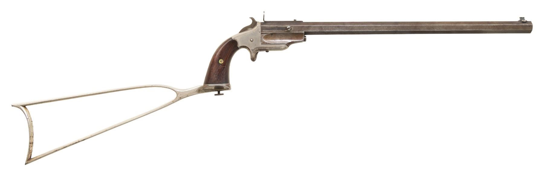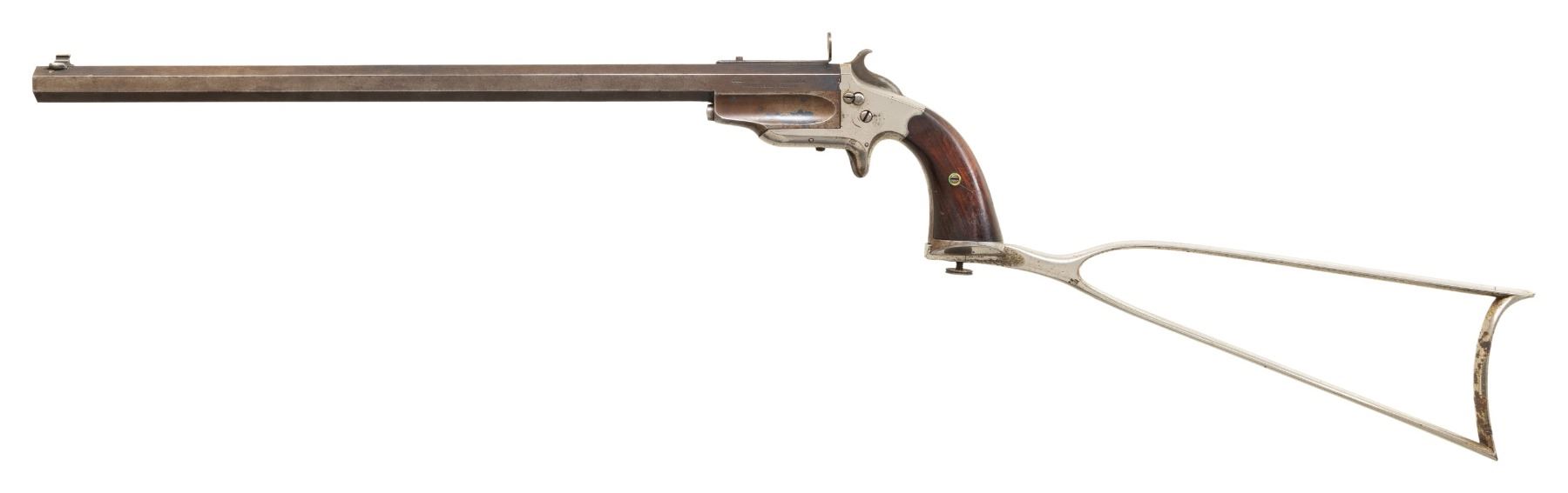 WITH MATCHING STOCK. Cal. 32 RF. S# 744. Mfg. 1870-1890. Matching numbered oct. 15" barrel has sliding extractor on right side. Blade front sight & peep rear sight. Nickel finished Iron frame w/ spur trigger & two piece walnut grips. UNATTACHED ACCESSORIES: matching numbered iron skeleton stock with good nickel. CODITION: barrel shows traces of blue with balance having gray/brown patina appearance showing marks. Fair nickel with patina & peppery oxidation. Fair worn grips. Worn rifling with oxidation. PROVENANCE: Estate of Groves Herrick. (01-28347/MD). ANTIQUE. $500-800.