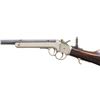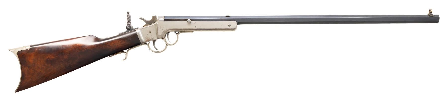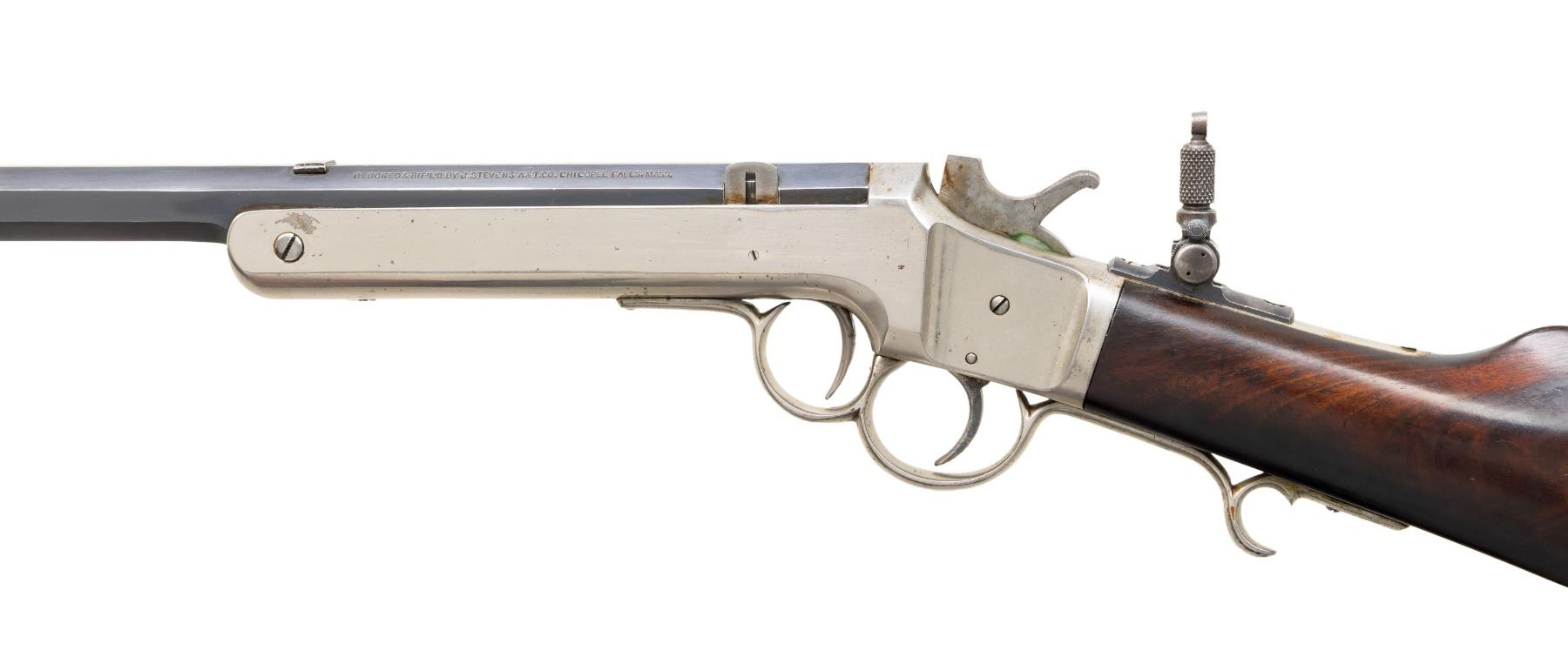 Cal. 25 Stevens. S# 27. The oct.24" barrel has been rebored by Stevens A&T Co. Combination globe blade front sight, filler in rear dovetail & tang peep sight; no rear tang screw. Nickel finished action w/ front trigger opening action & finger curl triggerguard. Walnut buttstock w/ crescent buttplate. CONDITION: very good factory reblued finish with light patina & edge wear near muzzle. good to very good nickel finish with scattered pinprick patina, spots of peeling & marks. Very good wood finish showing light handling marks. Good rifling with wear towards chamber. PROVENANCE: Estate of Groves Herrick. (01-28340/MD). ANTIQUE. $500-800.
