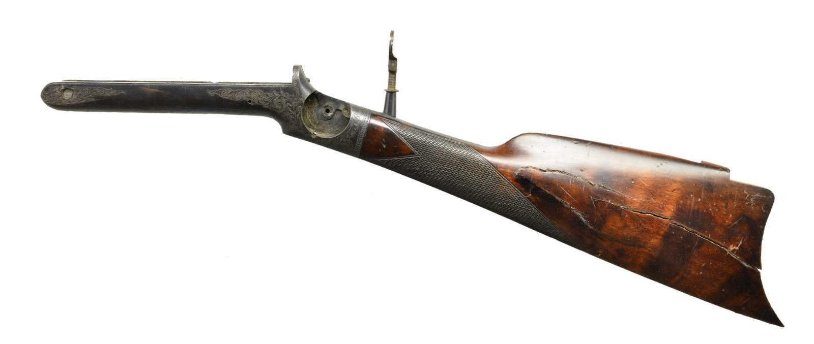 Cal. N/A. NSN. Bbl. N/A. Mfg. 1872-1888 as third type; approx. 7,500 units. Designed with adjustable hammer to use rimfire (striker on hammer) or centerfire (firing pin in frame). Deluxe sporting rifle frame with engraving, lollypop style peep sight on top tang (no provision for other sights) and nicely figured checkered buttstock cut for crescent style buttplate. Action and stock stripped except for hammer spring and centerfire firing pin; no side plate. CONDITION: fair to good metal with peppery oxidation; original blued finish. Buttstock with significant weather crack and dent on comb. PROVENANCE: Estate of Frank Glenn Marsh. (01-21292/NW). ANTIQUE. $100-200.