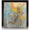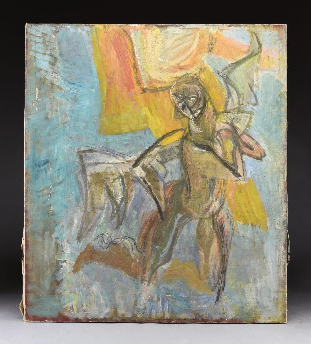 ABSTRACT ART. Oil on canvas of runners beneath a large abstract sun on a blue ground. Artist last name with New York address painted on verso of canvas. SIZE: 40" x 35". CONDITION: vertical line of paint chipping proper left side facing on a line with stretcher. (05-694/TG). $1,500-2,000.