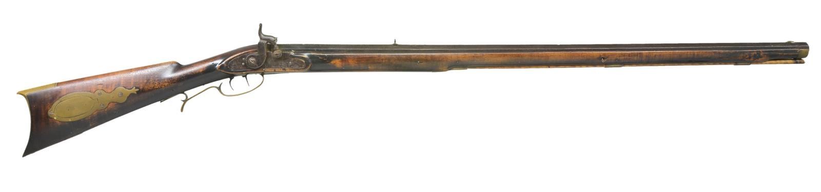 LONG RIFLE. Cal. 54. NSN. Bbl. 36" octagon. Top flat has partially legible marking “F. BEERSTRECHER/LEWISBURG, UNION CTY, PA”. Engraved trade lock marked “G. Goulcher”. Double set triggers. Pin fastened full length cheek piece maple stock. Oval lid patchbox. Brass fittings include crescent buttplate, toe plate, finger curl trigger guard, side plate escutcheon & nose cap. Artificially striped hardwood ramrod is held by a plain brass thimble & 2 pipes. American Gunsmith by Frank Sellers has the following listing: “BEERSTRECHER, FREDERICK, (1812-1890). Philadelphia, Pennsylvania, 1848-1856d, Lewisburg, Pennsylvania, 1857-1868, Centreville, Michigan, 1868-1879d. San Francisco, California, 1879-1890. Patent # 13,592, September 28, 1855, superposed loads. Derringers and rifles both with and without patent mechanism. Percussion 4 shot rifle. (Winant, Shelton)”. CONDITION: bbl. has dark patina appearance w/ pitting having an area of cleaning near markings. Lock has dark pitted appearance. Wood has added finish over wear & handling marks. Functioning lock. Dark pitted bore. PROVENANCE: Collection of Dr. John Persing. (01-22308/DS). ANTIQUE. $600-1,000.