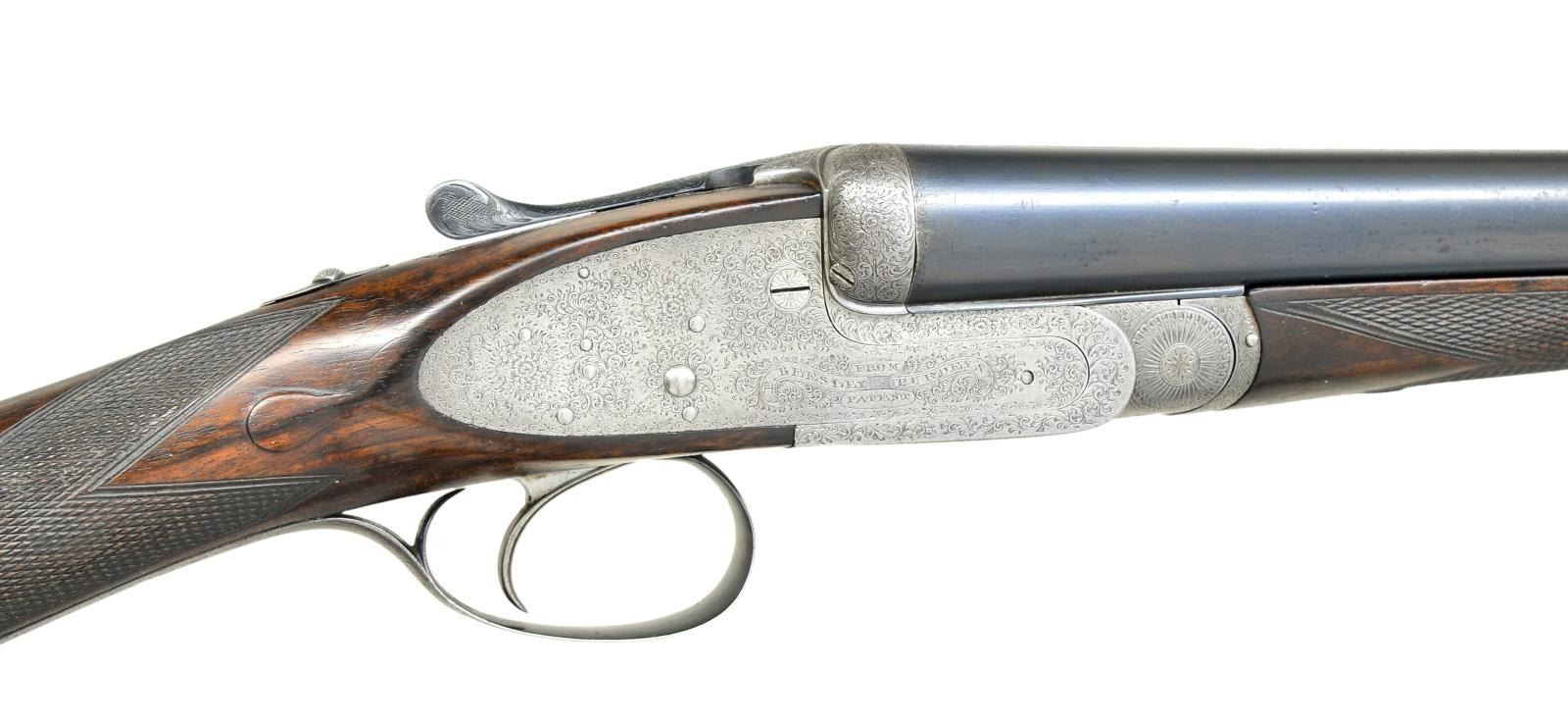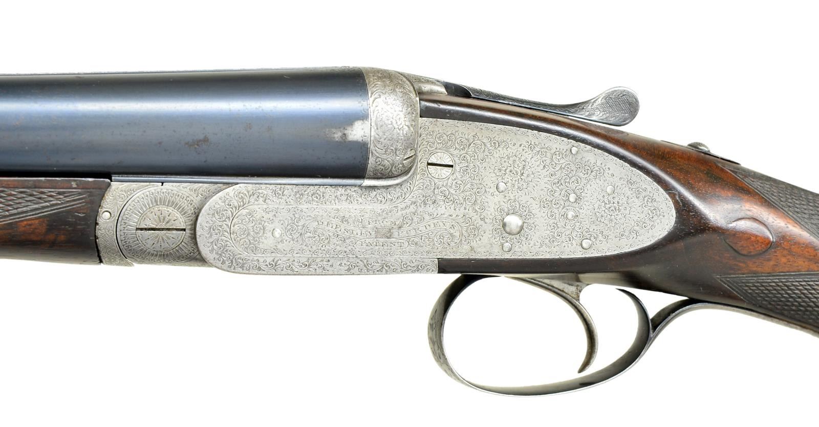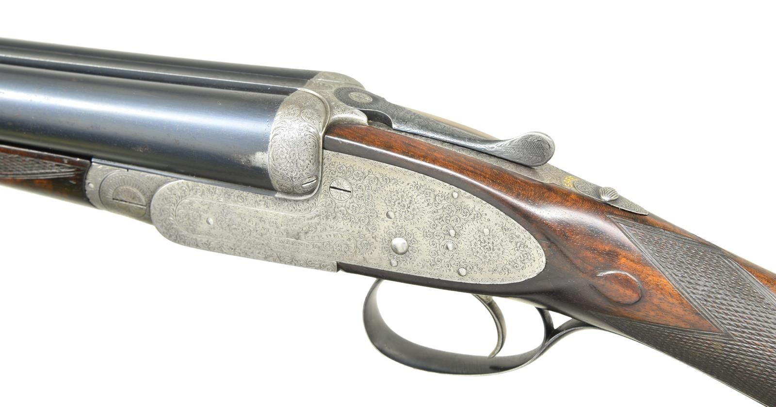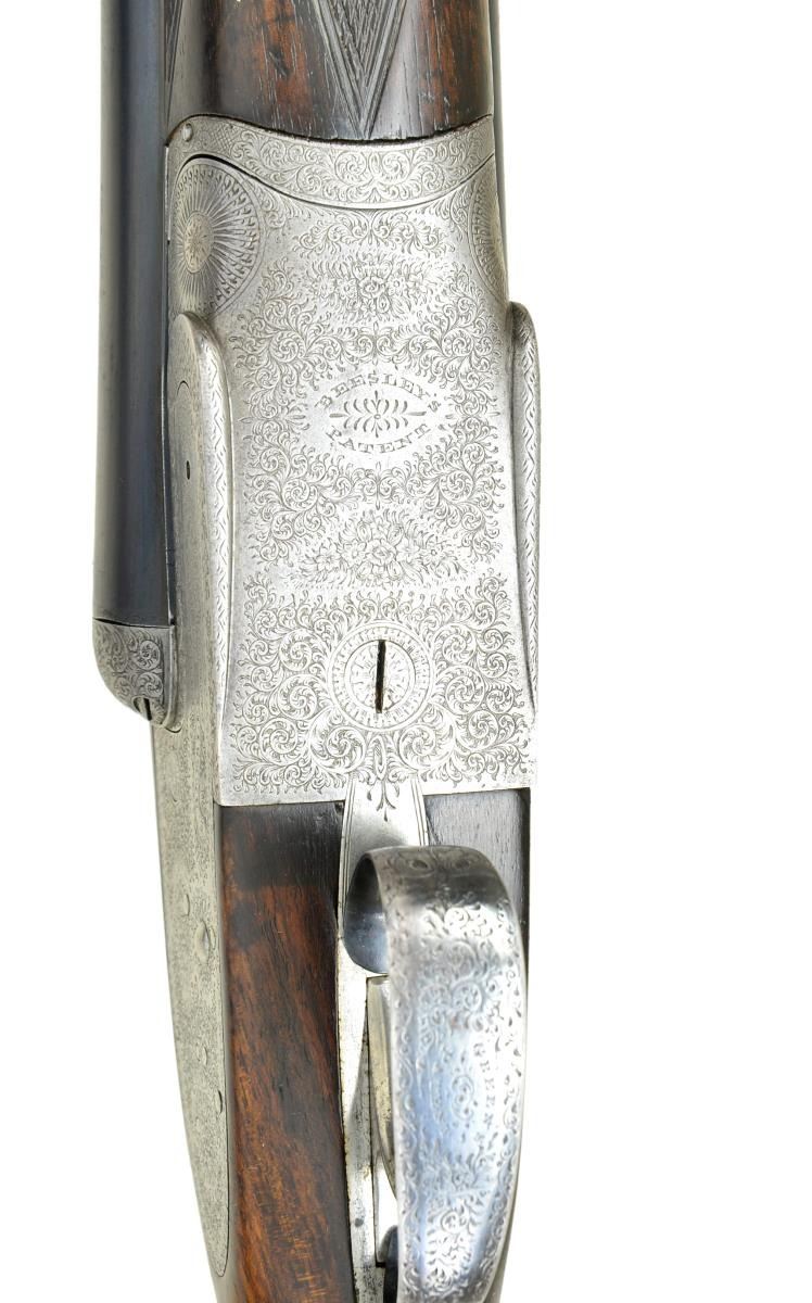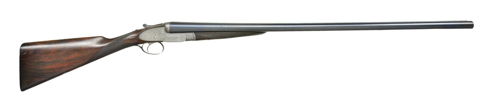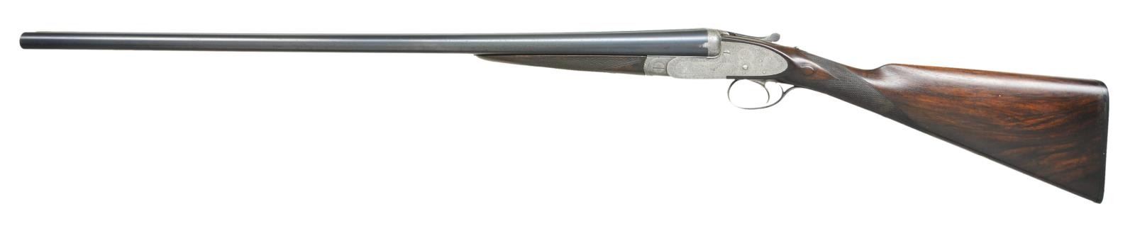 SINGLE TRIGGER GAME GUN. Cal. 12 Ga. 2 1/2". S# 1396 (1896). Built on the Beesley designed action that was assigned to Purdey's in the early 1880s, this gun has 30" chopper lump bbls. engraved "F. BEESLEY" (from Purdey's) 2. St. Jame's Street, London, corner of Pall Mall." on swamped game rib. Tops of bbls. are engraved "Whitworth's Fluid Pressed Steel". This is gun #2 of a pair with the number "2" engraved at rear of rib, on top lever and forend iron. Bbl. flats are stamped with London nitro proofs for 2 1/2" chambers. Bottoms of bbls. are stamped with serial numbers and "Sheaf of Wheat" logos. Coin finished Beesley self opening sidelock action features automatic safety ("SAFE" inlaid in gold), hidden third fastener, bushed strikers and single nonselective trigger (trigger guard bow marked "Green's Patent"). Action is engraved with near full coverage well cut rose and scroll. Lockplates are engraved "FROM" "F. BEESLEY" "PURDEY'S" "PATENT", in attractive scrolling device. Bottom of action is engraved "BEESLEY'S" "PATENT". Top lever is engraved "PATENT". Serial number is on trigger guard tang. Straight grip buttstock, of well marbled and lightly figured European walnut, measures 14 1/8" over checkered hard rubber buttplate. Stock features usual drop points, point pattern checkering on diamond hand and vacant silver oval on toe line. Matching splinter Southgate ejector forend has Anson release. MEASUREMENTS: BBLS.: Bore Diameter: R: .731" with .004" flare, L: .731". Restrictions: 0. Minimum Wall Thickness: R: .024", L: .023". STOCK: DAH: 2 3/8". DAC: 1 9/16". CAST: approx. 1/4" off. LOP: 14 1/8". WEIGHT: 7 lbs. 2 oz. CONDITION: good as refinished. Bbls. retaining most of a reblack over scattered light pitting, engraving considerably softened. Action is cleaned to silver gray with light pitting. Stocks show considerable wear, sharp edges rounded, oil refinish over a few marks and checkering recut. Bores are shiny. Right bbl. with a large number of scattered pits. Left bbl. has a few pits and evidence of dent removal about 6" in front of forend. Dents have also been removed from right bbl. 8" behind muzzle. Action is tight. Bbls. slightly off face. "Three pull" single trigger appears to work well. Ejectors will not fire. (01-20906/MGM). ANTIQUE. $5,000-8,000.