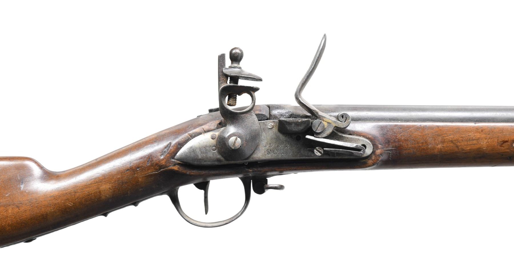 Cal. 69. NSN. Bbl. 40 1/2" Band mounted semi circular brass front sight with open rear sight dovetail. Marking at breech end of bbl. appears to be "2TVL / 300". Lock is marked "D P F & D P" over "St. Etienne" & is an apparent replacement. Hardwood stock is held by 3 iron bands with spring keepers. Iron buttplate & trigger guard. Ramrod is not present. CONDITION: Metal has a faded gray appearance showing light pitting. Stock shows wear & handling marks with numerous pin holes around the butt. Lock is not functioning & is not properly seated in the stock. Frizzen & pan are crude replacements. Dark pitted bore. (01-28139/DS). ANTIQUE. $1,000-2,000.