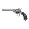 Cal. 11mm. S# 11351. Bbl. 6 3/8". Single action pinfire revolver mfg. by Lefaucheux in Paris, France. The top of the bbl. is marked "INVON E. LEFAUCHEUX BRTE PARIS", with a similar marking present on the left side of the frame. Right side of frame is marked "G. 100". Metal components have been cleaned and exhibit a gray patina. Frame is mounted with 2-piece smooth wood grips. Bead front sight with hammer notched rear sight. CONDITION: metal components exhibit a gray patina, with light to mild pitting present overall. Bright bore, exhibiting scattered spots of dark oxidation and strong rifling throughout. Grip exhibits some scattered marks from handling and storage, but otherwise remains sturdy and serviceable. (01-25035/MLW). ANTIQUE. $250-350.
