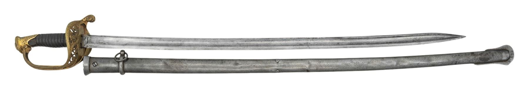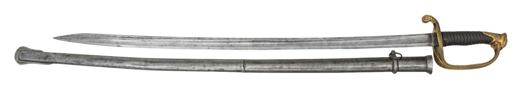 A good French M1845 foot officer's sword measuring 40" overall with a plain blade etched on the spine "Bisch a Boersch & Klingenthal". Gilded brass hilt with a pierced foliate decorated guard and acanthus leaf pommel. Wire wrapped horn grip and an iron scabbard. CONDITION: blade has a mottled gray patina and shows light sharpening. Hilt shows expected wear with areas of gilding remaining. Scabbard has a few shallow dents and a central repair. PROVENANCE: From the PMRB Collection. (02-25856/BF). NON-GUN. $300-500.