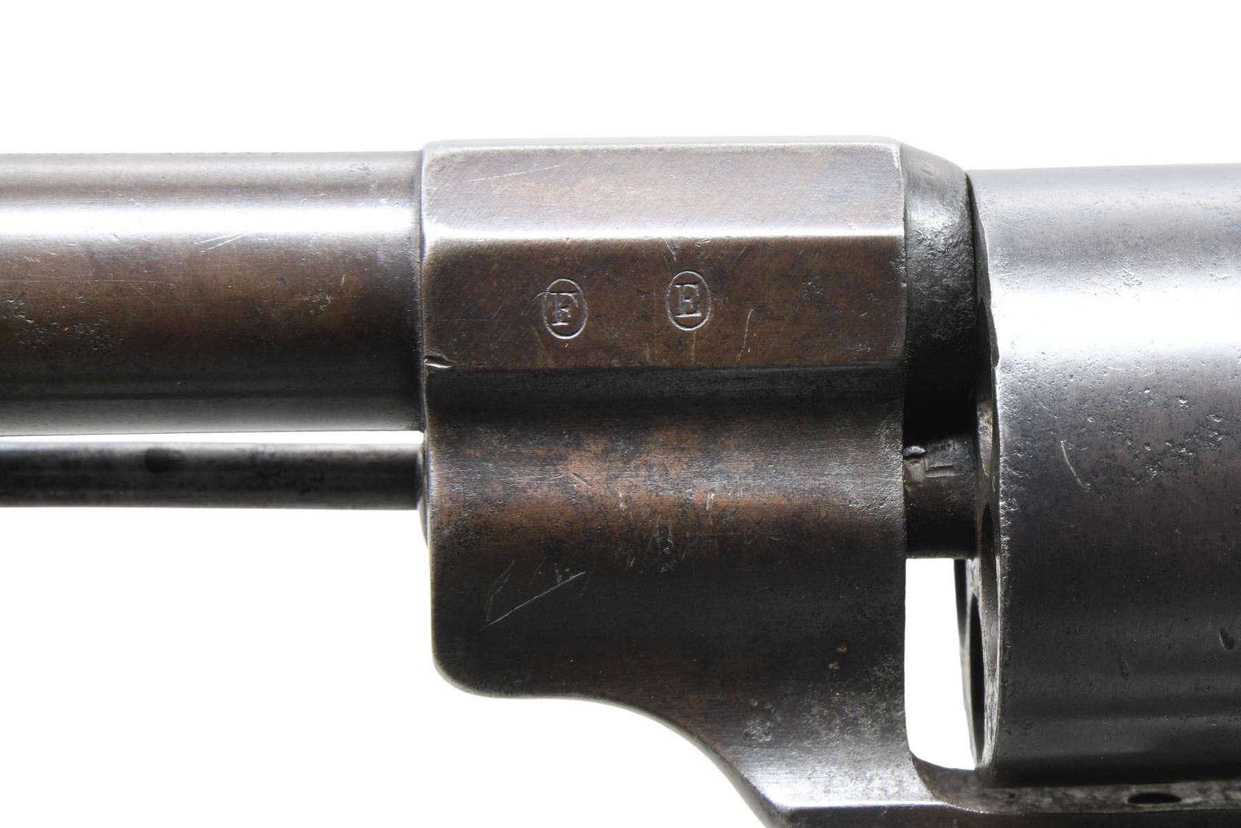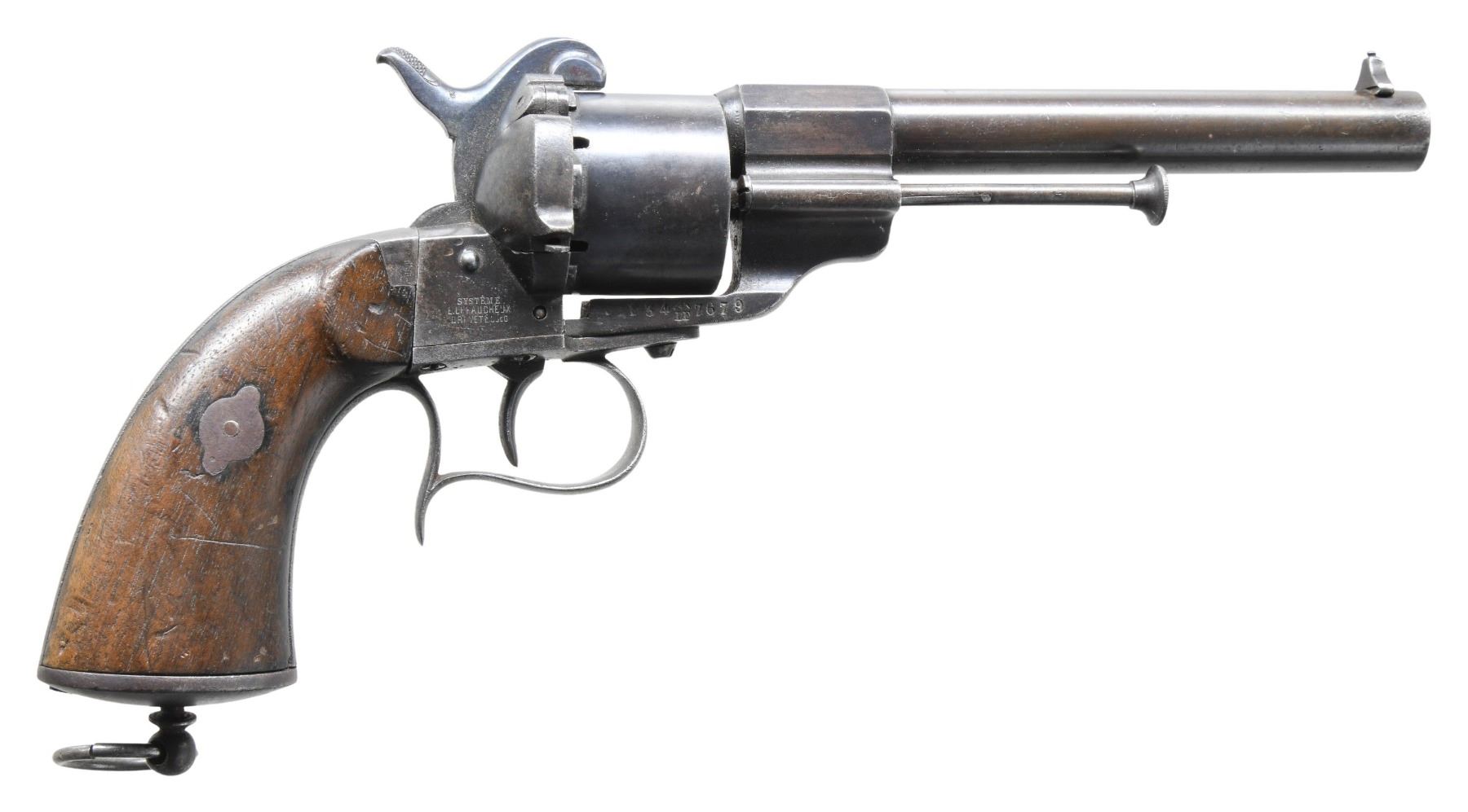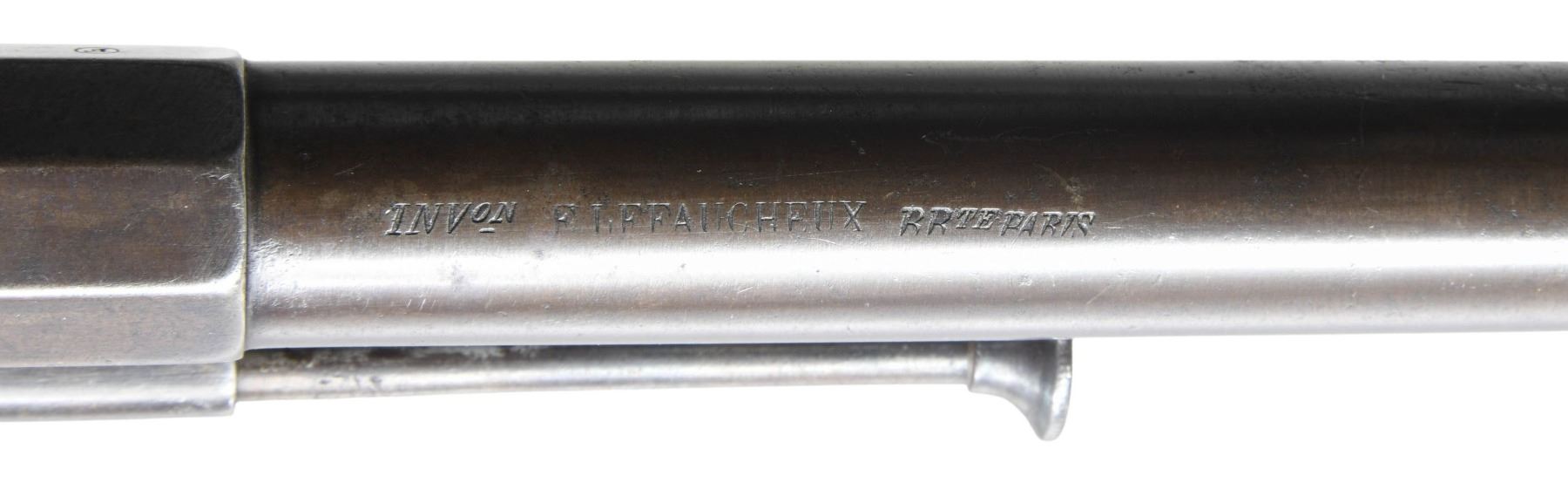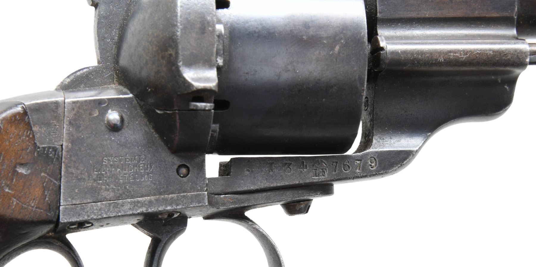 CAVALRY REVOLVER. Cal. 12mm pinfire. S# 1347679. Standard configuration of model 1854 revolver, 6.25" Lefaucheux marked barrel, "SYSTEME / E. LEFAUCHEUX / BREVETE sdcg" stamped on right side of frame which is not shown in any text. Right side of barrel extension has LF and S# 7679 to right and secondary # 134 to left, French military proofs are found on barrel and butt cap, four groove rifling characteristic on French military pattern 1854s. Originally in Chris Curtis collection, author of several texts on Lefaucheux. CONDITION: good to very good overall,good markings, metal has traces of an old blue finish, mechanics functional, good rifled bore. PROVENANCE: Estate Collection of Nicholas Apergis. (01-27539/JS). ANTIQUE. $1,000-1,500.