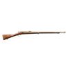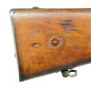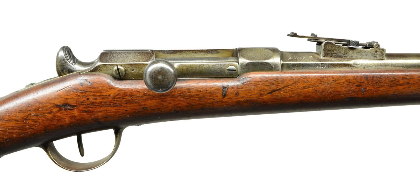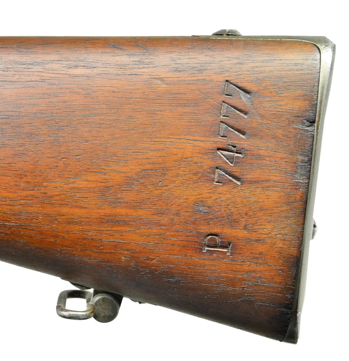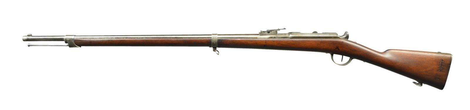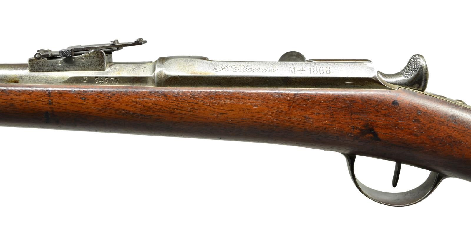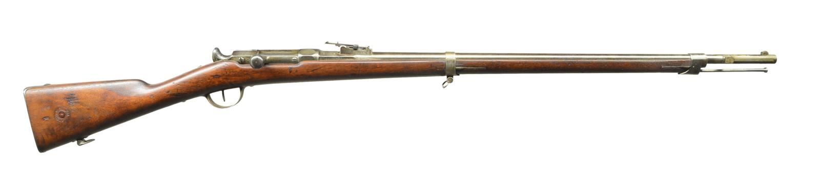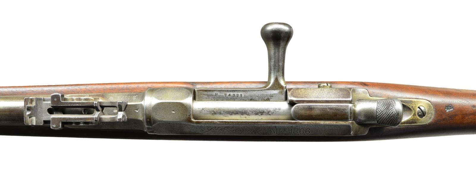 MILITARY SINGLE-SHOT RIFLE. Cal. 11mm Chasspot Combustible. S# P74777. Bbl. 32 1/2". Ladder rear sight graduated to 1300 yards. Stud type front sight. The Model 1866 is a needle fire single shot rifle using either a paper or cloth cartridge w/ an internal priming pellet. Straight bolt handle. Rifle is cocked by a roller equipped thumbpiece. Receiver marked on top left flat in script w/ “ST. ENTIENNE” & “MLE 1866”. Cleaning rod & bayonet bar are present. Walnut stock is fastened by 2 bands & marked on right side of butt w/ roundel which has “MAI.”, “B.S.”, “J.” & “MA” in center. Stock has acceptance marks near roundel & at top & bottom of grip. Marked on left side of butt w/ prominent S#. CONDITON: stock has nice original finish w/ crisp markings. Stock has light wear & scattered handling marks. Several notable small gouges on right side of butt. Metal is overall gray & light patina w/ a lightly cleaned appearance & light overall wear. Sharp needle is present in bolt. Rubber obdurating rings are not present in bolt. Bore is shiny w/ strong sharp lands. (01-22728/RW). ANTIQUE. $800-1,100.