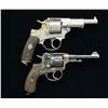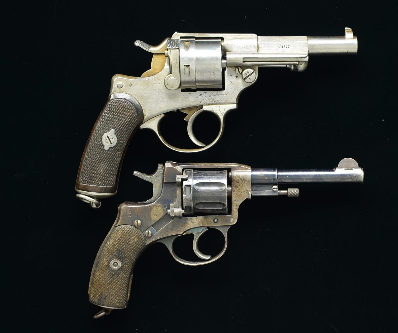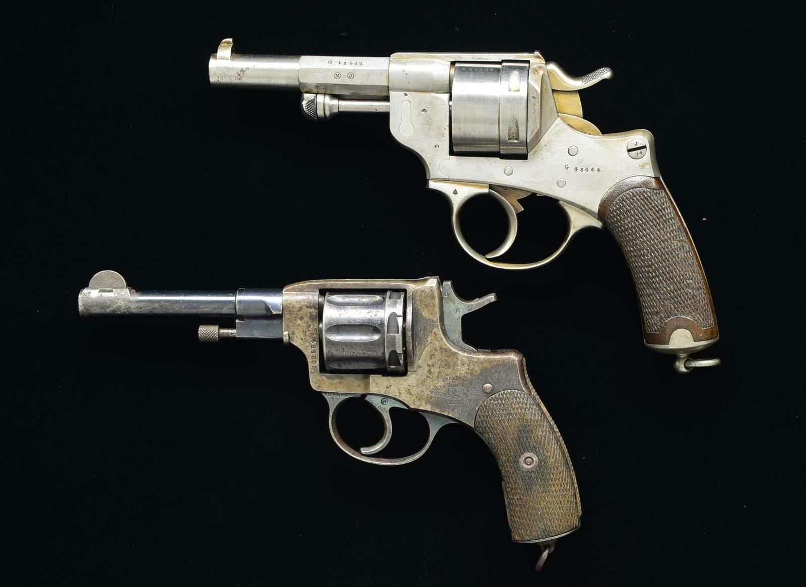 1) FRENCH MODEL 1873. Cal. 11mm. S# G48444. Bbl. 4.7" part rnd. part octagon. Mfg. 1873 by French armory at St. Etienne. Matching numbers on bbl., cyl., cyl. pivot, frame, trigger, hammer & trigger guard along w/ J44 on 3 screw heads & cyl. face. Approx. 350,000 mfg. 1873-1886. Unfinished metal & checkered walnut grips. Numerous French proofs. CONDITION: very good overall appearance w/ occasional spots of light staining. Beginning patina appearance on grip cap. Sm. spot of light oxidation on left front of bbl. Near excellent bore & chambers w/ unused appearance. Good traces of case colors on hammer & trigger w/out color on trigger face. Slight hand wear on grips w/ occasional sm. mark. Overall exceptional example. (01-18147/NW). ANTIQUE. 2) RUSSIAN MODEL 1895 NAGANT. Cal. 7.62 Nagant. S# 108584. Bbl. 3.45". Imperial Russian production at Tula Arsenal mfg. 1915 (1897-1917). Earlier production w/out letter prefix in S#. Matching numbered cyl. & trigger guard. Checkered walnut capped grip w/ lanyard loop. No import marks. CONDITION: fair overall appearance w/ traces of original finish mixed w/ finish loss & pitting; appears caused by chemicals. Peppery oxidation on areas not otherwise effected. Good hand worn grips. Missing section of loading gate spring; base & screw remaining. Fair bore w/ spots of pitting; distinct rifling. (20-2012/NW). CURIO. $700-1,000.