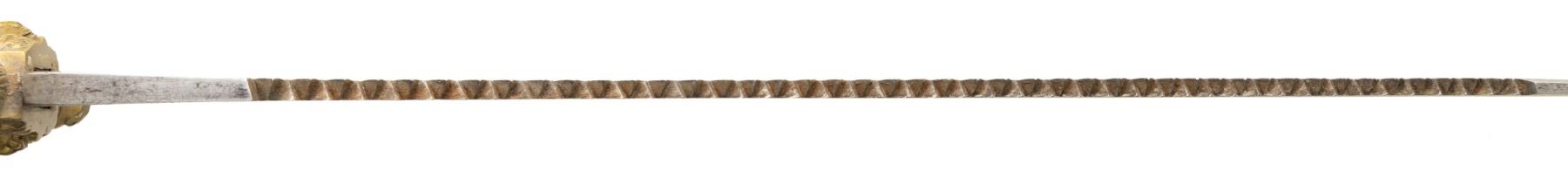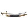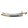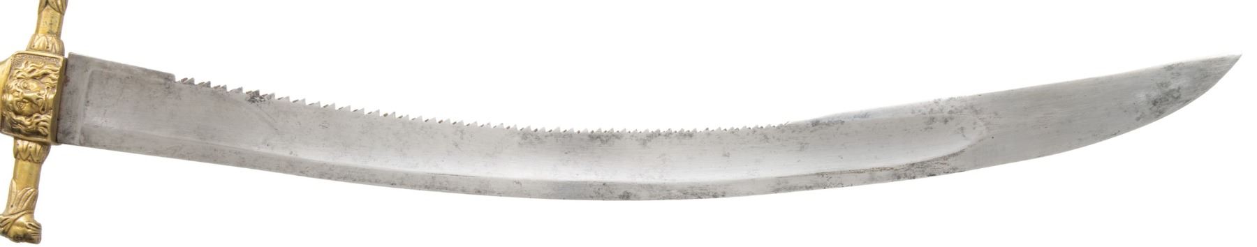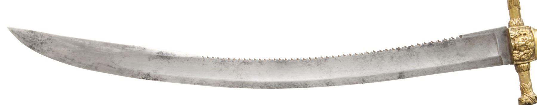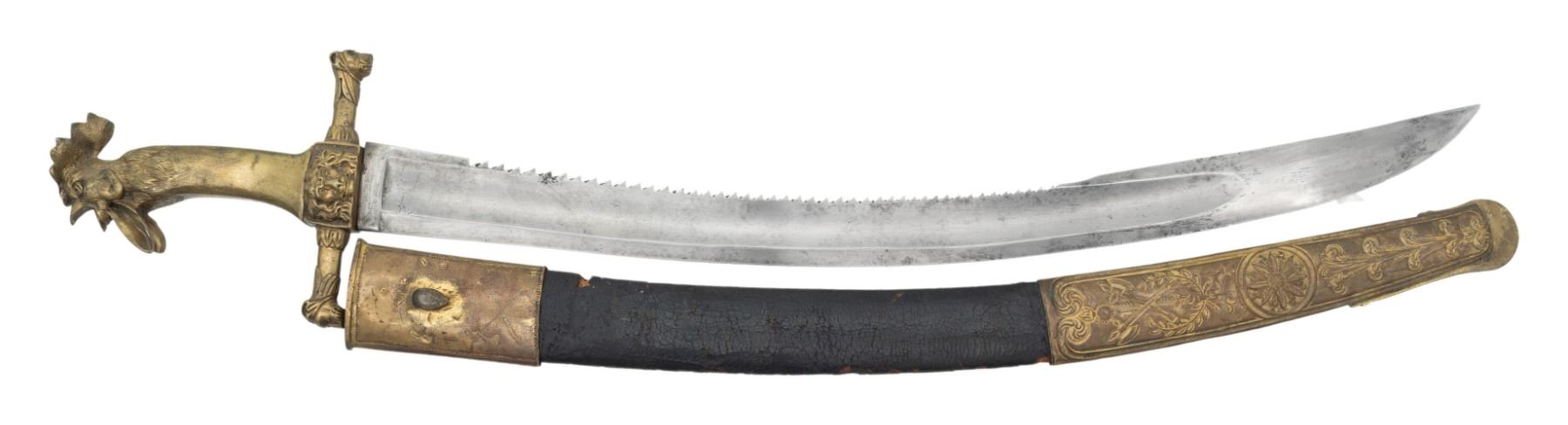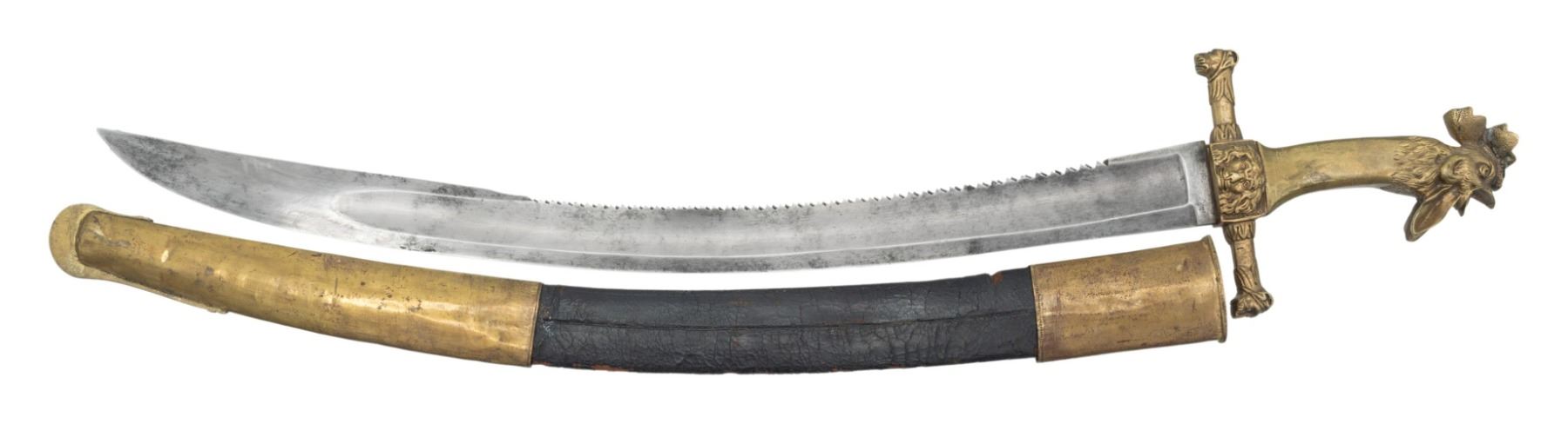 SWORD.This heavy and flamboyant sword is 35 1/4" overall with a 26 3/4" plain swept blade with a sawtooth spine. Heavy brass hilt with a monumental crossguard featuring lion head quillons. Between the two quillons are rectangular panels displaying the head of a lion. Plain integral grip with a particularly evocative crowing rooster head pommel. Gilded brass mounted leather scabbard with an elliptical frog's stud on the throat, just above crossed axes. The large 12" tip and drag features exceptionally elaborate repousse work on the front that includes crossed axes with a sword and various foliate motifs. CONDITION: blade has an overall light gray clean patina. Entire hilt has a mellow mustard patina. Scabbard mounts retain approx 30% of their original gilded finish. Leather is dried and flaked but remains solid. (02-25835/BF). NON-GUN. $1,500-2,500.