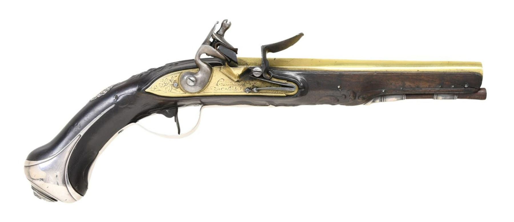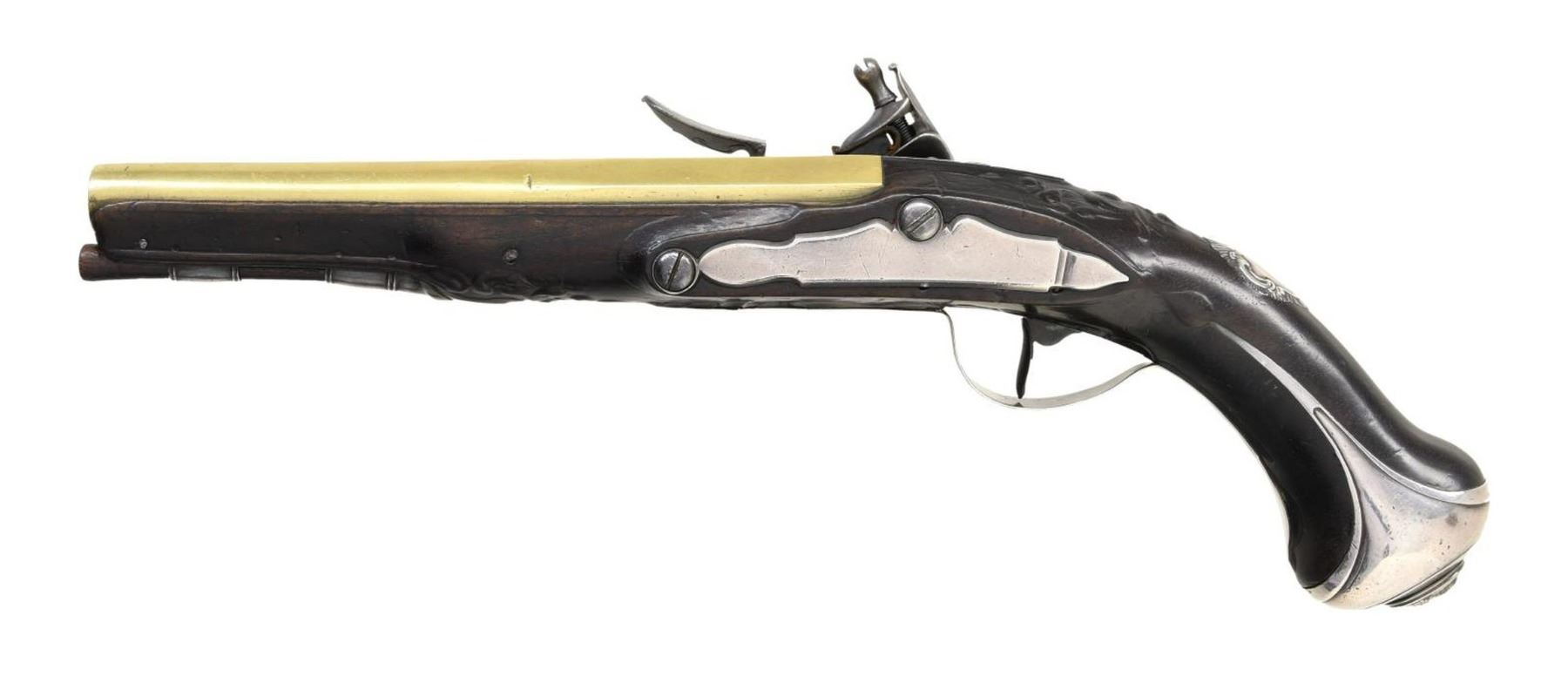 Cal. 54. NSN. Bbl. 7 3/8" brass part oct. part rnd. Brass lock is marked "CASSAIGNARD A NANTES". Bbl. top also marked "CASSAIGNARD". Cassaignard was active from 1708 to 1786 and made pistols for the French Navy. Iron hammer & frizzen. Silver-plated sideplate, trigger guard, wrist decoration, & grip cap. Lock is functional when hand-cycled. Hardwood stock w/ hardwood ramrod secured by a silver thimble and a pipe. Stock has decorative floral carving, and the bottom of the grip cap has decoration. CONDITION: stock has an older added finish with a crack at the front right edge, scattered chips, dings, & handling wear. Brass parts appear cleaned with scattered scratches, dings, & oxidation. Iron parts have a dull gray patina w/ scattered oxidation. Silver-plated parts appear cleaned w/ dings, scratches, some oxidation, & some pitting. Smoothbore shows scattered oxidation and some pitting. PROVENANCE: from the Lifelong Collection of Robert "Mike" Bricker. (01-24989/MJC). ANTIQUE. $700-900.