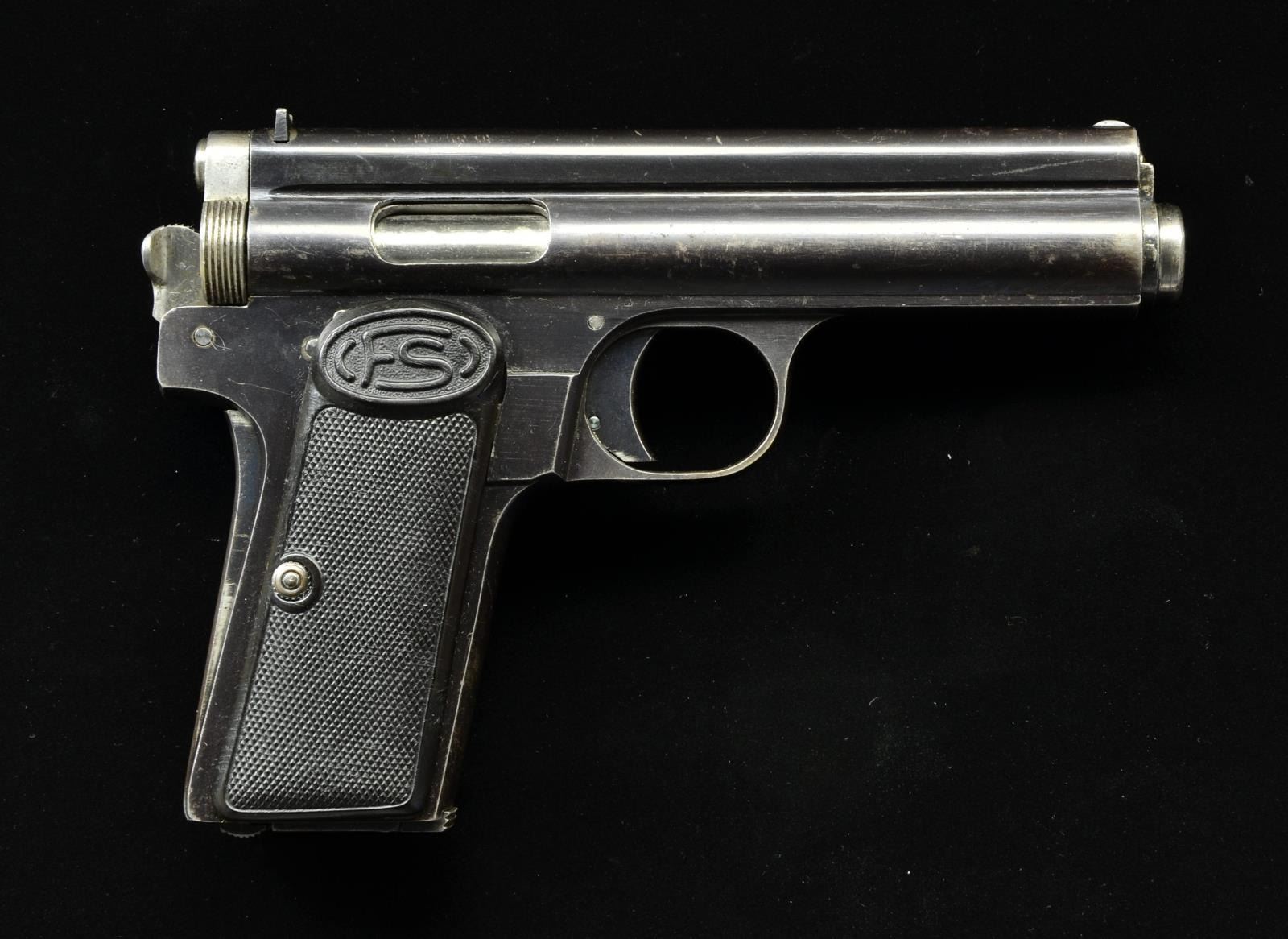 Cal. 7.65mm (32 ACP). S# 77402. Bbl. 3 7/8". Mfg. 1912-1920 w/ recoil spring assembly above bbl. which reduces felt recoil. Fixed sights & external hammer w/ unusual side gripping tabs. Grip safety only. Border checkered hard rubber grips w/ FS logos at top. MAGS: 1 very good factory marked 7 rd.; 6 rd. versions also produced. CONDITION: very good appearance w/ some occasional peppery oxidation, function wear & slight high point wear. Right grip very good, left has area above grip screw that appears to have been subjected to heat. Missing lanyard loop. Very good bore w/ light frosting. PROVENANCE: Estate Collection of Kenneth Horn (Grandson of JC Higgins). (22-470/NW). CURIO. $350-500.