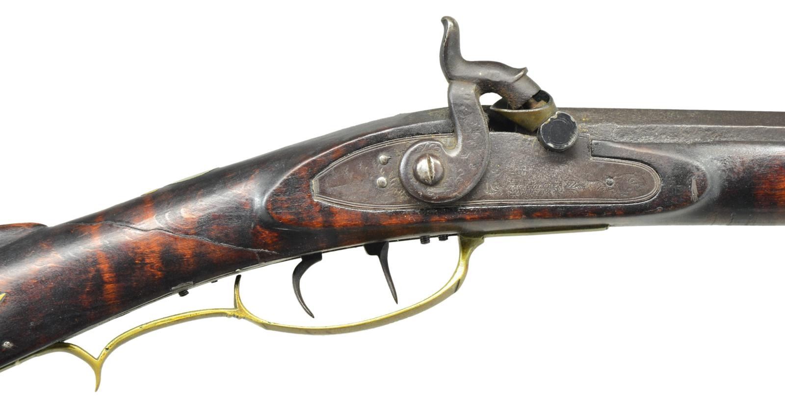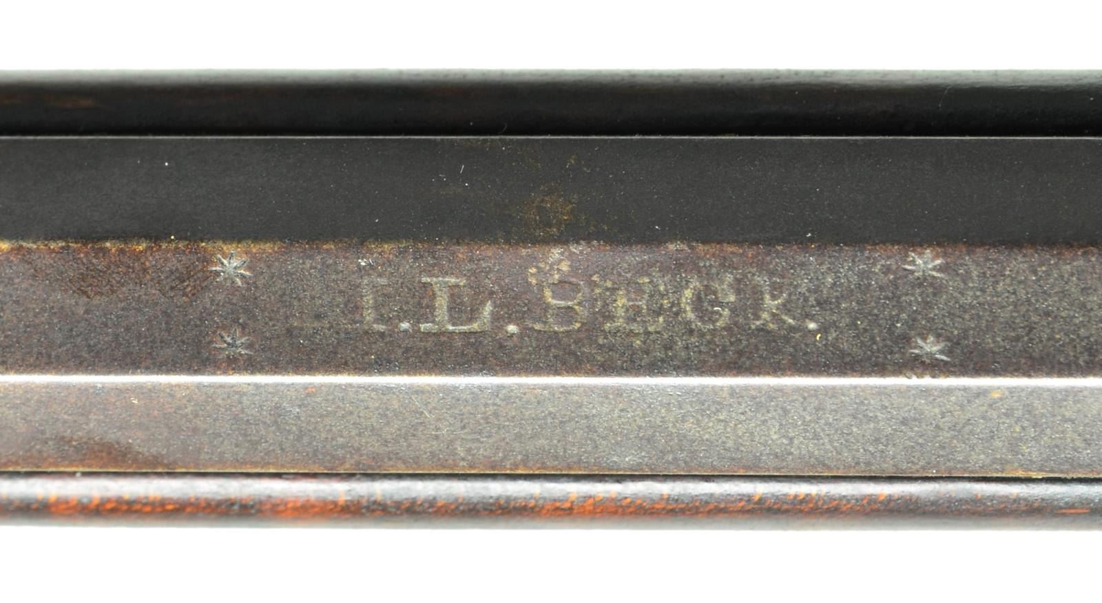BECK. Cal. 38. NSN. The 36 5/8" slim octagon bbl. is fitted w/ U-notch rear & brass blade front sights. Top flat stamped "I. L. Beck" w/ 2 stars at each end (Isaac L. Beck working 1835-40 in Mifflinburg, PA). Trade percussion lock by Golcher has stamp in engraving at tail & on flat faced serpentine hammer. Rifle fitted w/ dbl. set triggers. Full stock appears to be of quilted figure cherry & extends to muzzle w/ 1 1/2" brass cap & pinned to bbl. Brass furniture includes faceted trigger guard w/ spur forming grip. Crescent buttplate has 4" return, & simple rectangular patchbox has 2 tapered sideplates & pierced finial. Lock sideplate is lozenge shaped. A German silver oval at top of grip is engraved "E" & a vacant oval is on face of sm. cheekpiece. Hickory ramrod is held by 2 beaded pipes & matching thimble. CONDITION: good. Iron parts retaining nearly all attractive brown patina, brass nicely toned. Wood refinished w/ edges somewhat rounded. Bore is very good w/ strong rifling, a bit dark. Lock & triggers work. Stock shows old repair through wrist w/ rivets evident at top of grip. PROVENANCE: Collection of Dr. John Persing. (01-19614/MGM). ANTIQUE. $1,500-2,500.