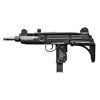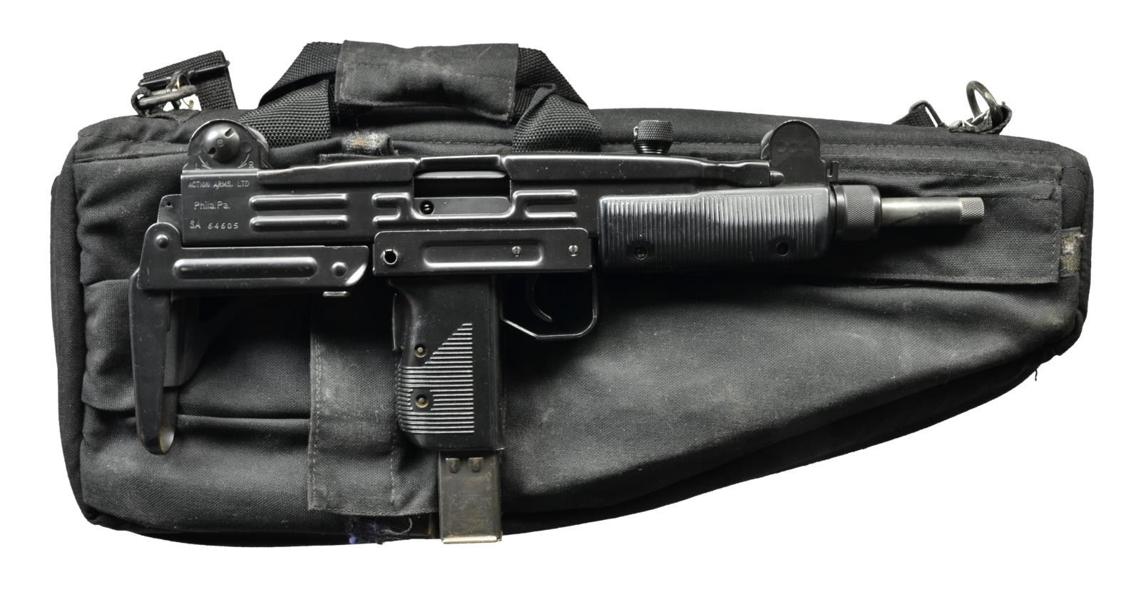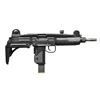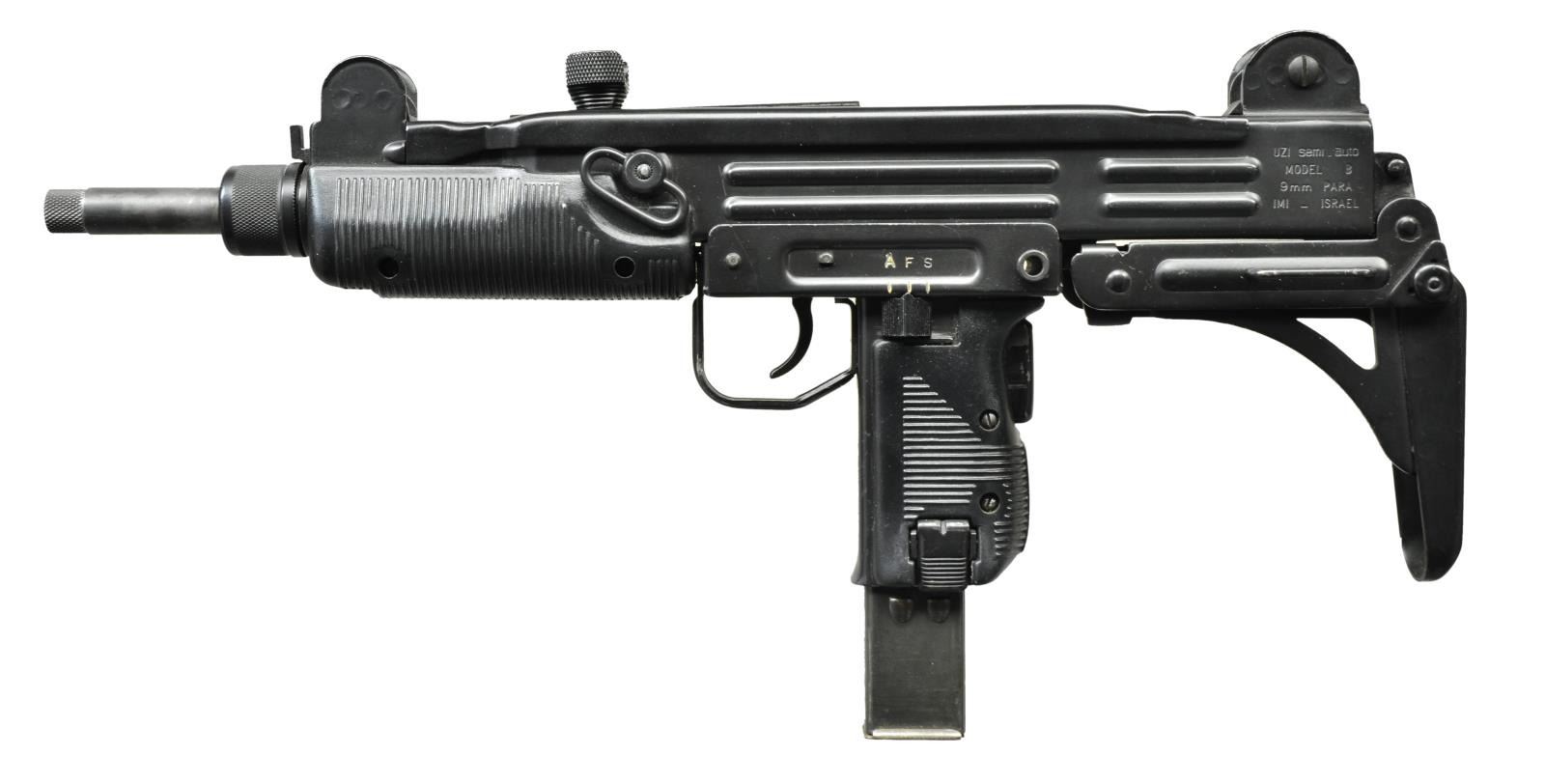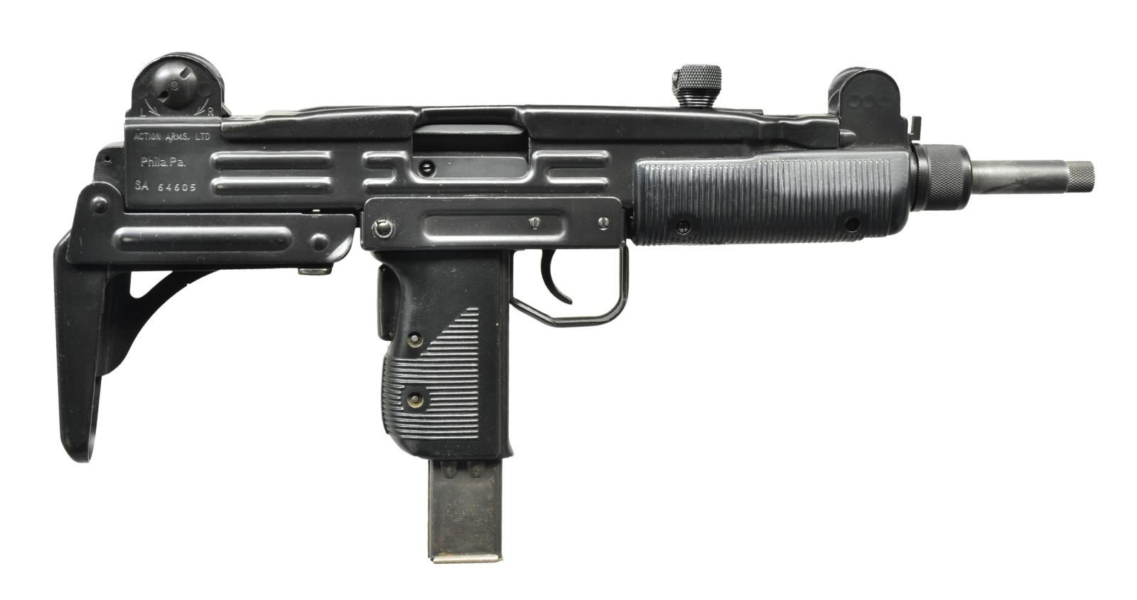 UZI SMG. Cal. 9mm. S# SA64065 (XO-0035). Bbl. 10". An original UZI Model B initially mfg. as a semi-automatic carbine later converted to a select fire SMG utilizing an X-Ring registered bolt (S# XO-0035). The original platform was available in several calibers, but the vast majority were offered in 9mm parabellum. Open bolt, select fire mechanism that is light years ahead of its technology when it comes to use, it can be utilized in its collapsed, concealable configuration, yet takes only moments to extend the rear stock w/ a simple slap of the control hand pulling it into its extended position. The Uzi bbl. only appears to be a couple inches in length which greatly minimizes its signature for use in tight quarters, but because of the ingenious design it actually extends back inside of the bolt giving the operator over 10 inches of rifled bbl. to increase hit probability immensely. Its ratcheting top cover is an important safety factor when utilizing an open bolt mechanism. Those that are familiar w/ the 1911 family of firearms will appreciate the grip safety integrated into the mechanism. This particular example has black plastic furniture. Bottom front mounted bayonet lug. Sling swivels on left side of receiver & stock. Elevation adj. protected post front sight. Dual aperture rear sight. Left side markings “A-F-S” above safety/selector. Left rear receiver markings “UZI semi_auto / MODEL B / 9mm PARA / IMI_ISRAEL”. Right side receiver markings include S# SA 64605 & “ACTION ARMS, LTD. / Phile. PA”. Bbl. appears to be threaded 1/2x28 w/ a knurled thread protector. MAGS: 2-25 rd. parkerized stick mags. UNATTACHED ACCESSORIES: mag. loader & Assault Systems nylon transport case. CONDITION: all exposed metal surfaces are black painted in what appears to be factory finish. Stock locks tight & positive in both open & closed position. Fire control mechanism appears to function correctly when cycled by hand, shiny bore w/ strong rifling. There appears to be a ring approx. 3 1/2” from the bore w/ a corresponding slight bulge that can be felt but is difficult to see externally, indicating possibly a squib load at some point. NATIONAL FIREARMS ACT MG REQUIRING BATF TRANSFER BEFORE TAKING POSSESSION. FULLY TRANSFERABLE. (03-1532 & 22-265/JZ). MODERN CLASS III. $6,000-10,000.