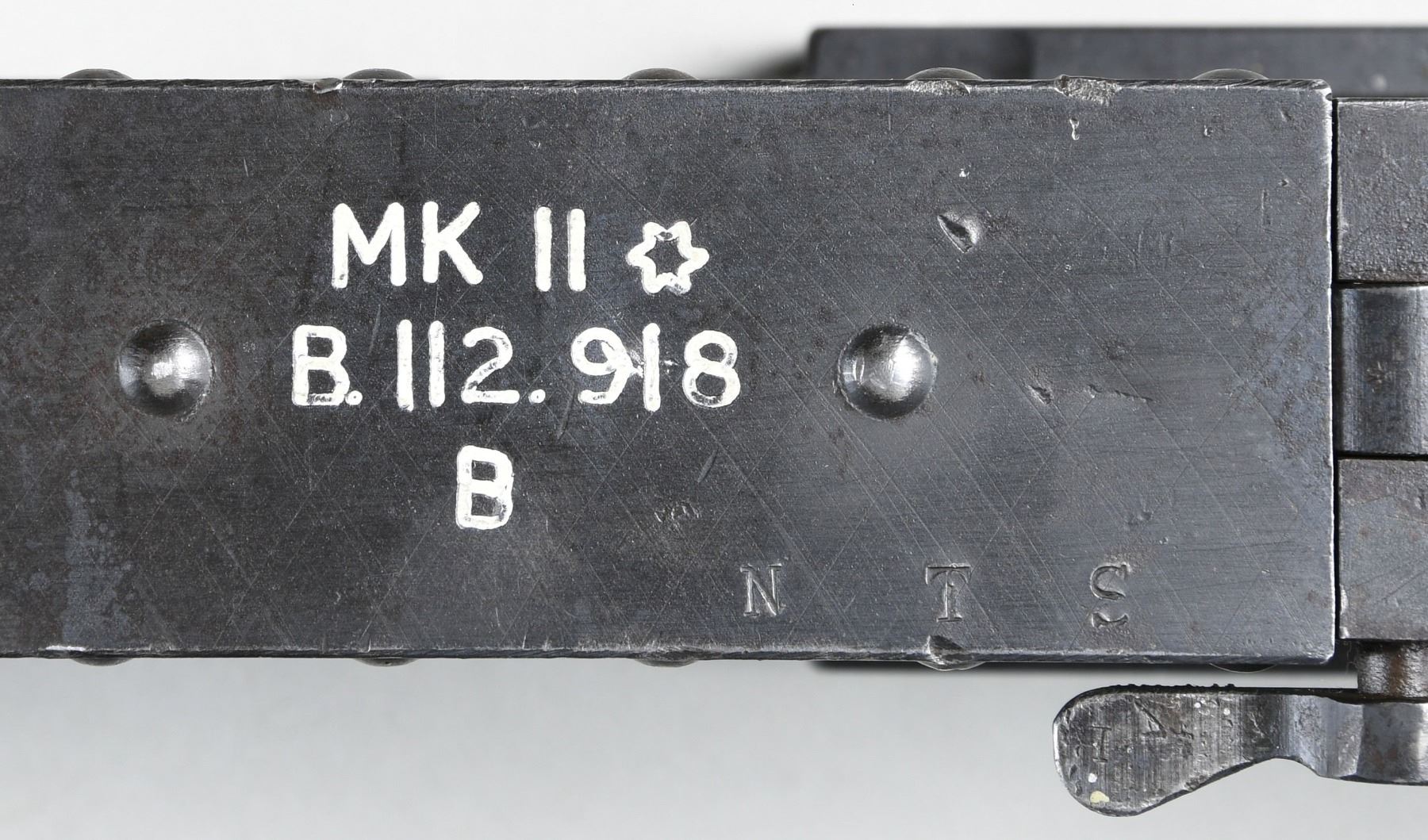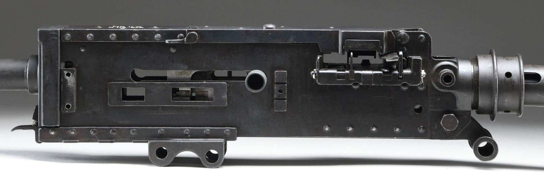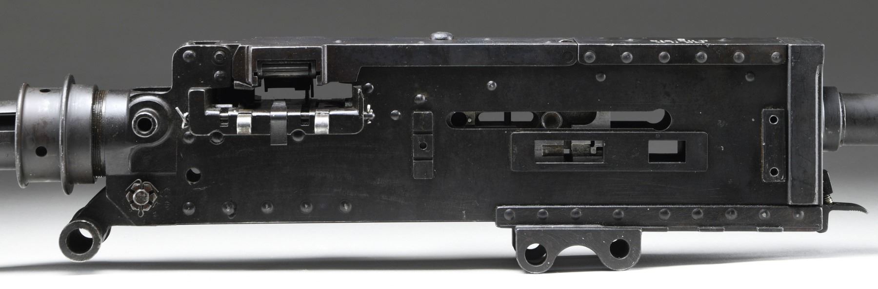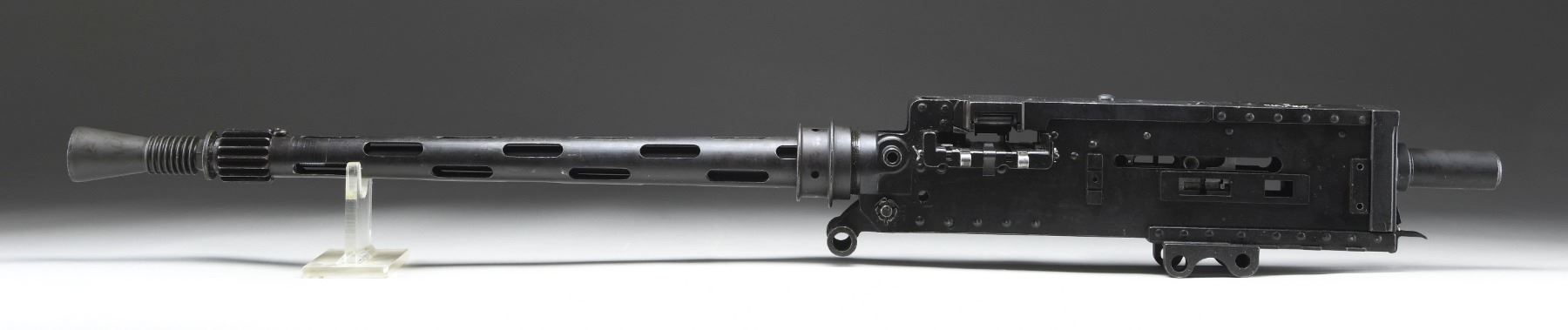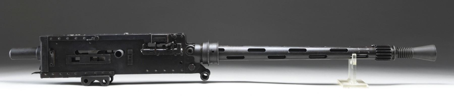 (FLEX) HEAVY MACHINE GUN. CURIO. Cal. 303. S# B112918. Bbl. 24". A British Aircraft version of the Browning machine gun. The MKII, chambered in .303 British, was the standard aircraft gun used by the British in WWII. Heavily modified from the early 1930 pattern, belt fed, Colt Browning machine gun, the British redesigned their MKII to fire from an open bolt. It had an incredibly high rate of fire compared to the much more common Browning family of belt feeds. It currently utilizes a short buffer tube w/ an exposed trigger & is configured for left hand feed, though it is convertible to right or left. It also has present a duel pistol grip mechanism (unattached) as well as the original style external pull charging handle mechanism. US 30-06 links maybe used to feed the MKII though they must undergo a large amount of modification first. It is perhaps easiest fed when utilizing the cloth US 30-06 belt. In order to utilize this aircraft gun in a ground mount capacity it is cocked utilizing a stubby short charging handle on the right side of the gun, while RAF gunners had the luxury of utilizing a cable based charging system for official use. The barrel jacket is slotted for cooling & it is currently equipped w/ the special MKII flash hider. The sight front sight is an exposed, hi-rise front pin (unattached). Finish on all exterior metal surfaces is dark & parkerized. MAGS: 1 new US cloth belt. UNATTACHED ACCESSORIES: D-style duel rear pistol grip assembly, external pull rod charger & tall front sight. CONDITION: this is an uncommon & desirable WWII machine gun to find in the United States. A C&R transferable example that is as at home on a firing line w/ its incredibly high cyclic rate as it is in the collections & museums where they often reside. The parkerized finish coverage is quite complete w/ some thinning, primarily in areas of mechanical intervention & scattered patina throughout. Barrel jacket appears to have been welded / repaired at some point, forward of the front trunnion. The original markings are deep, bold & easy to read, filled w/ white for a sharp contrast. Bore is descent & retains extremely strong rifling. Barrel appears too tight in its relationship to the barrel jacket & is hindering smooth operation when cycled by hand. THIS IS A NATIONAL FIRARMS ACT LMG REQUIRING BATF TRANSFER BEFORE TAKING POSSESSION. FULLY TRANSFERABLE. PROVENANCE: From the Lifelong Collection of Brian Linde. (03-1820/JZ). CURIO. CLASS III. $8,000-12,000.