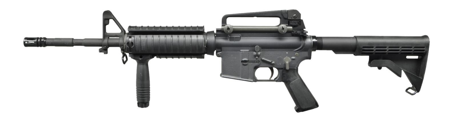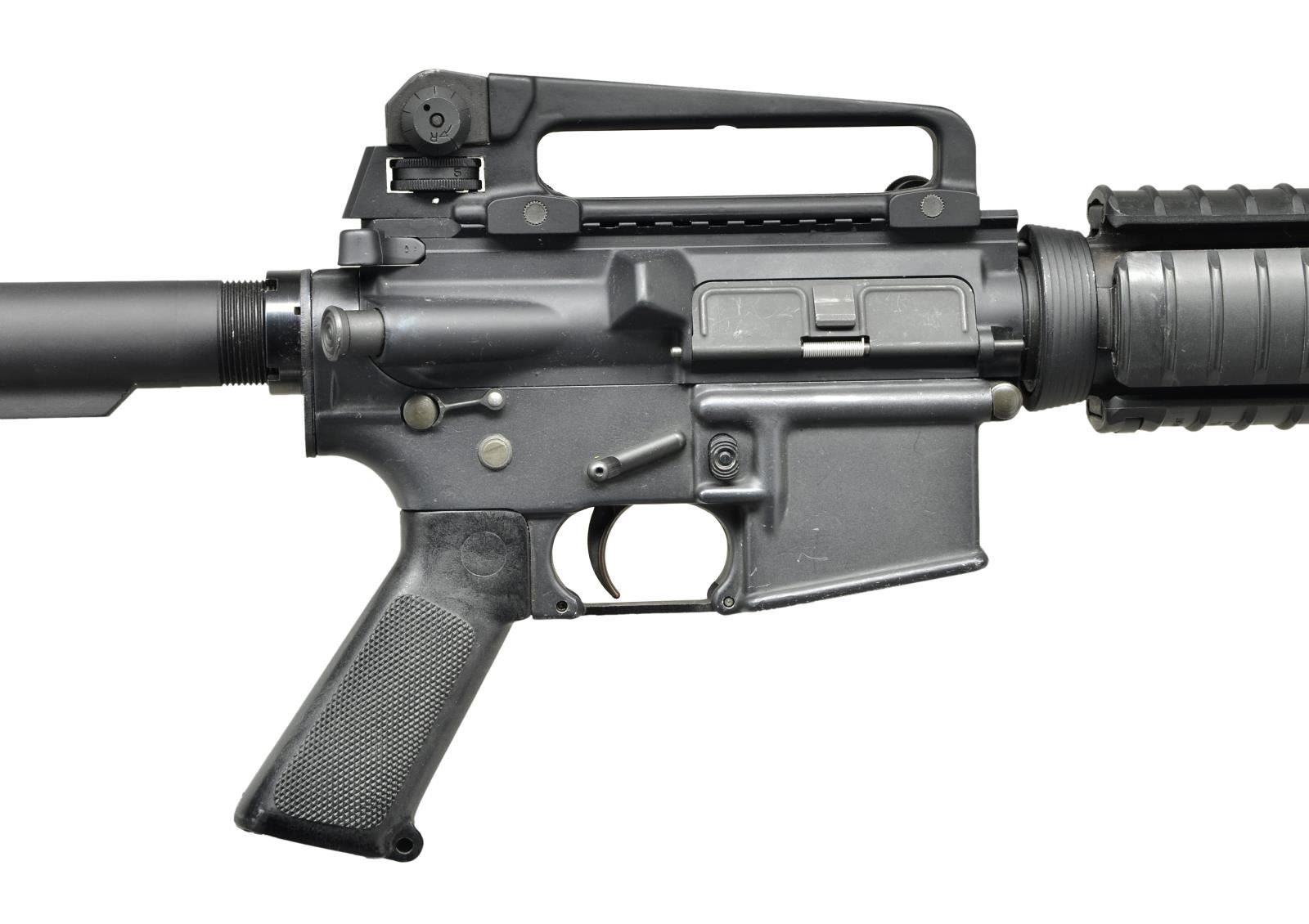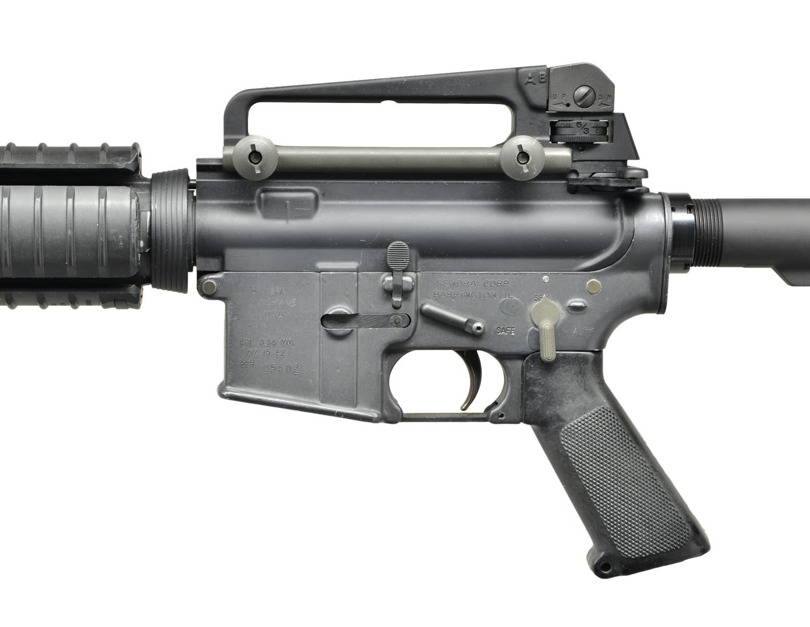 SELECT FIRE RIFLE. Cal. 5.56mm. S# 05602. Bbl.14.5" M4 profile, marked "BMP 5.56 NATO 1/9". Threaded muzzle terminated w/ A2 style flash hider. Protected post front sight / gas block / bayonet lug w/ sling swivel. Quad rail handguard secured w/ tapered delta ring. Currently wearing Knight's Armament rail covers w/ vertical pistol grip. Flat top upper receiver w/ round forward assist, brass deflector & dust cover. Removable carry handle w/ dual aperture sights adjustable for windage & elevation. Sendra lower receiver remanufactured by Bushmaster in Windham, ME. 7 position collapsible stock. Milspec trigger group / sear. CONDITION: finish enjoys complete coverage though illustrates normal handling marks associated w/ recreational shooting. Lower receiver finish is a lighter gray than darker black upper receiver which is common w/ this era rifles. Bright bore w/ descent rifling. Fire control mechanism appears to function correctly when cycled by hand. NATIONAL FIREARMS ACT MG REQUIRING BATF TRANSFER BEFORE TAKING POSSESSION. FULLY TRANSFERABLE. (03-1606/JZ). MODERN CLASS III. $12,000-16,000.