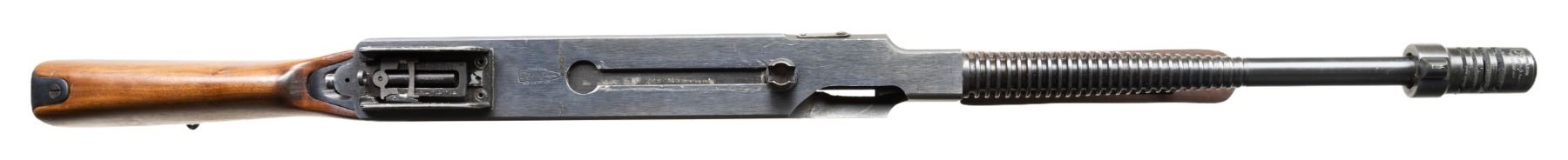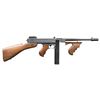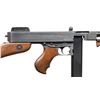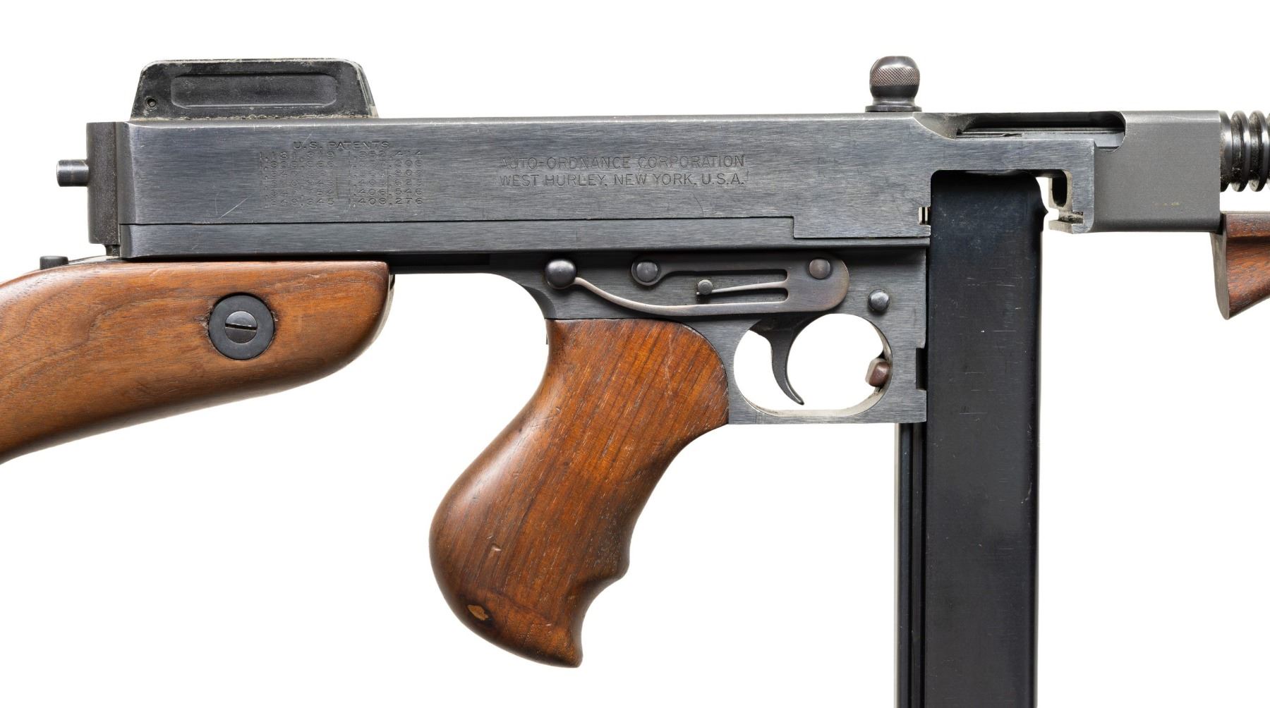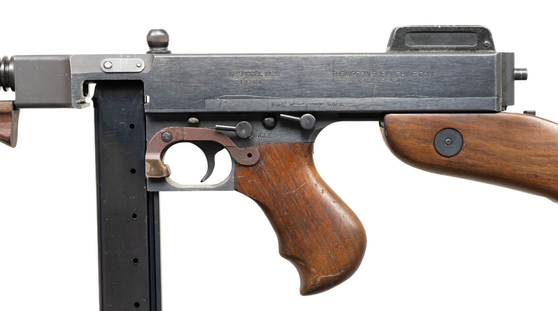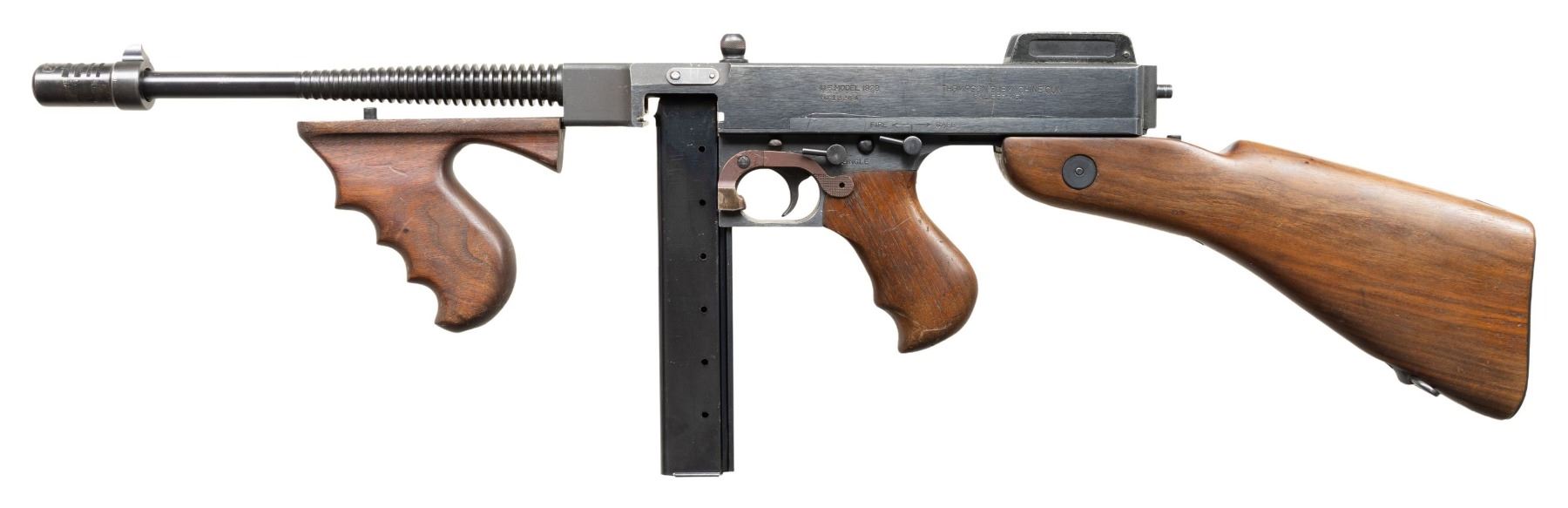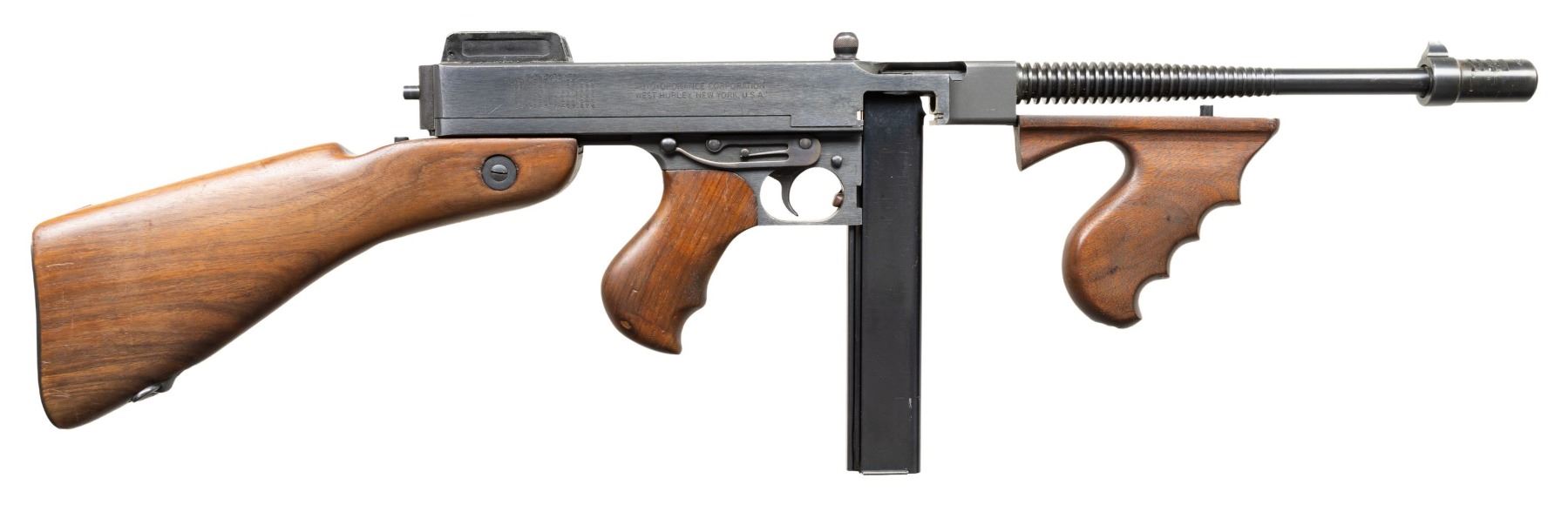 THOMPSON SUBMACHINE GUN. Cal. 45 ACP S#1326A. Bbl 10 1/2" with Thompson trademarked Cutts compensator and cooling fins. Quality machined receiver with Thompson trademark on the top and 2 line West Hurly address on the right side. Dove tailed blade front sight. Folding ladder peep rear sight gradated to 600 yards. Walnut pistol grip, forearm & quick detachable buttstock. MAGS: 1-30 Round Seymour. CONDITION: overall good original blued finish with some scratches, handling marks and cycle wear. Furniture has a few scattered dings and scratches. Frosted bore with some wear to the rifling and a pitted ring at mid point. PROVENANCE: Military Museum Collection of Shooters Outpost, Hooksett NH. NATIONAL FIREARMS ACT MG REQUIRING BATF TRANSFER BEFORE TAKING POSSESSION. FULLY TRANSFERABLE. (03-1985/ZAL). CURIO. CLASS III. $18,000-22,000.