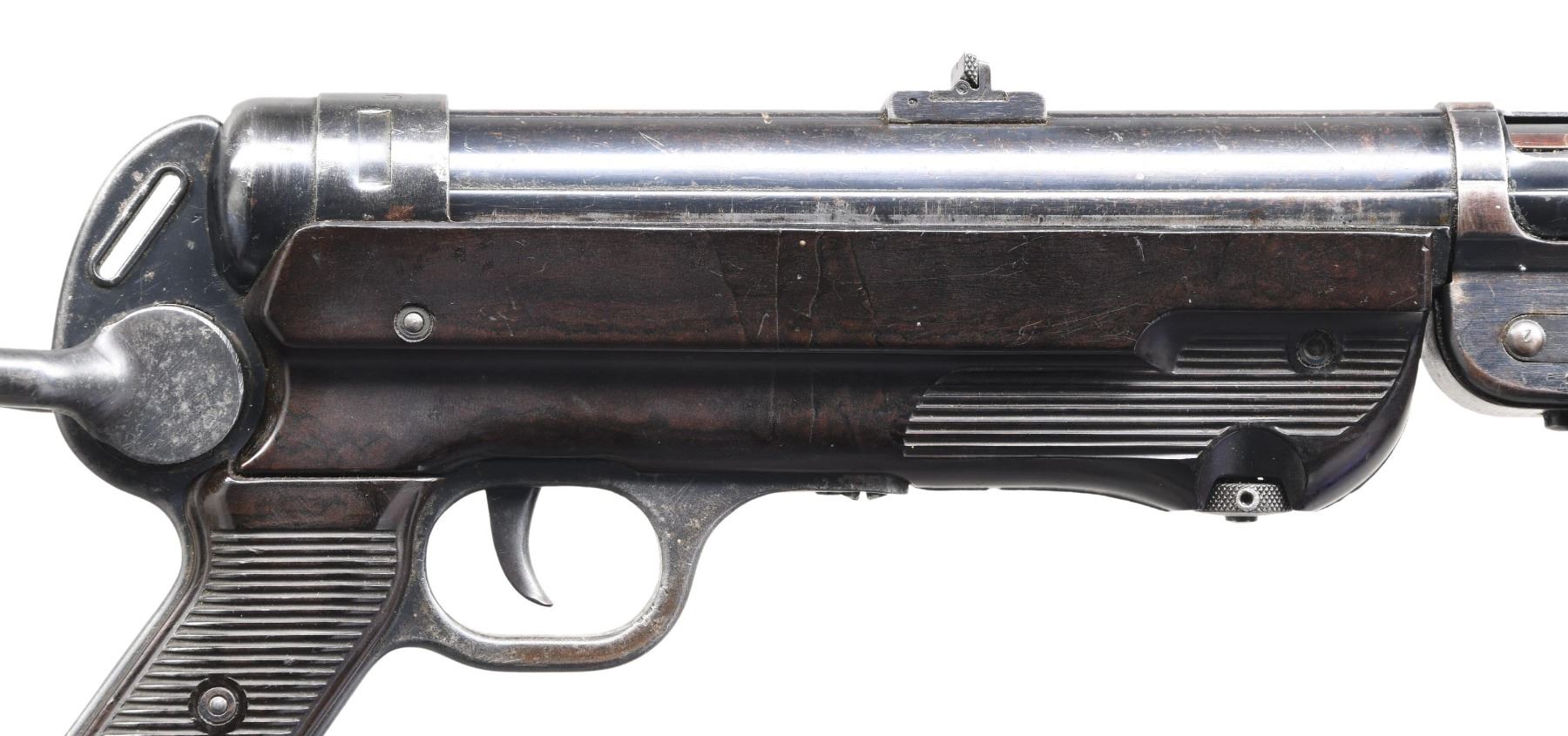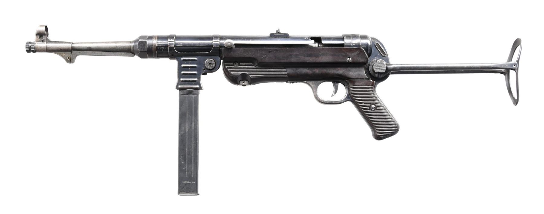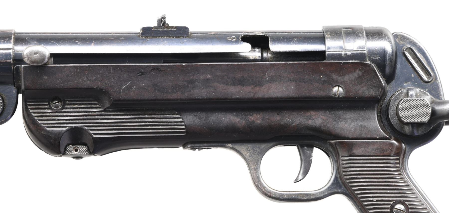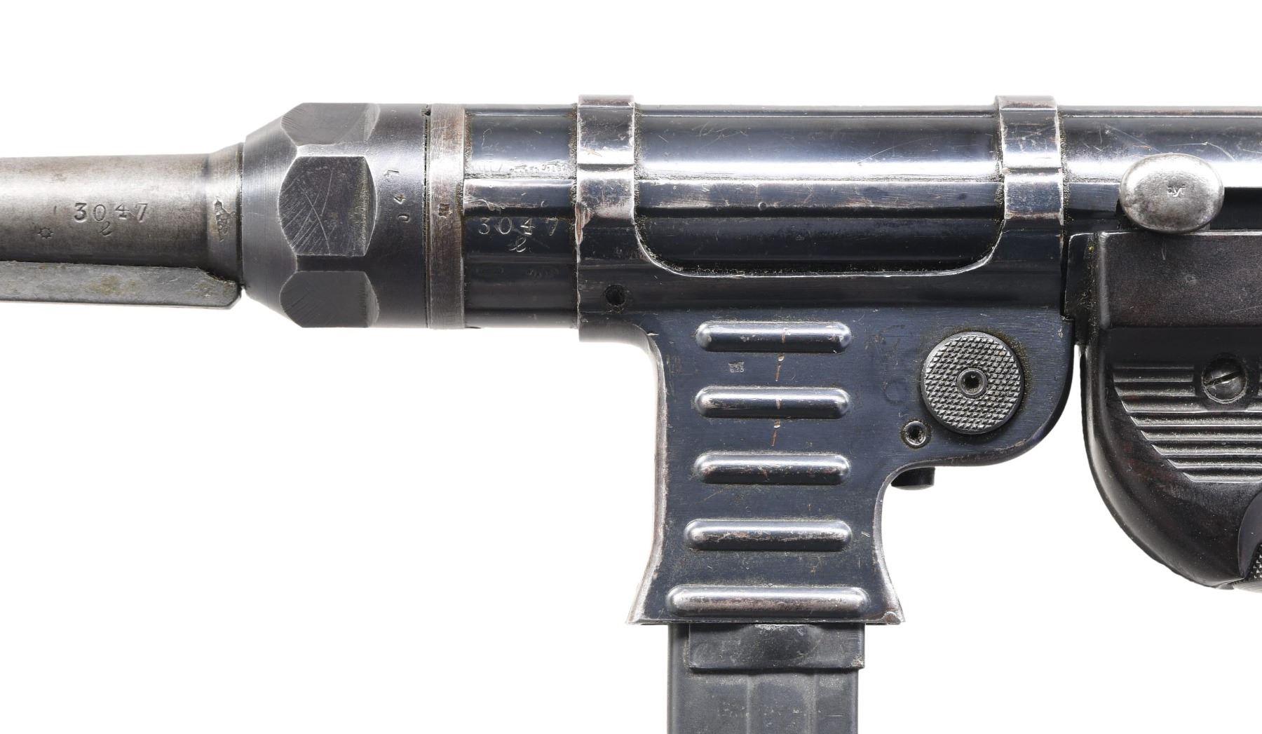 GERMAN STEYR-KRUPP MP40 SMG. Cal. 9mm. S# 3047. Bbl. 9 9/10". Hooded fixed blade front sight. Dual leaf rear sight is windage drift adj. Of all the German WWII era SMGs, the MP40 may be the most iconic of them all. Its slow cyclic rate combined w/ decent sights & pleasant ergonomics make it as fun to operate as it is interesting to look at. It utilizes a very simplistic, yet incredibly smooth open bolt firing mechanism. The recoil system is typical of German over engineering consisting of a 3 piece telescoping rod w/ a captured spring that doubles as the connection point for the firing pin which slides inside of the bolt. The safety mechanism is an extremely simple design which shares commonalties w/ other WWII era SMGs. It consists of a rearward notch that interfaces w/ the cocking handle holding the bolt to the rear. Manufactured by Steyr , utilizing parts from Krupp as a subcontractor. This MP40 utilizes a third generation mag. housing which includes the ribs for strength & square notch facing the shooter. All visibly numbered parts share matching numbers which is incredibly desirable & increasingly rare these days. The extruded receiver tube matches the grip frame, barrel, trigger housing, stock, bolt, bbl. nut, rear sight, front sight, resting bar & even the firing pin. Waffenamts appear on multiple parts including rear receiver just above folding stock mechanism "WaA254", front sight mechanism just forward of resting bar is also Eagle "623", front of receiver tube just rear of bbl. nut Eagle w/ "WaA623", which are correct Steyr stampings. Under folding stock, dark brown Bakelite grips & lower receiver cover. Original numbered resting bar is present. MAGS: 1 WWII era 32 rd. CONDITION: .Original finish on tube complete & consistent w/ thinning on high spots & in areas of mechanical intervention. Barrel finish mostly faded to gray. Stock locks tight & remains firm as intended in both folded & extended positions. Grips appear in nice condition free of any obvious structural damage beyond some light handling marks under close examination. Bakelite receiver has typical use marks w/ a few very light scratches Bright bore w/ strong rifling. Fire control mechanism appears to function correctly when cycled by hand. THIS IS A NATIONAL FIREARMS ACT CURIO & RELIC MACHINE GUN REQUIRING BATF TRANSFER BEFORE TAKING POSSESSION. FULLY TRANSFERABLE. (03-1749/JZ). CURIO, CLASS III. $19,000-28,000.