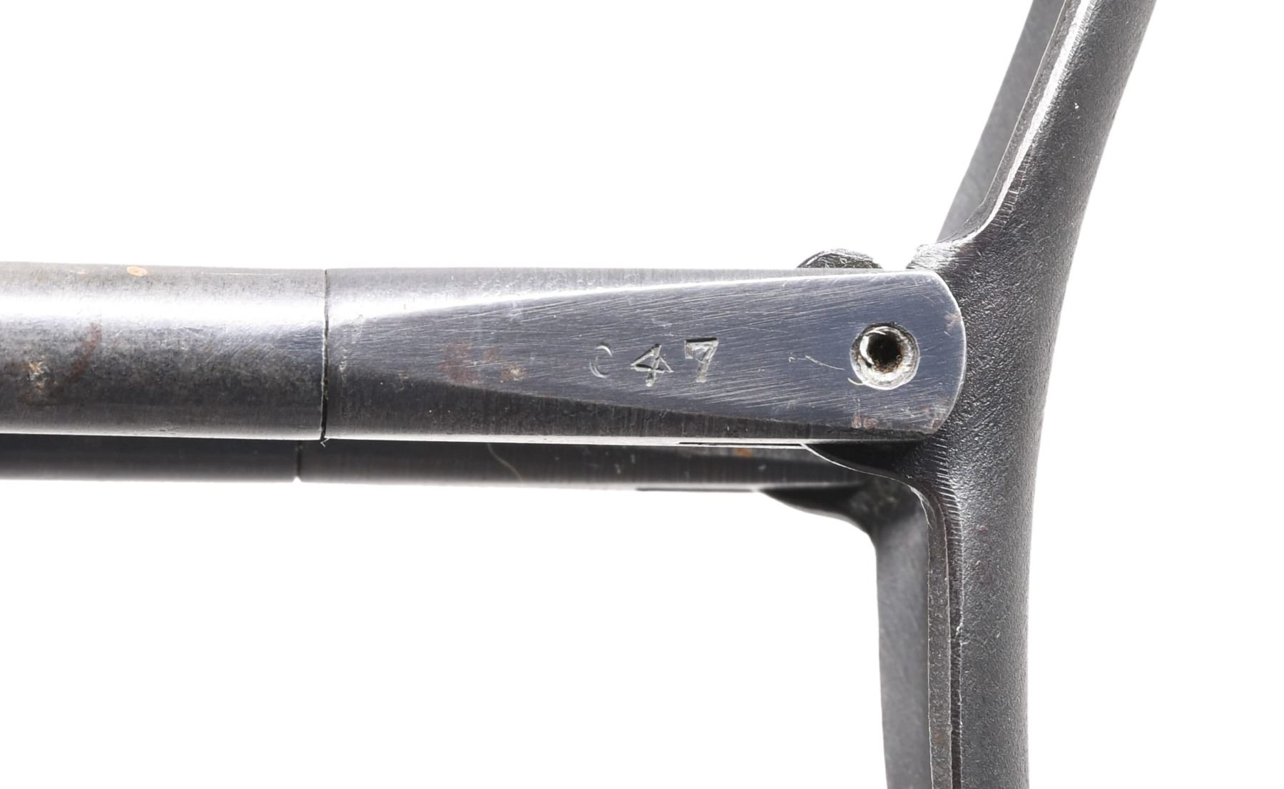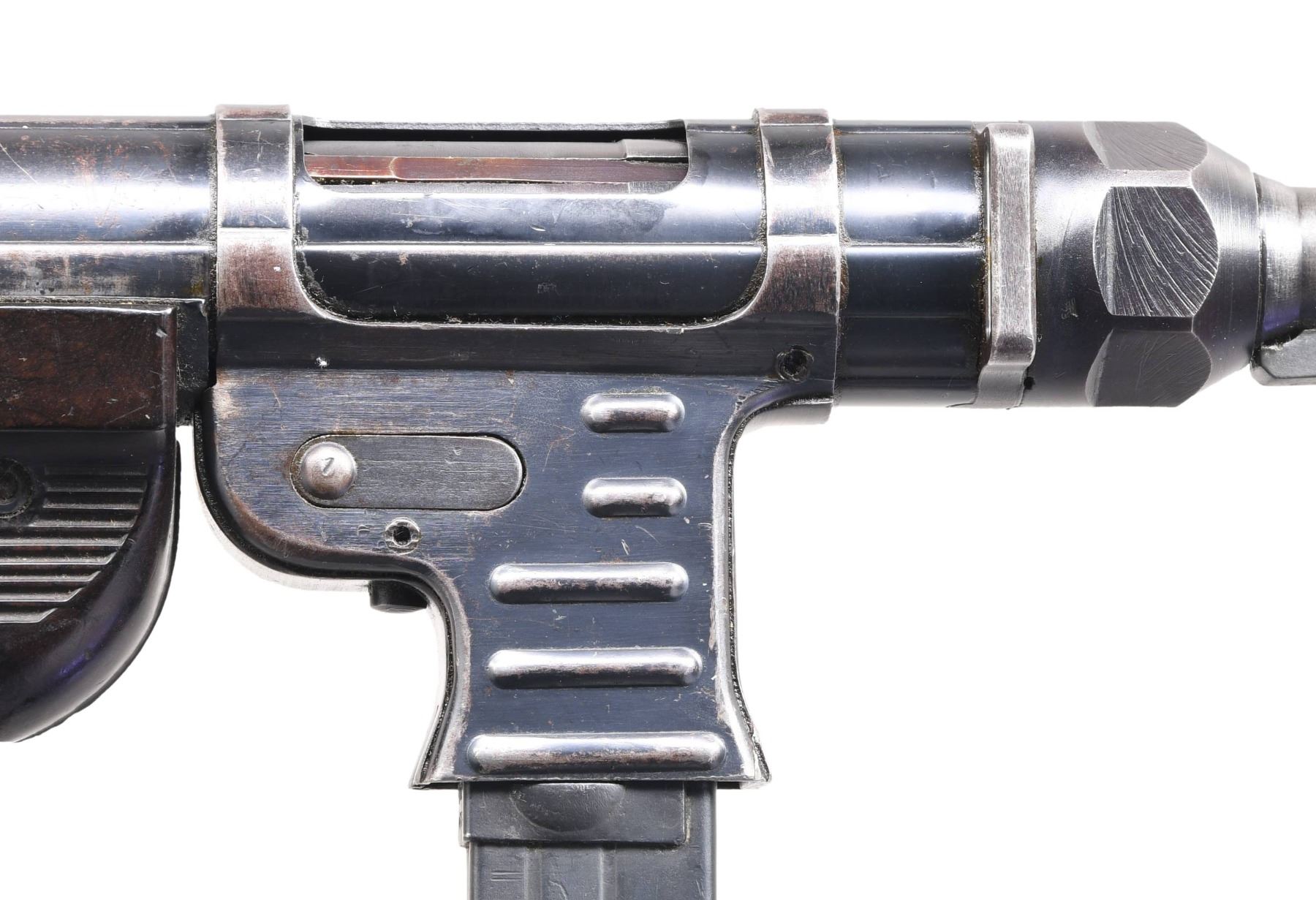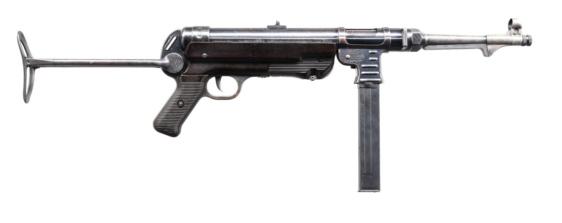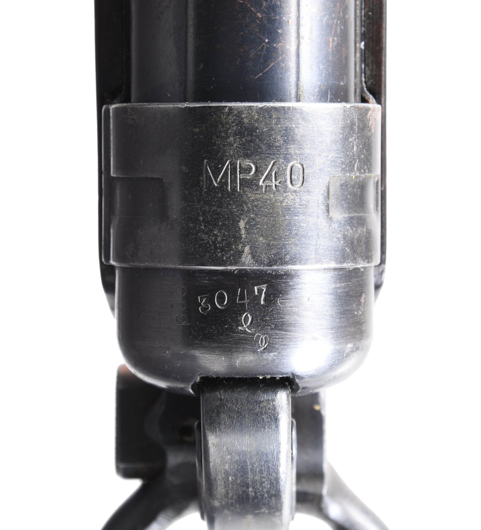 GERMAN STEYR-KRUPP MP40 SMG. Cal. 9mm. S# 3047. Bbl. 9 9/10". Hooded fixed blade front sight. Dual leaf rear sight is windage drift adj. Of all the German WWII era SMGs, the MP40 may be the most iconic of them all. Its slow cyclic rate combined w/ decent sights & pleasant ergonomics make it as fun to operate as it is interesting to look at. It utilizes a very simplistic, yet incredibly smooth open bolt firing mechanism. The recoil system is typical of German over engineering consisting of a 3 piece telescoping rod w/ a captured spring that doubles as the connection point for the firing pin which slides inside of the bolt. The safety mechanism is an extremely simple design which shares commonalties w/ other WWII era SMGs. It consists of a rearward notch that interfaces w/ the cocking handle holding the bolt to the rear. Manufactured by Steyr , utilizing parts from Krupp as a subcontractor. This MP40 utilizes a third generation mag. housing which includes the ribs for strength & square notch facing the shooter. All visibly numbered parts share matching numbers which is incredibly desirable & increasingly rare these days. The extruded receiver tube matches the grip frame, barrel, trigger housing, stock, bolt, bbl. nut, rear sight, front sight, resting bar & even the firing pin. Waffenamts appear on multiple parts including rear receiver just above folding stock mechanism "WaA254", front sight mechanism just forward of resting bar is also Eagle "623", front of receiver tube just rear of bbl. nut Eagle w/ "WaA623", which are correct Steyr stampings. Under folding stock, dark brown Bakelite grips & lower receiver cover. Original numbered resting bar is present. MAGS: 1 WWII era 32 rd. CONDITION: .Original finish on tube complete & consistent w/ thinning on high spots & in areas of mechanical intervention. Barrel finish mostly faded to gray. Stock locks tight & remains firm as intended in both folded & extended positions. Grips appear in nice condition free of any obvious structural damage beyond some light handling marks under close examination. Bakelite receiver has typical use marks w/ a few very light scratches Bright bore w/ strong rifling. Fire control mechanism appears to function correctly when cycled by hand. THIS IS A NATIONAL FIREARMS ACT CURIO & RELIC MACHINE GUN REQUIRING BATF TRANSFER BEFORE TAKING POSSESSION. FULLY TRANSFERABLE. (03-1749/JZ). CURIO, CLASS III. $19,000-28,000.