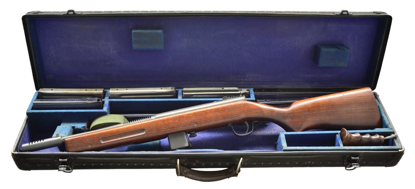 Cal. 45 ACP. S# 114126. Bbl. 13.5" over comp. Barrel w/ 14 fins. In a search for another compact SMG as things were heating up in Europe in 1939, Eugene Reising went to work designing what we would eventually know as the Reising Model 50. He received a patent on his compact, closed bolt carbine, chambered in .45ACP in June of 1940, and entered into a manufacturing contract with Harrington & Richardson to facilitate production. It didn’t have many competitors, as the only similar firearm was the Thompson SMG, but the Reising Model 50 was extremely accurate since it fired from a closed bolt. After submission for testing with the US Army, it was not immediately accepted since its same closed bolt mechanism that provided superior accuracy had a tendency to malfunction when not cleaned and maintained regularly. Since the Thompson SMG faced a shortage, the United States Marine Corps adopted the Reising Model 50 with a parkerized finish, cooling fins, a muzzle device to assist with recoil and with select-fire capability. They then requested a modified version for the “Para Marines” that utilized a folding wire stock in a pistol grip design, and without the muzzle device. It was known as the Reising Model 55 and shared by the Tank crews. This example, the Model 50 is a select fire, closed bolt sub machine gun. It has a 20rd mag-well with 14 cooling fins and a 6 slot muzzle device. Exposed metal surfaces are finished in a smooth, even gray parkerizing. Full length wooden stock. Graduated elevation adjustable rear peep sight & drift windage adjustable front post sight incorporated into the muzzle device. Receiver is stamped on top “MODEL 50 – H.&R. REISING – CAL .45 / HARRINGTON AND RICHARDSON ARMS CO. / WORCESTER, MASS. U.S.A. PAT PENDING”. Left side of receiver punch marked "NHP" in 1/2" letters. Barrel marked w/ "Flaming bomb" ordnance mark forward of receiver. The bottom of the pistol grip has the number "3" stamped & stenciled. MAGS: 7 total mags, including 3 H&R 12rd., 2 H&R 20rd. & 3 modified 30rd. Grease Gun mags. UNATTACHED ACCESSORIES: black hard case with fitted blue felt interior, green canvas sling, vertical pistol grip . CONDITION: finish coverage complete & consistent w/ very little sign of wear in any capacity. Markings are clear & crisp. Stock has typical dings & impressions often earned in rack storage. Fire control mechanism appears to function correctly when cycled by hand. Bright bore w/ very strong rifling. NATIONAL FIREARMS ACT MG REQUIRING BATF TRANSFER BEFORE TAKING POSSESSION. FULLY TRANSFERABLE. (03-1598/JZ). CLASS III CURIO. $6,000-9,000.