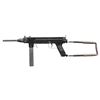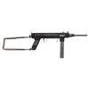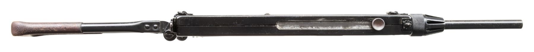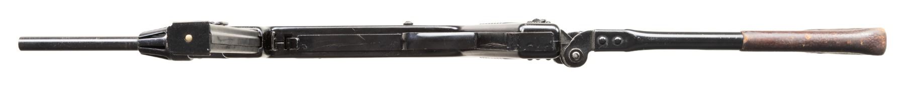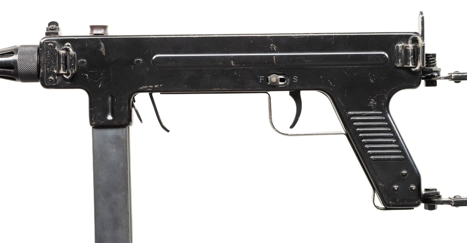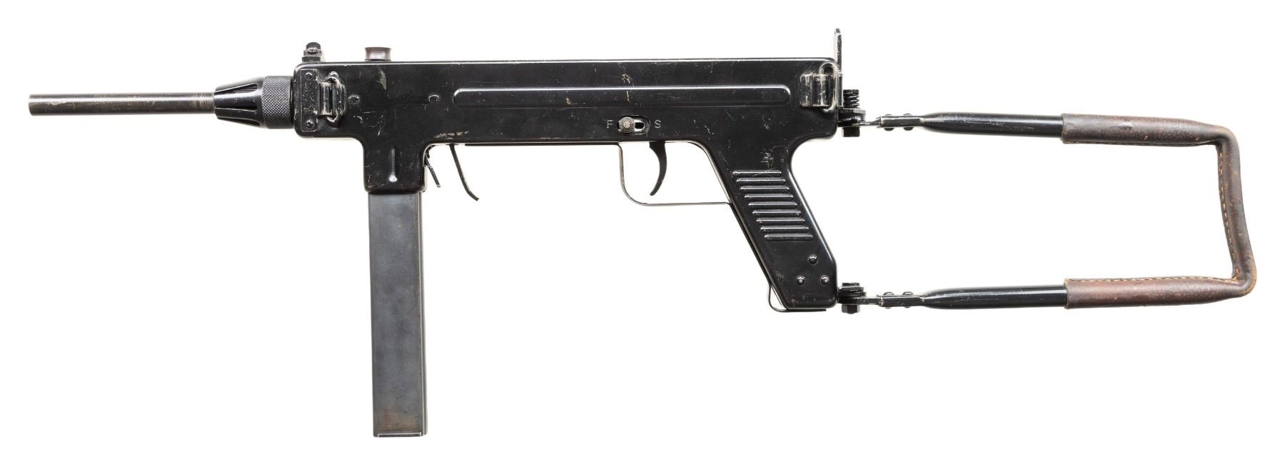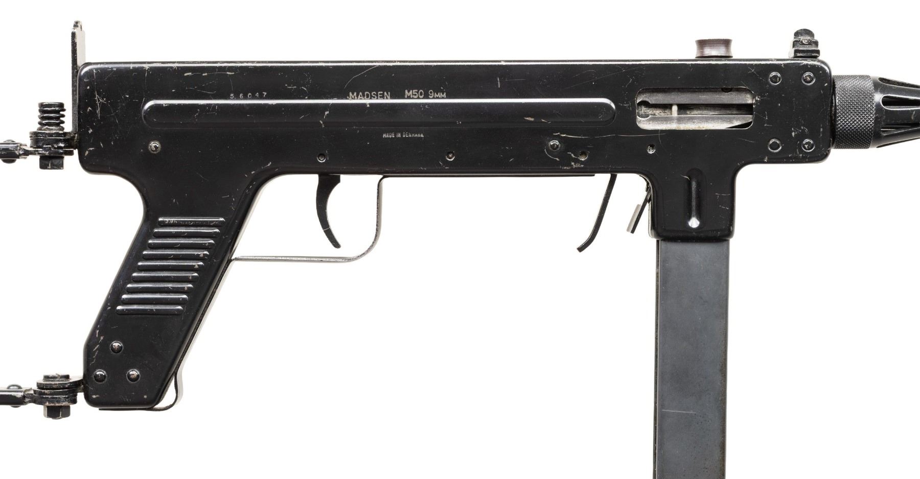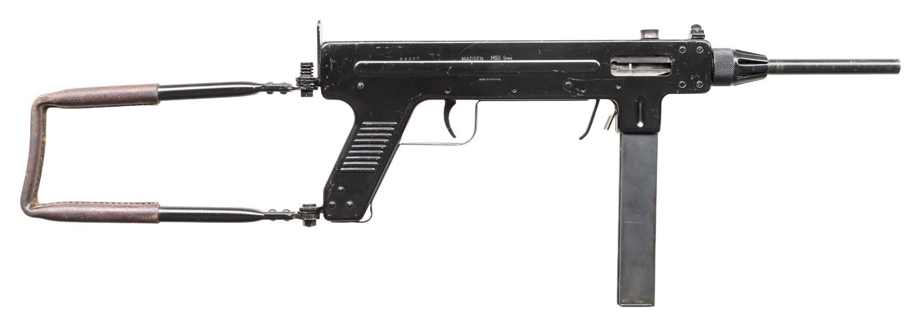 GUN. CURIO. Cal. 9mm Luger. S#56047. Bbl 8" with dove tailed blade front sight, fixed peep sight. These interesting SMG's were assembled from 2 separate stamped steel paths that are hinged at the rear of the receiver and fastened in the fore section with a fluted barrel nut. Nearly entirely manufactured from stamped sheet metal with right side folding wire type stock. Grip safety located behind magazine well and Left side mounted swing swing swivels. Right side of the receiver is marked " Madsen M50 9mm/ Made in Denmark". MAGS: 1-30 Round. CONDITION: Overall very fine original black enamel type finish with scattered scratches and handling marks. Leather wire stock cover has light creasing and wear. Nice bore with good rifling. PROVENANCE: Military Museum Collection of Shooters Outpost, Hooksett NH. NATIONAL FIREARMS ACT MG REQUIRING BATF TRANSFER BEFORE TAKING POSSESSION. FULLY TRANSFERABLE. (03-1988/ZAL). CURIO. CLASS III. $18,000-22,000.