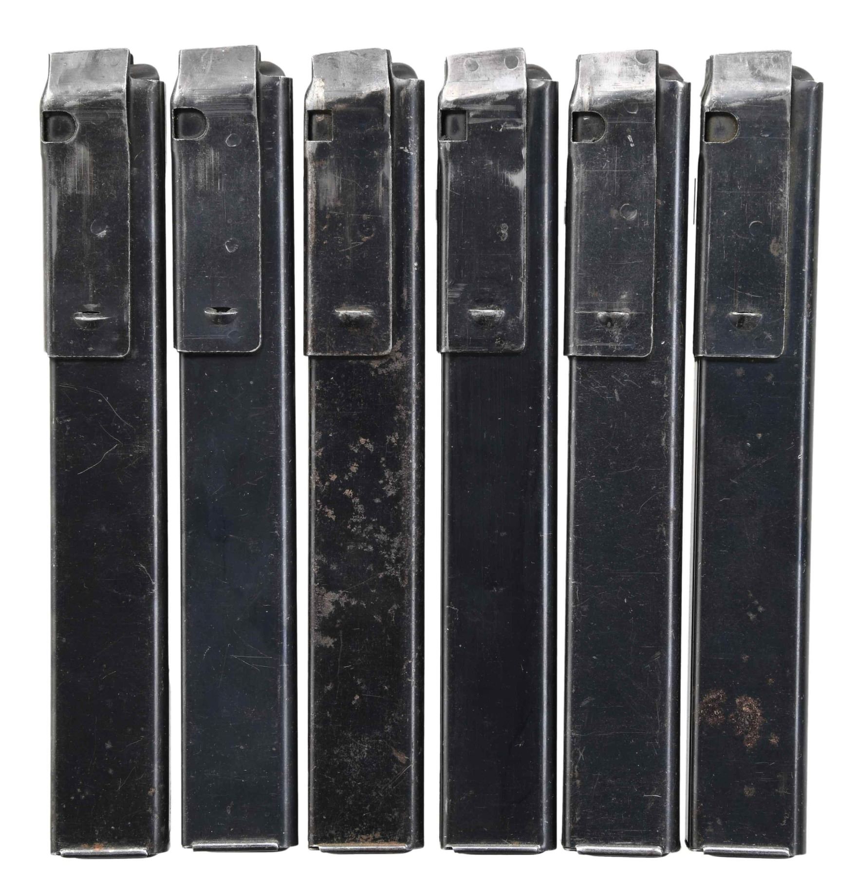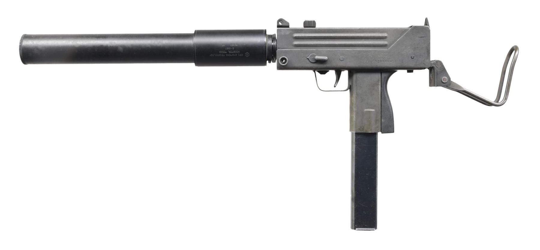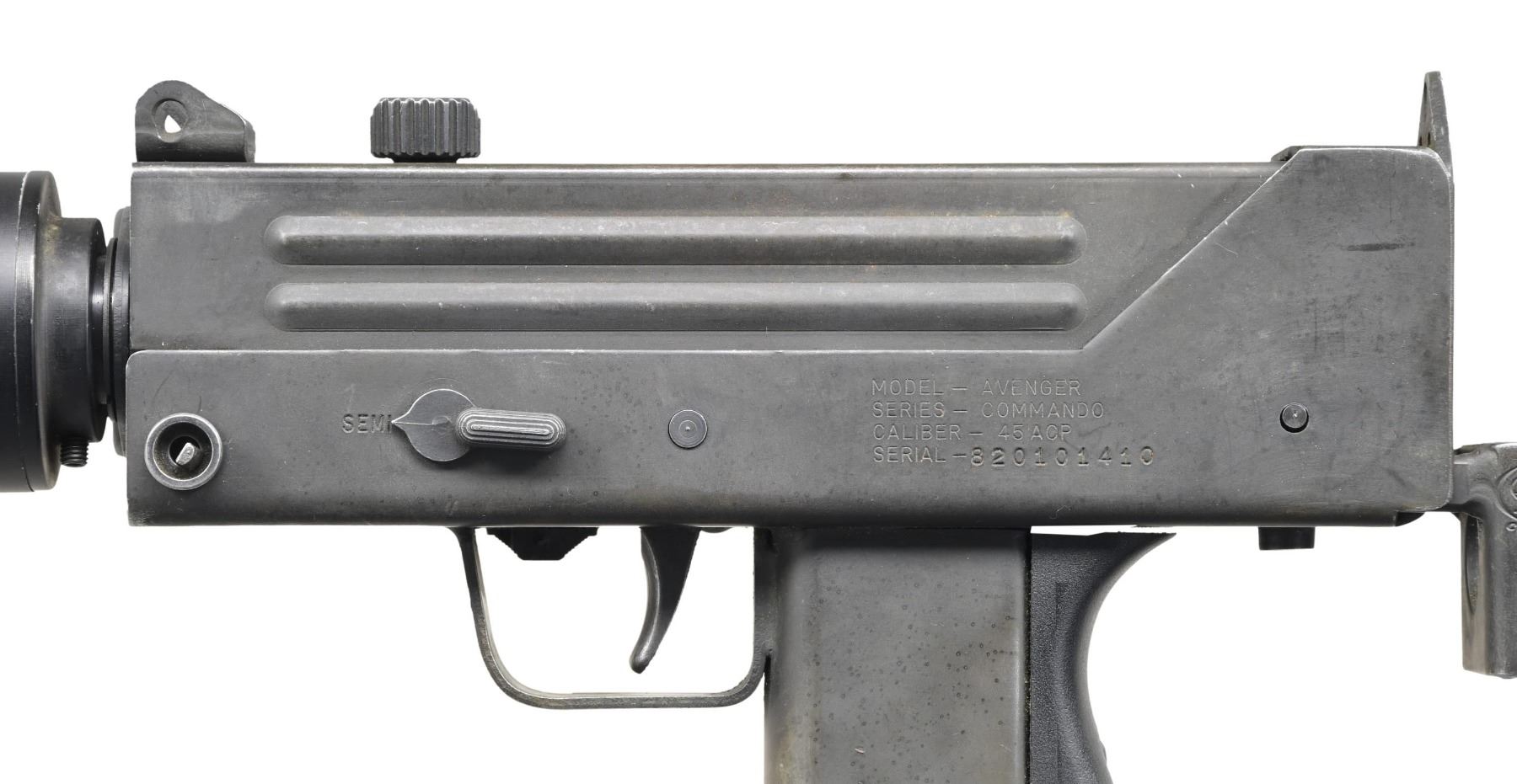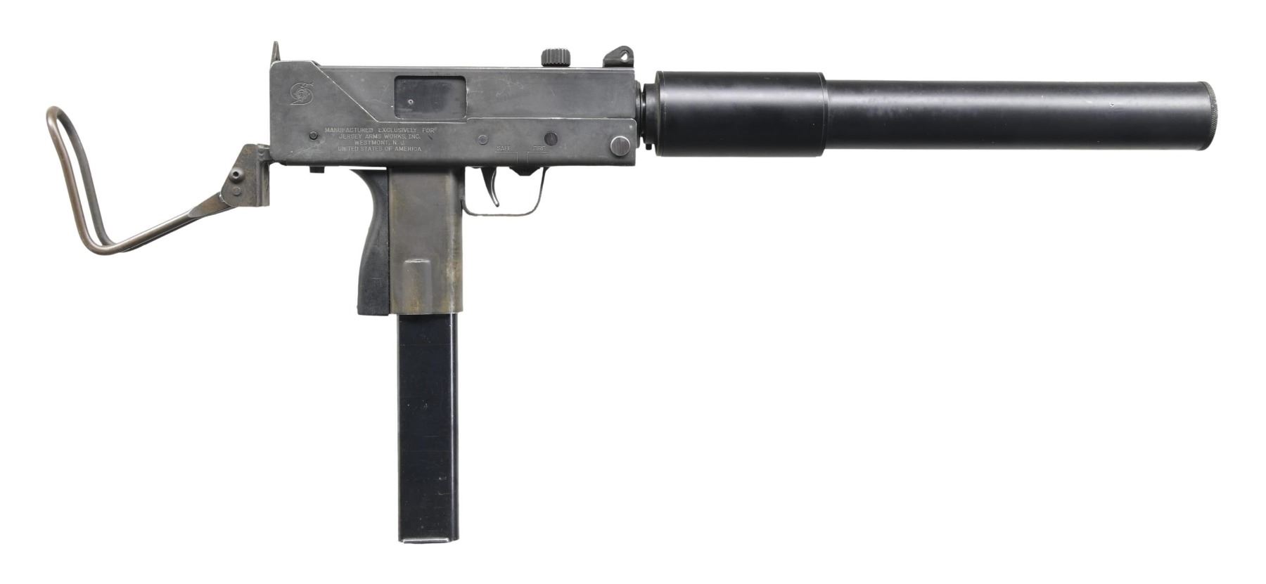 JERSEY ARMS AVENGER COMMANDO SMG. Cal. 45. S# 820101410 Gun / S# S1367. Bbl. 6". There are very few firearms that conjure up the imagination of the general public more than the mere mention of the MAC 10. The Ingram Model 10 was originally designed in 1964. It would become the 1st of many sm. simplistic SMGs to contrast the expensive & labor intensive earlier variants such as the Thompson & Reising M50. Ingram’s 2 basic guidelines while designing the Model 10 "simple & cheap" while remaining effective & reliable. Made famous mostly by Hollywood, the M10 had appearances on the silver screen & on television eventually earning the infamous title of "The Gun That Made The 80’s Roar" starting w/ John Wayne utilizing a suppressed 9mm M10 in the 1974 movie "McQ". A favorite example used by the organized anti-gun movement, the Mac 10 was eventually, incorrectly & inaccurately synonymous w/ every crime committed for a long period of time. Here we have an interesting variant by Hatton Industries, manufactured in 1982 exclusively for Jersey Arms Works. There were a total of only 520 units made, so it is one of the rarest of the transferable M10 family. They bear the Cobray logo on both the upper & lower receivers & were all chambered in 45 ACP. Protected post fixed front sight & rear peep sight that is integral w/ the receiver. Select fire, open bolt, blowback action. Selector on left side of receiver. Safety inside trigger guard. Black phosphate finished & designed to utilize the original M3 "Grease Gun" magazines. Receiver markings include the following; Right side - "MANUFACTURED EXCLUSIVELY FOR / JERSEY ARMS WORKS, INC. / WESTMONT, N.J. / UNITED STATES OF AMERICA" along w/ the Cobray logo. On the left side marked - "MODEL - AVENGER / SERIES - COMMANDO / CALIBER - 45 ACP" & serial number. Shoulder stock slides out to the rear when employed, w/ a folding metal wire extension which folds up & over the receiver when not in use to keep the slim, concealable profile. MAGS: 7 steel 30 rd. metal grease gun style mags, 2 bearing the Cobray logo. Black nylon hanger strap in front of receiver. Also included is an AWC Systems Technology M10A3, 2 chamber sound suppressor measuring 14" in length w/ an outside diameter of 1.73" & 2.12". UNATTACHED ACCESSORIES: Black plastic, foam lined case. CONDITION: exposed metal surfaces on M10 enjoy a parkerized finish w/ complete coverage. Some light thinning on grip & high spots w/ normal recreational range wear. Suppressor coverage complete w/ little outward sign of use. Collapsible wire stock locks tightly in both open & closed positions as does the folding shoulder section. Bore is bright w/ strong rifling. Fire control mechanism appears to function correctly when cycled by hand. NATIONAL FIREARMS ACT MG & SUPPRESSOR, EACH REQUIRING BATF TRANSFERS BEFORE TAKING POSSESSION. FULLY TRANSFERABLE. (03-1760 / 03-1761/JZ). MODERN. CLASS III. $7,000-10,000.