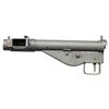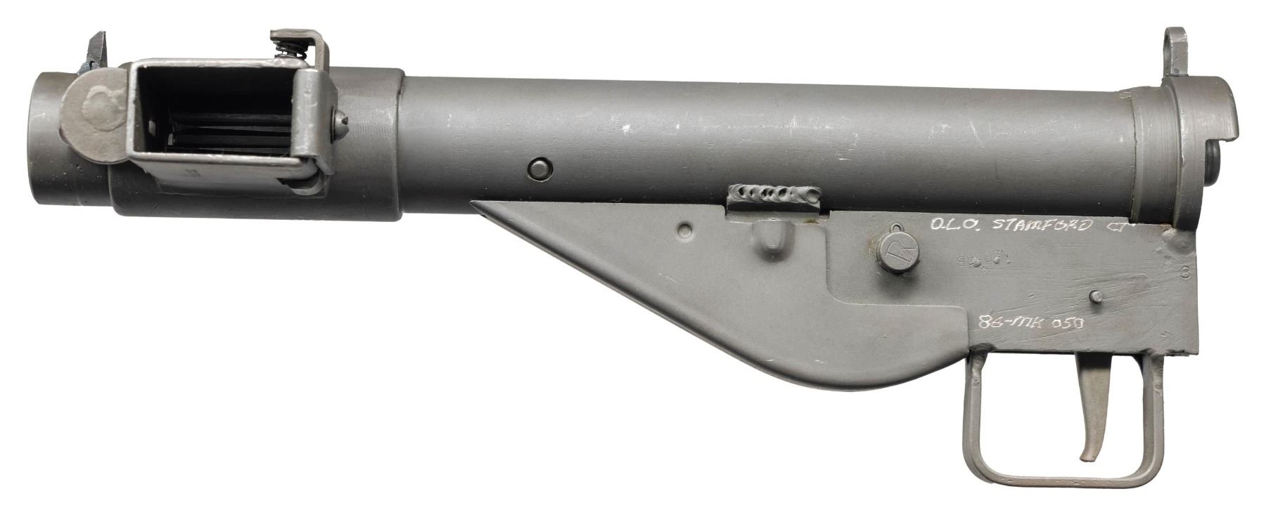 STEN SMG. Cal. 9mm. S# 86-MK050. The STEN was the standard SMG of the British armed forces during WWII & remained in service until the late 1950s. A simple select-fire, open bolt, blowback operated design with a very slow cyclic rate, & few moving parts. It has unique silhouette and is easily recognizable due to its left side magazine placement, directly across from the ejection port. Selector is located in front of trigger, marked w/ "A" for full auto and an "R" for semiautomatic fire. This particular example was Mfg. by Douglas Laurence Oefinger (DLO). Uniform parkerized finish. Original style fixed front blade & rear peep sights. Stamped on left side of trigger housing "D.L.O. STAMFORD CT. / 86-MK-050." Magazine well retains faint stamping "STEN MKII" on top, w/ "FF79732" on opposite side. Bottom of trigger guard still bears the early British # "12660". CONDITION: uniform parkerized finish. Currently missing barrel assembly & loop stock. Fire control mechanism appears to function correctly when cycled by hand. THIS IS A NATIONAL FIREARMS ACT SMG REQUIRING BATF TRANSFER BEFORE TAKING POSSESSION. FULLY TRANSFERABLE. (03-1872/JZ). MODERN. $4,000-6,000.