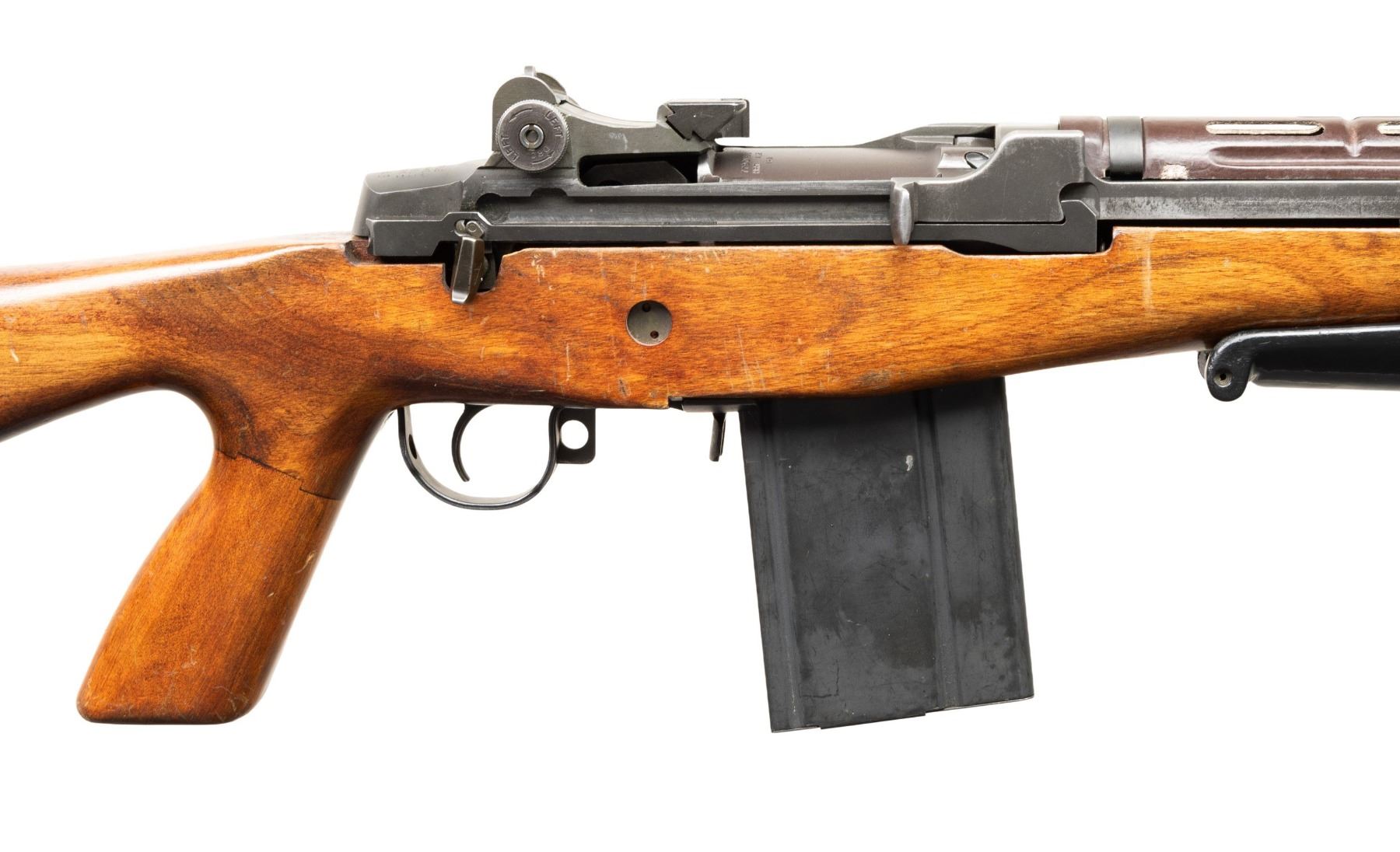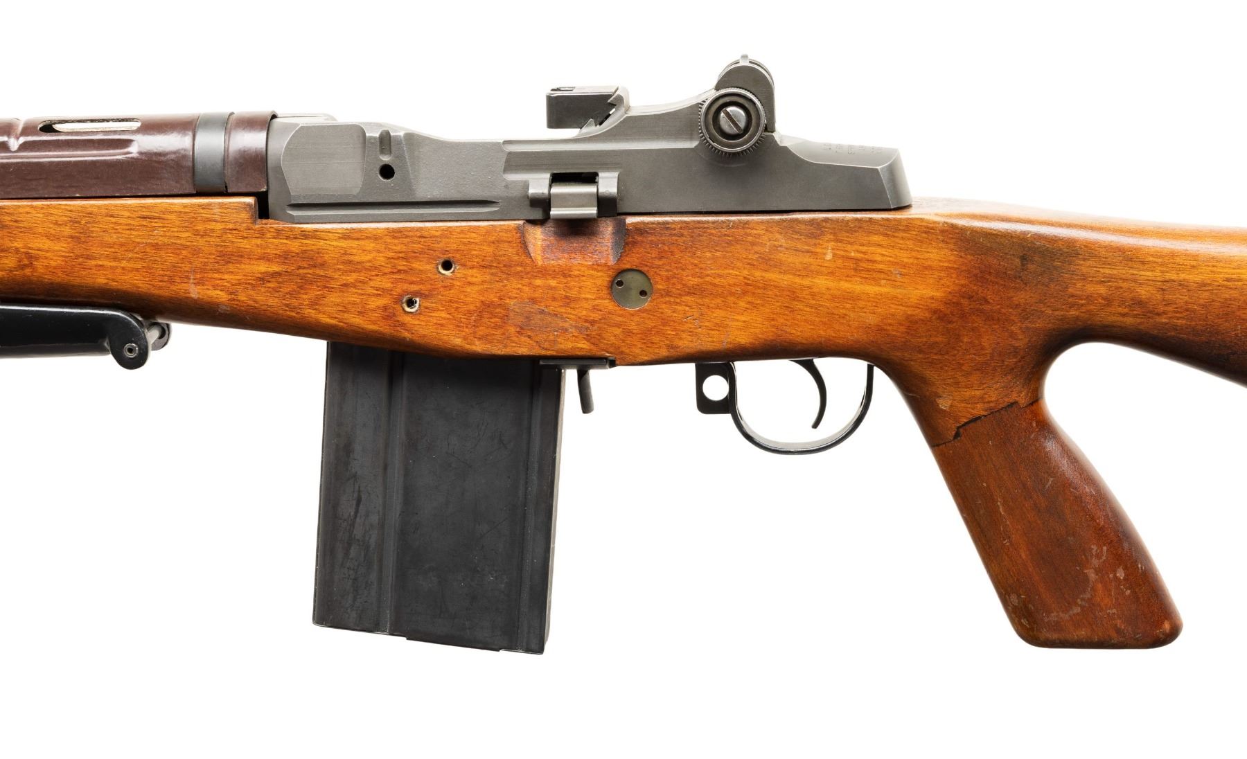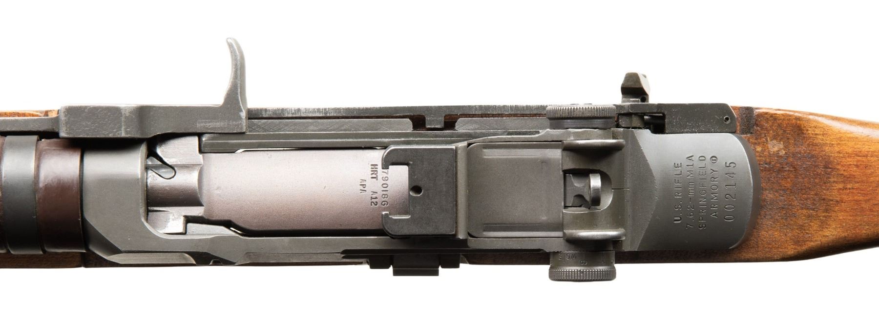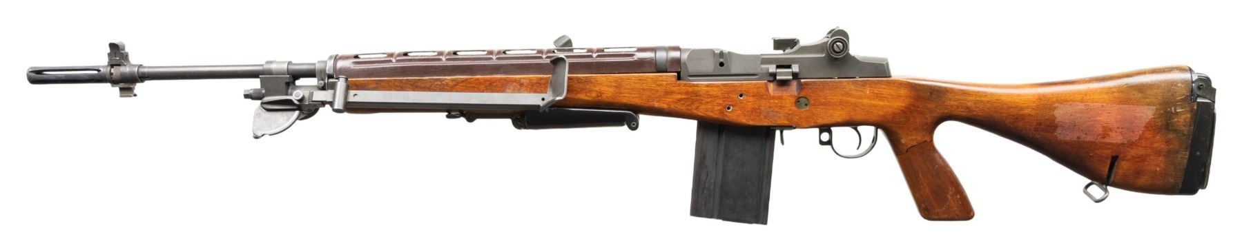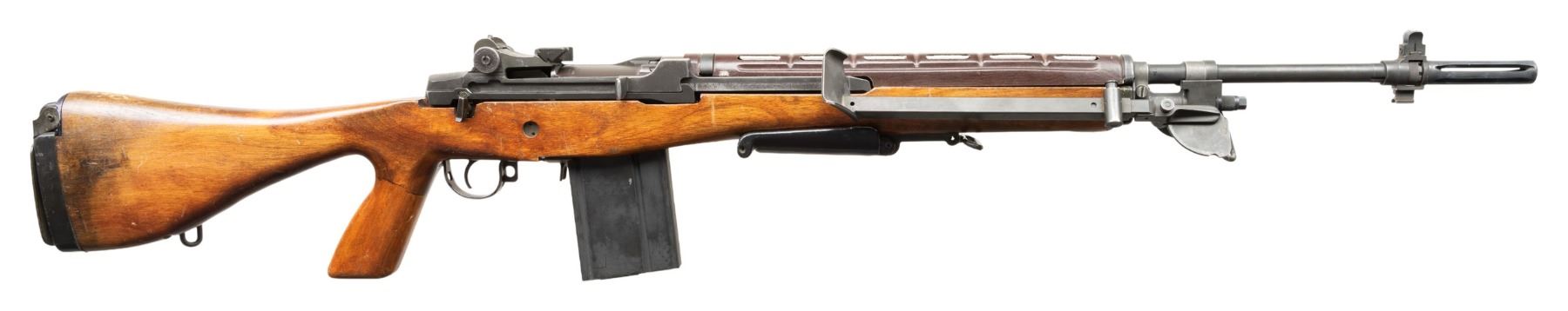 ARMORY M1A FULLY AUTOMATIC MACHINE GUN. Cal. 7.6x51. S#002145. Bbl 25" over bird cage flash hider. Fixed blade dove tail front sight with protected ears and a bayonet lug. Adjustable peep sight. Right side of the receiver has fully automatic selector component. Fitted with a G2 type A2 hardwood stock and perforated round plastic hand guard. Folding foregrip and hinged buttplate. MAGS: 1-20 Round. CONDITION: Overall very fine, original parkerized finish with a few scattered light handling marks. Stock has scattered scuffs, moderate bipod rubs and some discoloration on finish wear around butt. Bright shiny bore with nice rifling. PROVENANCE: Military Museum Collection of Shooters Outpost, Hooksett NH. NATIONAL FIREARMS ACT MG REQUIRING BATF TRANSFER BEFORE TAKING POSSESSION. FULLY TRANSFERABLE. (03-1986/ZAL). MODERN CLASS III. $18,000-24,000.