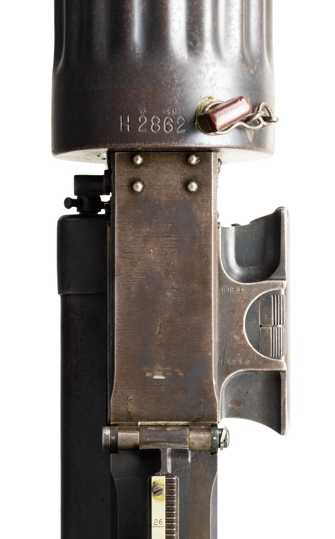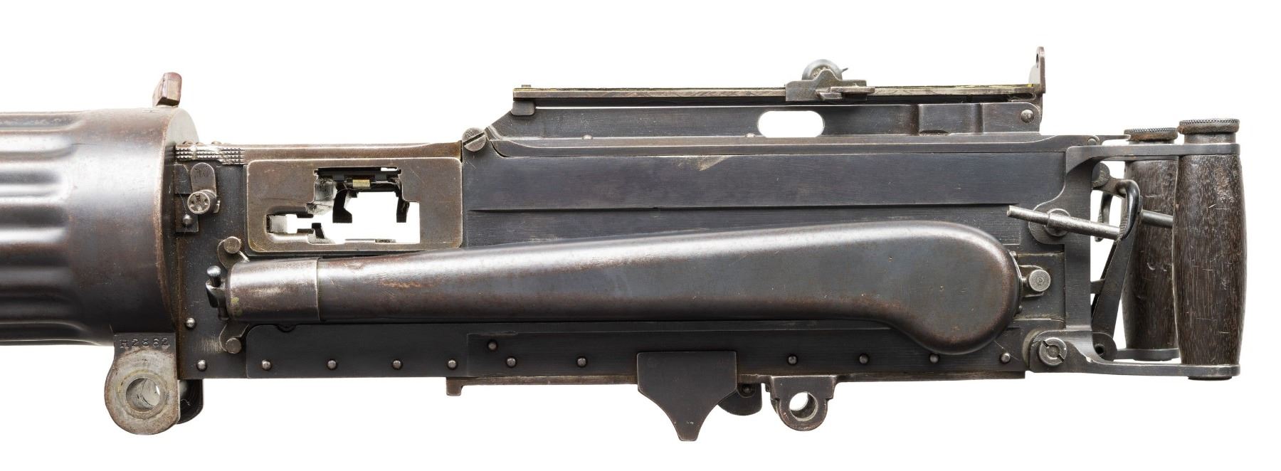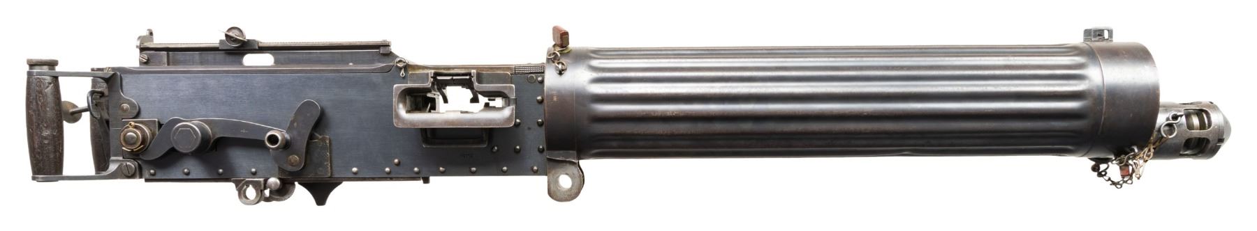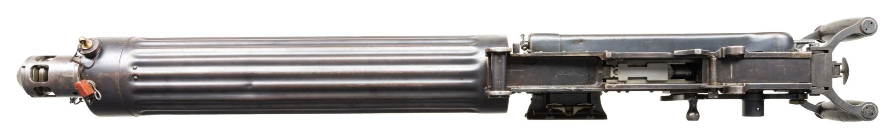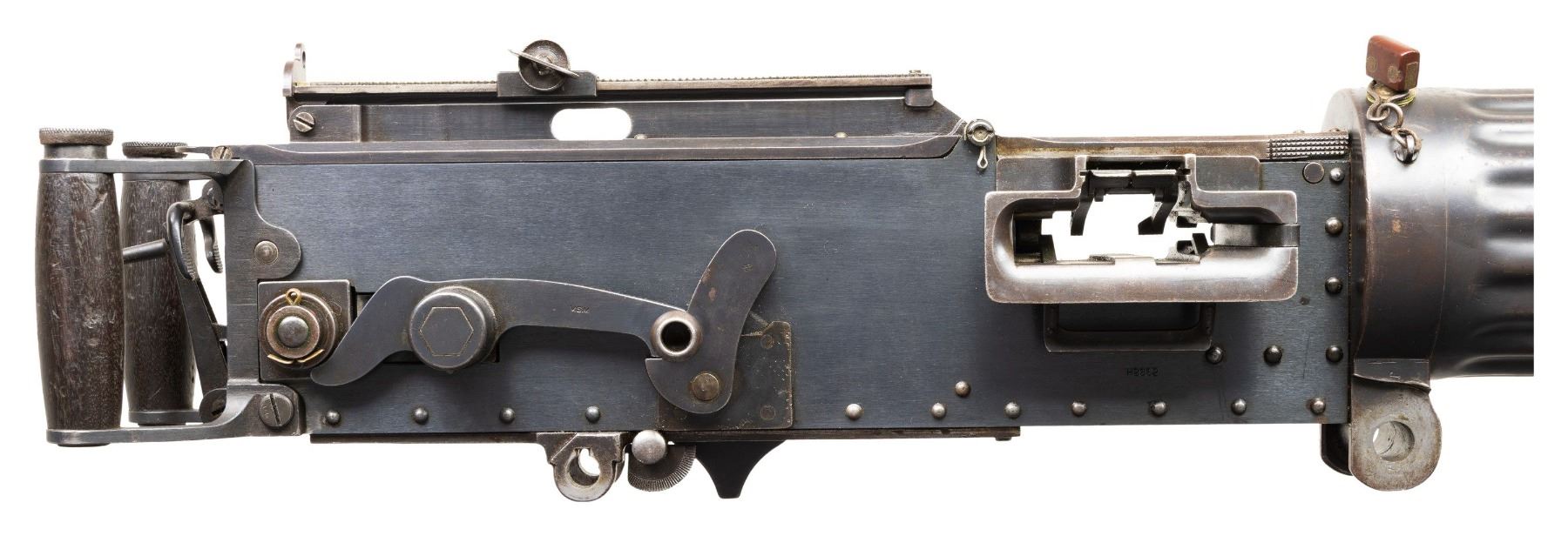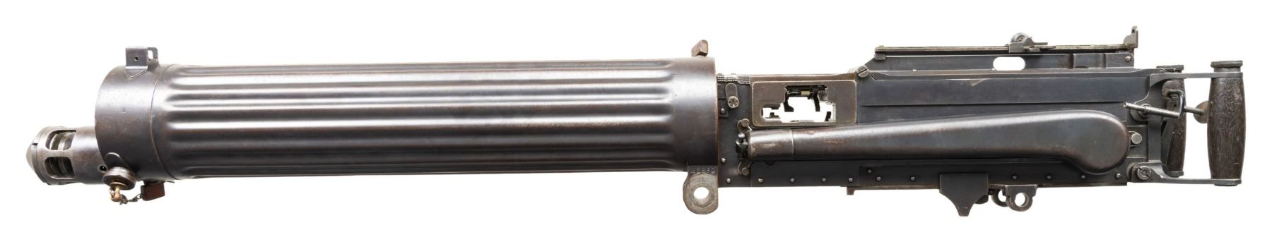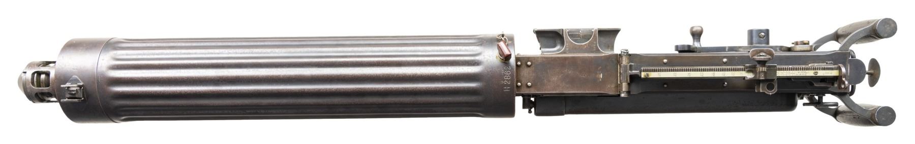 VICKERS 1915 WATER COOLED MACHINE GUN. Cal. 8mm. S#H2862. Bbl 28". Matching numbered Water Jacket. Armored muzzle. Brass drain cap. Shuttle is numbered D1839 and marked Cal 7.9. Bolt is numbered V5751. Various small parts are marked VSM including water jacket with British crown proofs. NFA paperwork lists "Form 2 Registration" as manufacturer. CONDITION: overall very good original arsenal applied finish. Receiver retained 75-80% original blue finish fading to brown patina. Water jacket retains approximately 60% original blue finish with freckled oxidation and high edge wear turning to an even brown patina. Good Grips which are numbered 2022. Bore has light frosting with deep sharp rifling. PROVENANCE: Military Museum Collection of Shooters Outpost, Hooksett NH. NATIONAL FIREARMS ACT MG REQUIRING BATF TRANSFER BEFORE TAKING POSSESSION. FULLY TRANSFERABLE. (03-1995/ZAL). MODERN. CLASS III. $14,000-18,000.