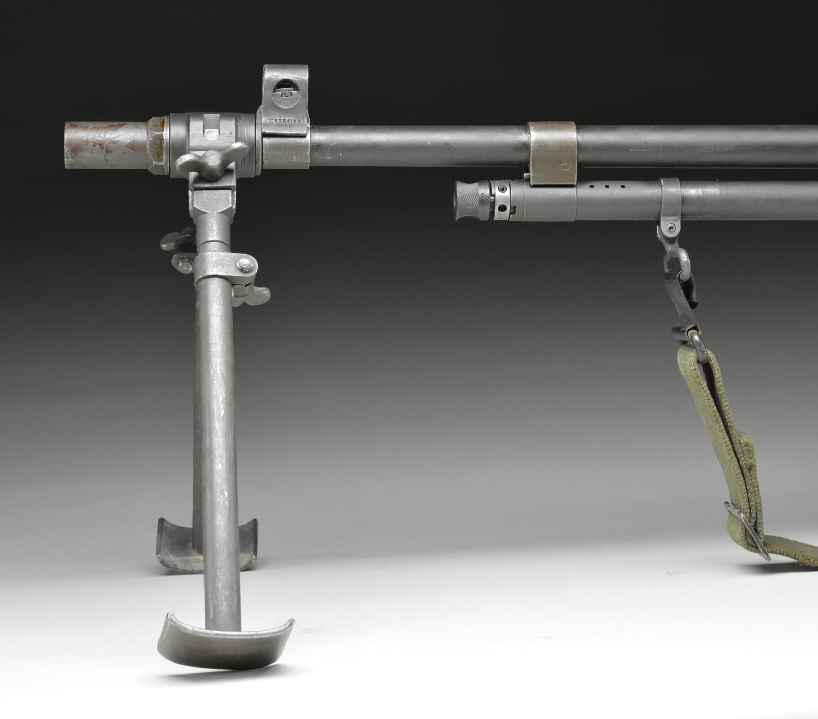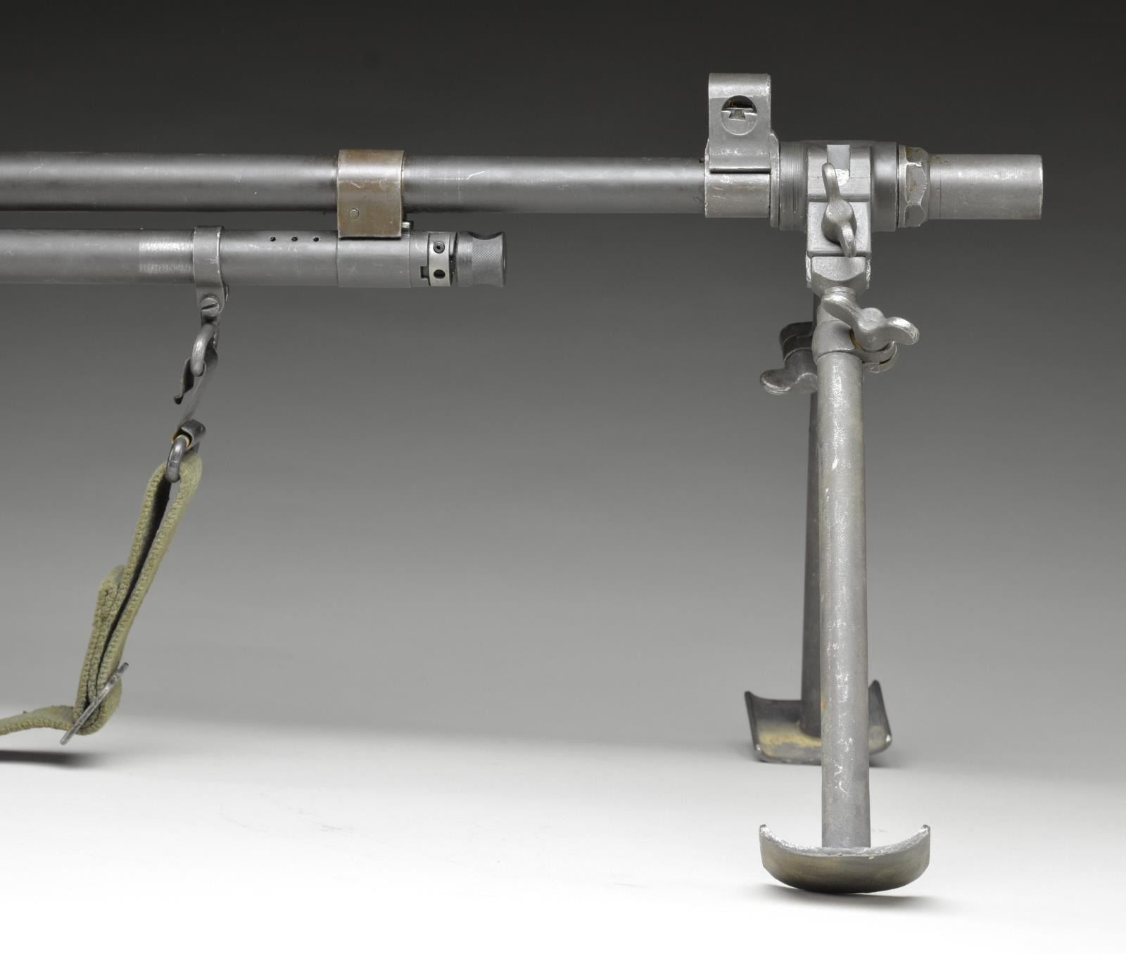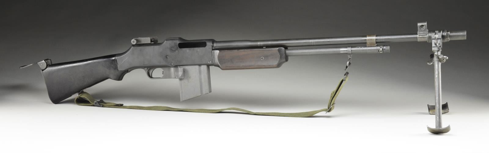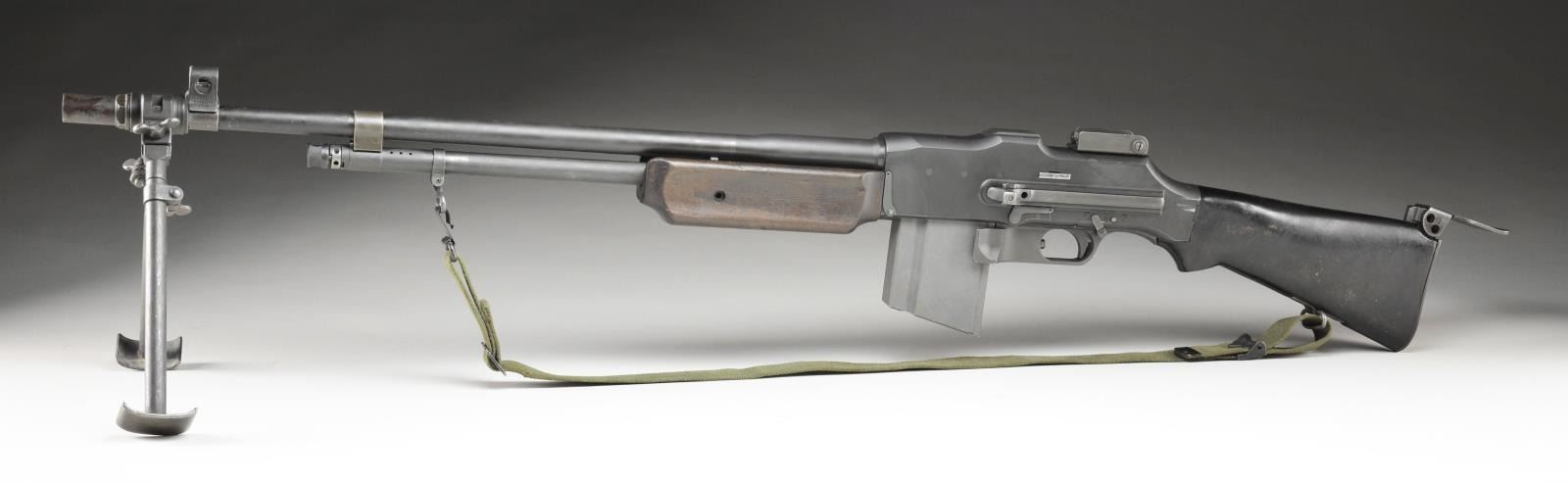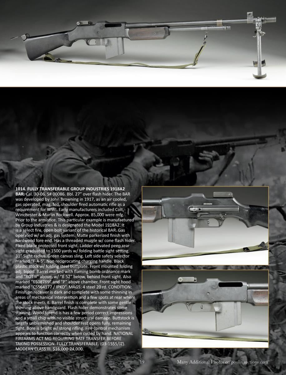 Cal. 30-06. S# 00086. Bbl. 27" over flash hider. The BAR was developed by John Browning in 1917, as an air cooled, gas operated, mag. fed, shoulder fired automatic rifle as a requirement for WWI.  Early manufacturers included Colt, Winchester & Marlin Rockwell. Approx. 85,000 were mfg. Prior to the armistice. This particular example is manufactured by Group Industries & is designated the Model 1918A2. It is a select fire, open bolt variant of the historical BAR. Gas operated w/ an adj. gas system. Matte parkerized finish with hardwood fore end. Has a threaded muzzle w/ cone flash hider. Fixed blade protected front sight. Ladder elevated peep rear sight graduated to 1500 yards w/ folding battle sight setting. 31" Sight radius. Green canvas sling. Left side safety selector marked “F-A-S”. Non reciprocating charging handle. Black plastic stock w/ folding steel buttplate. Front mounted folding adj. bipod. Barrel marked with flaming bomb ordnance mark and “ROT II” above, w/ “8-52” below, behind front sight. Also marked “6508769” and “P” above chamber.  Front sight hood marked “C5564177 / IPKO”. MAGS: 4 steel 20 rd. CONDITION: Finish on receiver is dark and complete with some thinning in areas of mechanical intervention and a few spots at rear where the stock meets it. Barrel finish is complete with some gentle thinning above handguard. Flash hider demonstrates some staining. Wood forend is has a few period correct impressions and a small chip with no visible structural damage. Buttstock is largely unblemished and shoulder rest opens fully, remaining tight. Bore is bright w/ strong rifling. Fire control mechanism appears to function correctly when cycled by hand. NATIONAL FIREARMS ACT MG REQUIRING BATF TRANSFER BEFORE TAKING POSSESSION. FULLY TRANSFERABLE. (03-1555/JZ). MODERN CLASS III. $16,000-24,000.