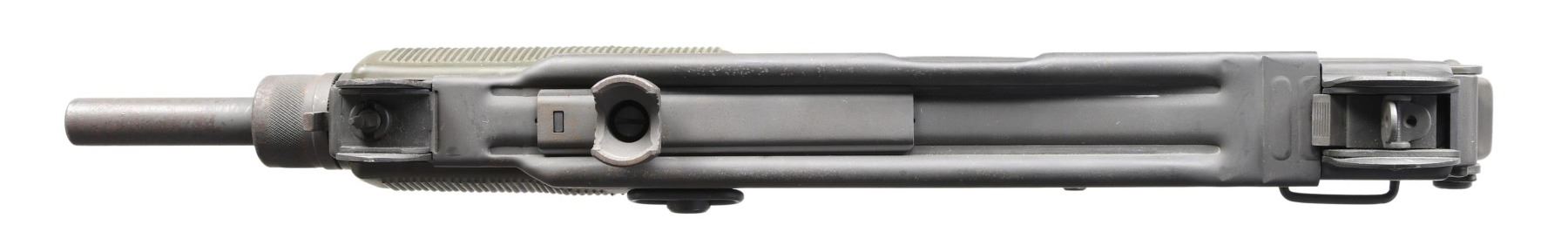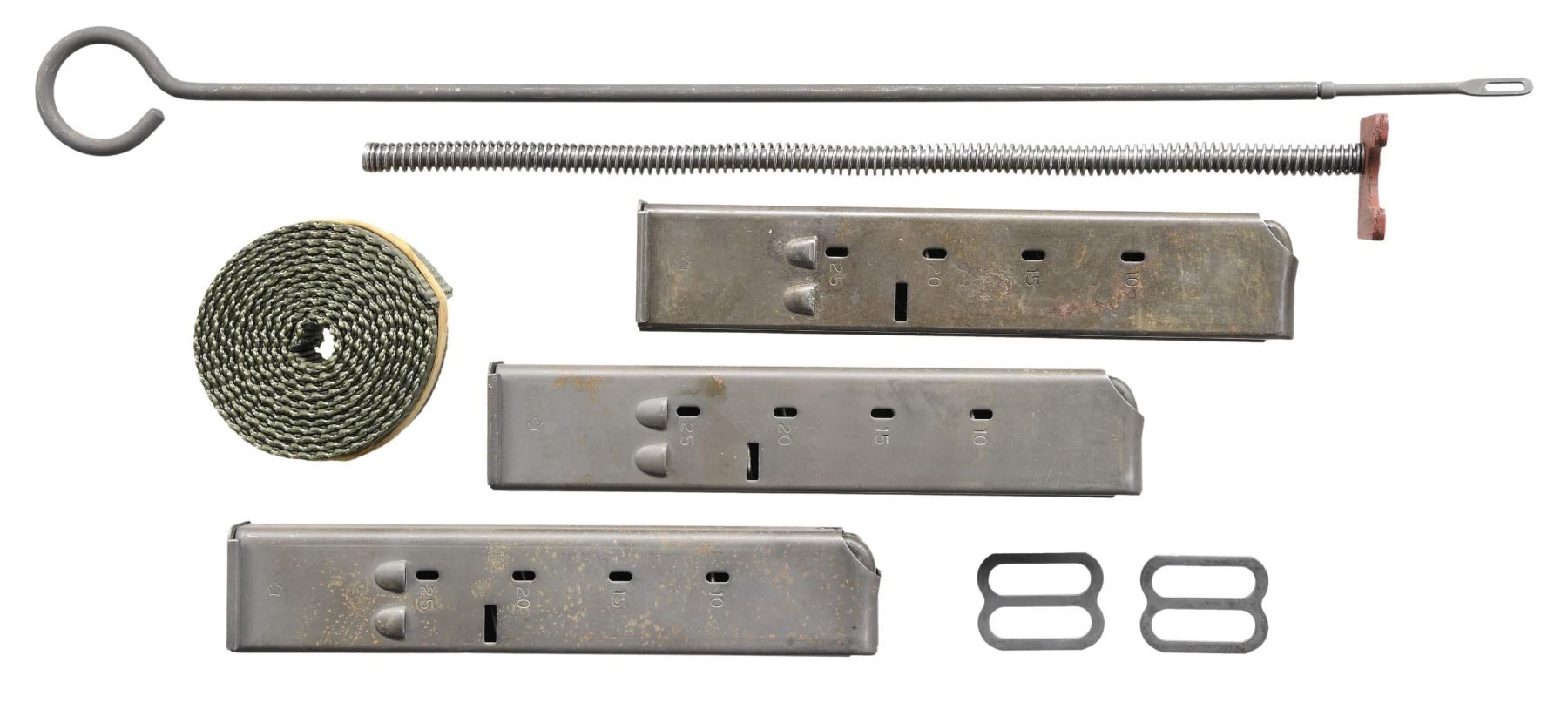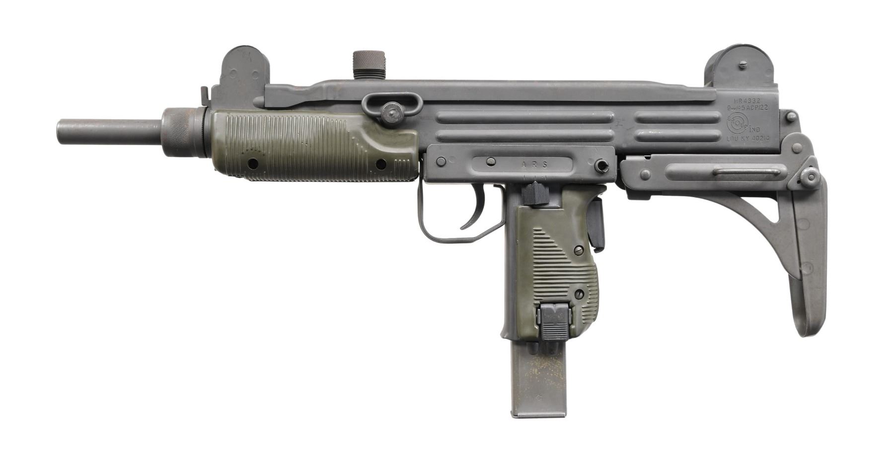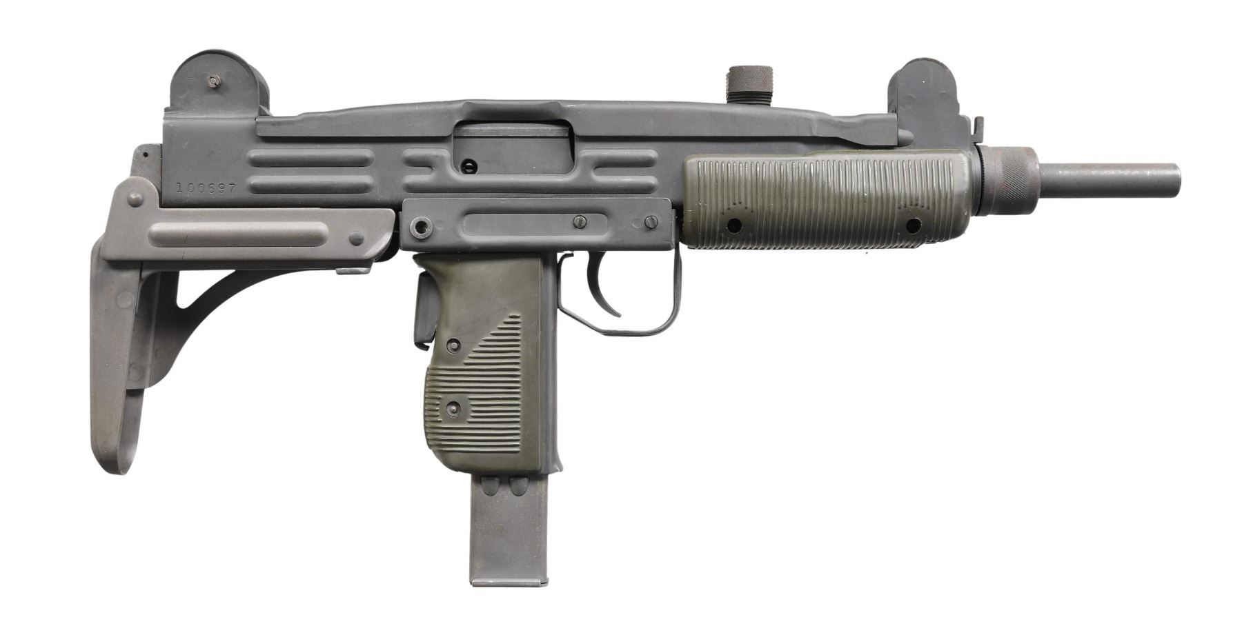 SMG. Cal. 9mm. S# 100697. Bbl. 10.2". Model HR4332 is one of the most sought after Uzi Platforms on the market. These guns were purpose built as machine guns w/ proper heat treating & available in several calibers. While they are often stamped in multiple calibers, the vast majority were offered in 9mm Parabellum. The original Uzi SMG is an open bolt, select fire mechanism that is light years ahead of its technology when it comes to use, it can be utilized in its collapsed, concealable configuration, yet takes only moments to extend the rear stock w/ a simple slap of the control hand pulling it into its extended position. The Uzi bbl. only appears to be a couple inches in length which greatly minimizes its signature for use in tight quarters, but because of the ingenious design it actually extends back inside of the bolt giving the operator over 10 inches of rifled bbl. to increase hit probability immensely. Its ratcheting top cover is an important safety factor when utilizing an open bolt mechanism. Those that are familiar w/ the 1911 family of firearms will appreciate the grip safety integrated into the mechanism. This particular example has green plastic furniture. Bottom front mounted bayonet lug. Sling swivels on left side of receiver & stock. Elevation adjustable protected post front sight. Dual aperture rear sight. Left side markings "A-R-S" above safety/selector. Left rear receiver markings "HR4332 / 9MM/45 ACP/22 / Group IND (inside target logo) / LOU KY 40214". Right side receiver markings include S# "100697". MAGS: 3-25 rd. parkerized stick mags. UNATTACHED ACCESSORIES: cleaning rod, sling assembly, spare recoil spring mechanism. CONDITION: all exposed metal surfaces are black parkerized in what appears to be factory finish, top cover has earned a gentle patina that’s been brought under control, bbl. & bbl. nut are heavily patinaed in 12 o’clock area indicative of collected moisture during storage, stock locks tight & positive in both open & closed position. Bright bore w/ strong rifling. Fire control mechanism appears to function correctly when cycled by hand. NATIONAL FIREARMS ACT MG REQUIRING BATF TRANSFER BEFORE TAKING POSSESSION. FULLY TRANSFERABLE. (03-1463/JZ). MODERN CLASS III. $10,000-15,000.