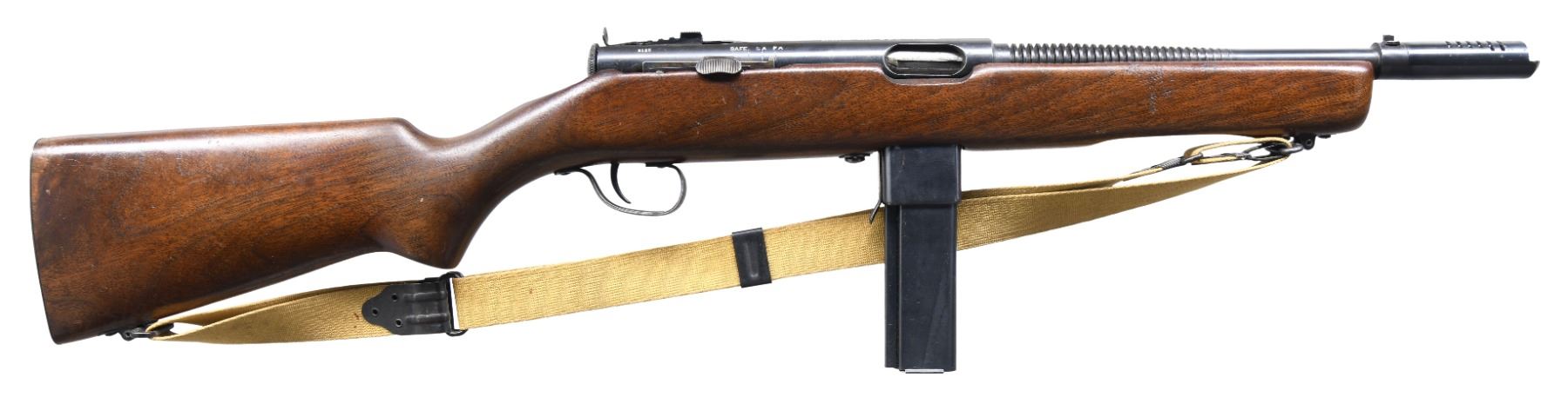 Cal. 45 ACP. S# 2125. Bbl. 13.5" over comp. Barrel w/ 28 fins. In a search for another compact SMG as things were heating up in Europe in 1939, Eugene Reising went to work designing what we would eventually know as the Reising Model 50. He received a patent on his compact, closed bolt carbine, chambered in .45ACP in June of 1940, and entered into a manufacturing contract with Harrington & Richardson to facilitate production. It didn't have many competitors, as the only similar firearm was the Thompson SMG, but the Reising Model 50 was extremely accurate since it fired from a closed bolt. After submission for testing with the US Army, it was not immediately accepted since its same closed bolt mechanism that provided superior accuracy had a tendency to malfunction when not cleaned and maintained regularly. Since the Thompson SMG faced a shortage, the United States Marine Corps adopted the Reising Model 50 with a parkerized finish, cooling fins, a muzzle device to assist with recoil and with select-fire capability. They then requested a modified version for the "Para Marines" that utilized a folding wire stock in a pistol grip design, and without the muzzle device. It was known as the Reising Model 55 and shared by the Tank crews. This example, the Model 50 is a select fire, closed bolt, select fire sub machine gun. It has a 20rd mag-well with 28 cooling fins and a 6 slot muzzle device. Exposed metal surfaces are finished in a dark bluing. Full length wooden stock. Graduated elevation adjustable rear peep sight & drift windage adjustable front post sight incorporated into the muzzle device. Receiver is stamped on top "MODEL 50 – H.&R. REISING – CAL .45 / HARRINGTON AND RICHARDSON ARMS CO. / WORCESTER, MASS. U.S.A. PAT PENDING". Factory markings filled in white for an attractive contrast. MAGS: 3 factory blued 20rd. CONDITION: Finish is heavy & uniform w/ only light thinning in areas of mechanical intervention & some high spots. Stock illustrates only a few light rack earned impressions & has the initials "SHP" stamped on the bottom of the pistol grip. Fire control mechanism appears to function correctly when cycled by hand. Bright bore w/ very strong rifling. NATIONAL FIREARMS ACT MG REQUIRING BATF TRANSFER BEFORE TAKING POSSESSION. FULLY TRANSFERABLE. PROVENANCE: From the Lifelong Collection of Brian Linde. (03-1822/JZ). CLASS III CURIO. $6,000-9,000.