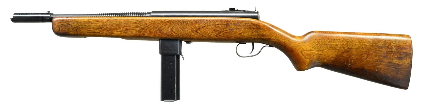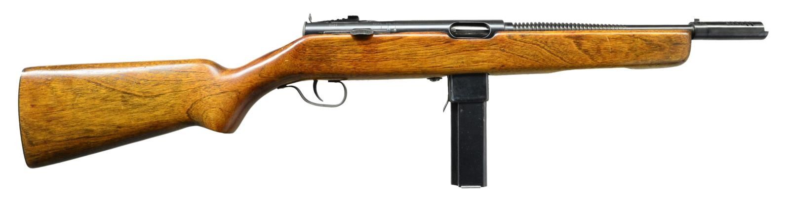 Cal. 45 ACP. S# 8025. Bbl. 13.5" over comp. Barrel w/ 29 fins. In a search for another compact SMG as things were heating up in Europe in 1939, Eugene Reising went to work designing what we would eventually know as the Reising Model 50. He received a patent on his compact, closed bolt carbine, chambered in .45ACP in June of 1940, and entered into a manufacturing contract with Harrington & Richardson to facilitate production. It didn’t have many competitors, as the only similar firearm was the Thompson SMG, but the Reising Model 50 was extremely accurate since it fired from a closed bolt.  After submission for testing with the US Army, it was not immediately accepted since its same closed bolt mechanism that provided superior accuracy had a tendency to malfunction when not cleaned and maintained regularly. Since the Thompson SMG faced a shortage, the United States Marine Corps adopted the Reising Model 50 with a parkerized finish, cooling fins, a muzzle device to assist with recoil and with select-fire capability. They then requested a modified version for the “Para Marines” that utilized a folding wire stock in a pistol grip design, and without the muzzle device. It was known as the Reising Model 55 and shared by the Tank crews. This example, the Model 50 is a select fire, closed bolt sub machine gun. It has a 20rd mag-well with 29 cooling fins and a 6 slot muzzle device. Exposed metal surfaces are finished in a dark bluing. Full length wooden stock. Graduated elevation adjustable rear peep sight & drift windage adjustable front post sight incorporated into the muzzle device. Receiver is stamped on top “MODEL 50 – H.&R. REISING – CAL .45 / HARRINGTON AND RICHARDSON ARMS CO. / WORCESTER, MASS. U.S.A. PAT PENDING”.   MAGS: 2 total factory mags, blued 20rd. UNATTACHED ACCESSORIES: Black Federal Laboratories hard case with fitted blue felt interior, stenciled on both sides, “PROPERTY OF NC HIGHWAY PATROL”. CONDITION: Overall appearance demonstrates that it hasn’t seen an overage of use, and like many others, has spent the majority of its time in a case. Bluing is heavy & uniform w/only light thinning in areas of mechanical intervention. Stock illustrates rack earned dings, scratches and impressions. Fire control mechanism appears to function properly when cycled by hand. Bright bore w/ very strong rifling. NATIONAL FIREARMS ACT MG REQUIRING BATF TRANSFER BEFORE TAKING POSSESSION. FULLY TRANSFERABLE. (03-1553/JZ). CLASS III CURIO. $5,000-8,000.