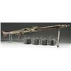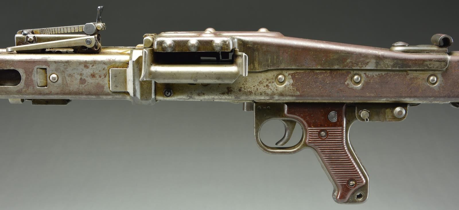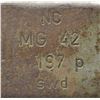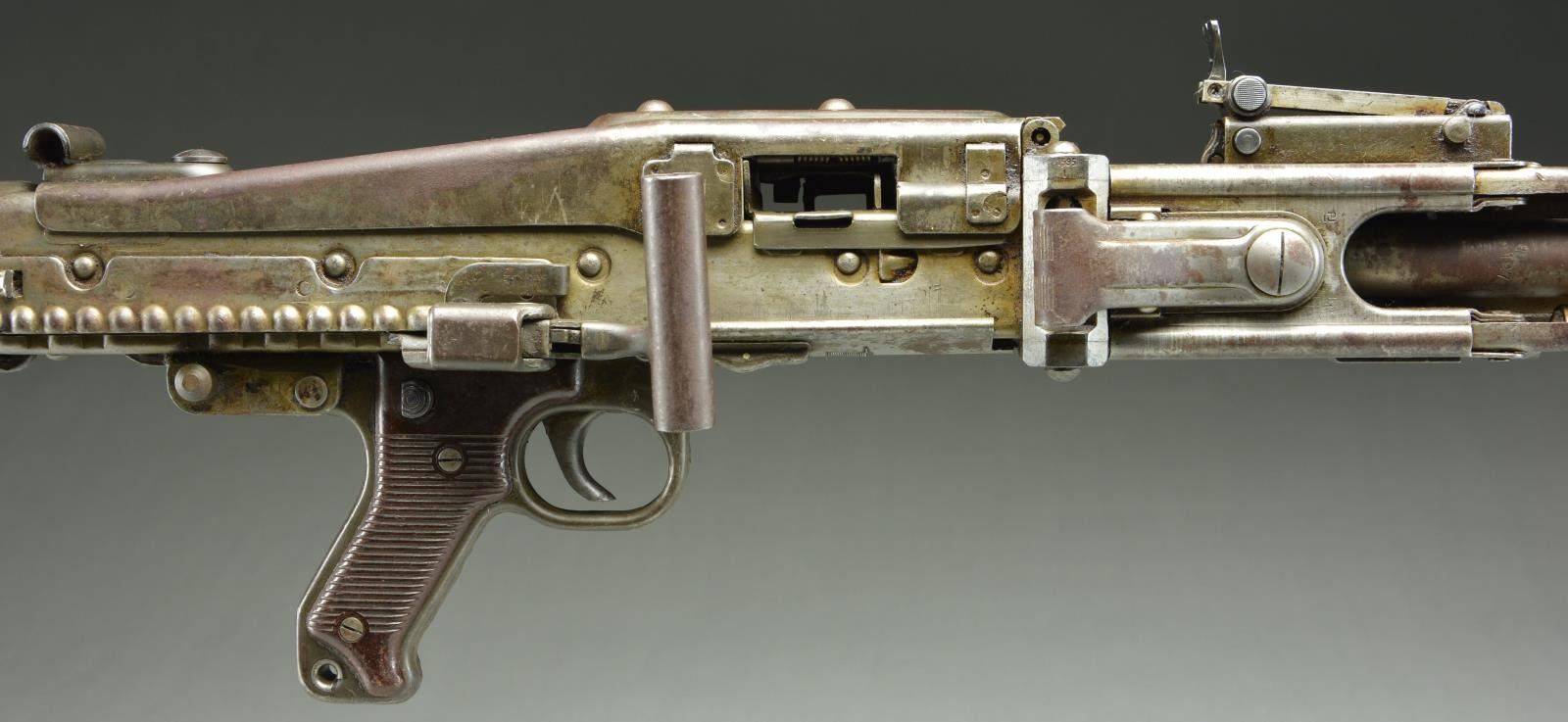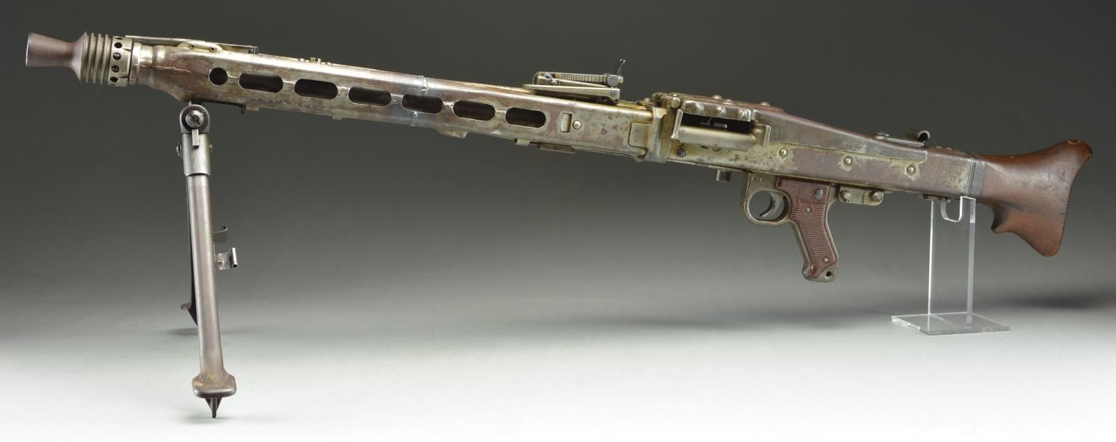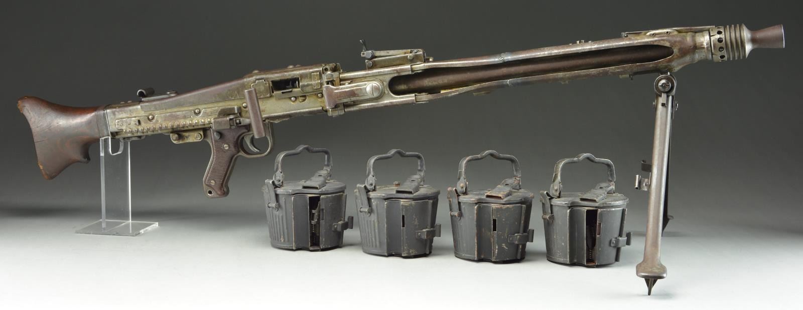 GERMAN MG42 MG. Cal. 7.92x57mm. S# 197P. Bbl. 22.5". Manufactured 1944-1945 by Maget of Berlin. The MG42 was one of the most feared German weapons to be fielded during WWII. Nicknamed “Hitler’s Zipper” due to its incredibly fast cyclic rate, upwards of 1600 rounds per minute of the powerful 8x57mm Mauser cartridge. It was designed to replace the very successful MG34, which required extensive machining and hand fitting of expensive steel. The MG42 would be manufactured extensively from stamped metal, making them much easier & less expensive to produce than the MG34 though they ended up being used in conjunction with them until the end of the war. The time estimate to manufacture an MG34 was approximately 150 man hours while the new MG42 took only 75. The innovation that was utilized in the MG42s operating system lead to general overall improvements to later weapon systems and its legacy lives on today in the development of the United States own M60 GPMG as well as numerous others. The MG42 has an iconic style that is easy to identify, much due to its innovative quick change barrel design. The barrel swings out the side of the barrel jacket & is extracted to the rear, which leaves a large open slot on the right side measuring over 16" in length. The remainder of the barrel jacket has oblong slots for cooling instead of circular ports like the MG34. At the end of the barrel shroud is a partially ported, 4" cone shaped muzzle booster that remains secured to the jacket during barrel changes. A folding bipod also stays secured to the barrel jacket approximately 3" behind the muzzle booster. A peek inside the top cover will quickly reveal similarities w/ the US M60 in its shuttle feed system, feed tray & pawls. It is charged to fire through a hinged, reciprocating charging handle located on the right side, directly above the trigger. Bakelite pistol grips incorporate a cross-slide safety above the hand placement, locking the bolt open. Markings on this example are scattered all over and include the following; on the left side of the receiver at rear include “NC / MG 42 / 197p / swd” translating to 1944-1945 manufacture by Maget of Berlin. On the trigger housing, left side is a German Eagle over the number 14. On the shoulder stock, left side is a German Eagle & “hvq 44”. Barrel jacket below rear sight marked “bpr / 245” & barrel booster retaining arm also marked “bpr” designating work by Johannes Grossfuss, of Döbeln/Sachsen, a metalworking business that produced parts for many guns. MAGS: 4 steel 50 rd. basket drums & 7 lengths of 50 rd. non disintegrating links. CONDITION: the majority of original finish has faded to a flat gray, blended w/ a patina coverage. Barrel jacket has been cut & welded back together 12" behind the muzzle. Markings remain clear & readable on both metal & wood surfaces. Bore is dark but retains strong rifling. Fire control mechanism appears to function correctly when cycled by hand. NATIONAL FIREARMS ACT MG REQUIRING BATF TRANSFER BEFORE TAKING POSSESSION. FULLY TRANSFERABLE. (03-1612/JZ). CURIO, CLASS III. $25,000-45,000.