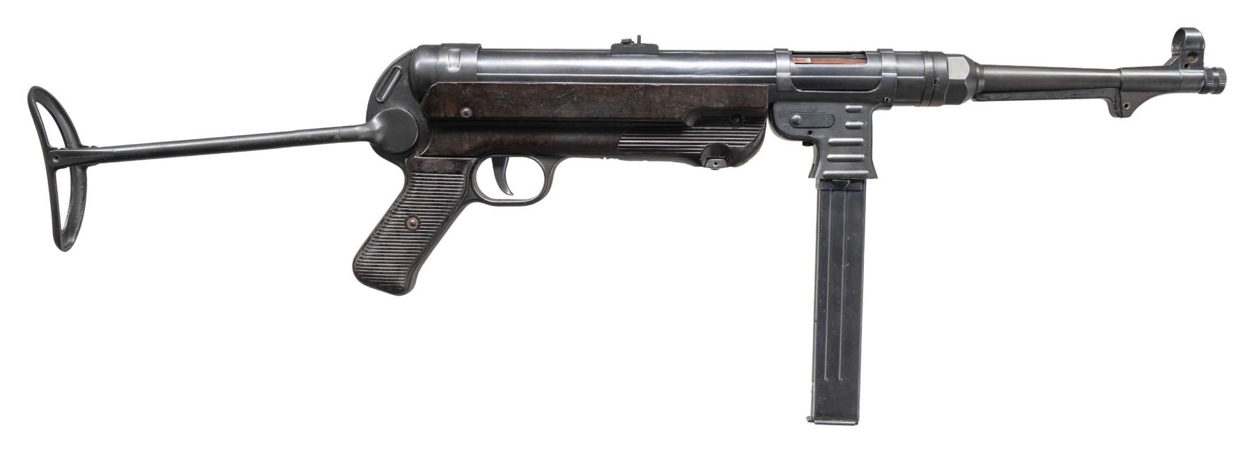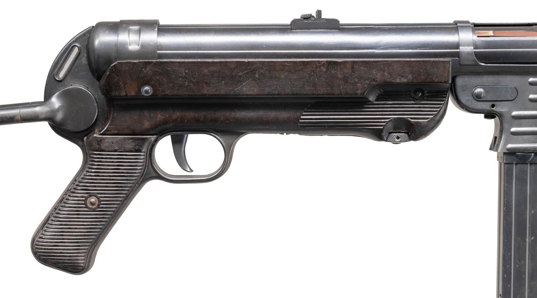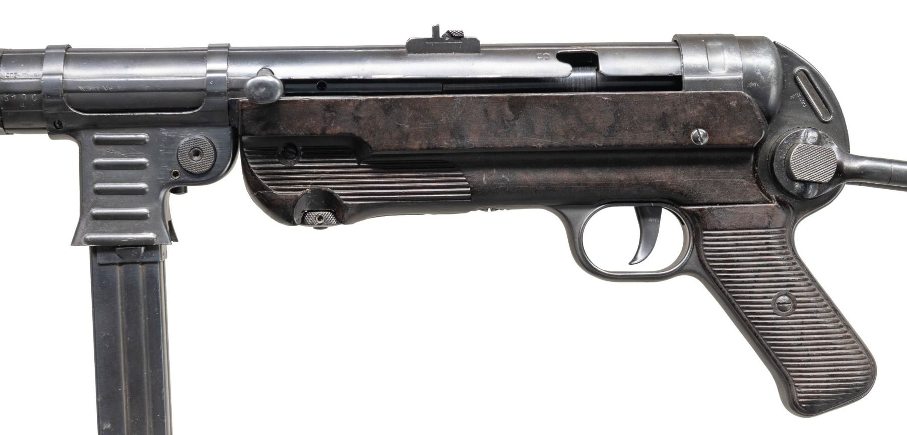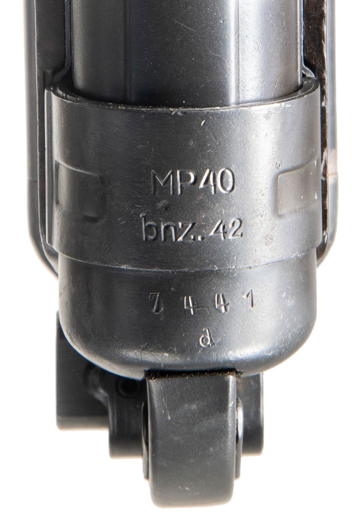 SUBMACHINE GUN. Cal. 9mm (9x19mm Parabellum). S# 5190d. Bbl. 10". MP-40 submachine gun registered by J.P. Foote & Co. Left side of the receiver is marked with Steyr's "bnz" mfg. code, followed by 2 Steyr Eagle/WaA623 proofs and the S#. Underside of receiver tube is engraved "J,P, FOOTE & CO./ MARIETTA GA". Steyr mfg. lower assembly is marked "MP40/ bnz. 42/ 7441/ d" over the top, with "bnz" and an Eagle/WaA625 proof marked on the left. "COS" marked front sight hood with Erma Eagle/280 proof on bbl. and bbl. nut. Metal components exhibit a reapplied blue finish overall. Lower assembly is complete with brown bakelite body and 2-piece grooved brown bakelite grips. Fixed blade front sight with 2-leaf rear sight graduated "200" and "400". Bbl. assembly (bbl., bbl. nut, resting bar, and front sight) does not match, but matches itself. Lower assembly (housing, trigger guard, and under-folding stock) does not match, but matches itself. Bolt assembly is mismatched. MAGS: 1 blued steel 32-rd. mag. Left side of mag. is marked "M.P.38u.40", with Steyr's "kur" mfg. code, 2-digit year of mfg. "43" and 2 Steyr Warsaw plant Eagle/WaA815" proofs marked on the rear. CONDITION: metal components retain the vast majority of their reapplied blue finish, exhibiting some light to mild operational wear along the charging handle channel, with areas of light to mild pitting present beneath the bluing. Right side of folding stock exhibits a patch of mild pitting and finish loss. Bore is relatively bright, exhibiting consistent light to mild pitting, while retaining good, albeit worn rifling throughout. Proper manual mechanics. Bakelite furniture shows scattered marks and impressions from handling and storage, with some cracking present around the takedown pin area. THIS IS A NATIONAL FIREARMS ACT ITEM REQUIRING BATF TRANSFER BEFORE TAKING POSSESSION. FULLY TRANSFERABLE. (03-1913/MLW). MODERN/CLASS III. $14,000-18,000.