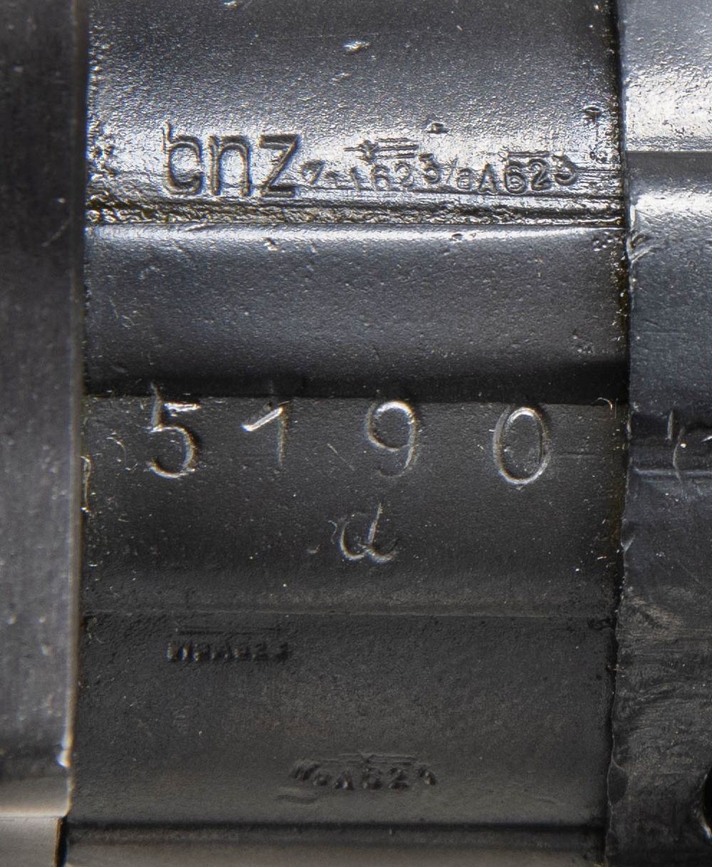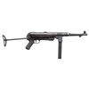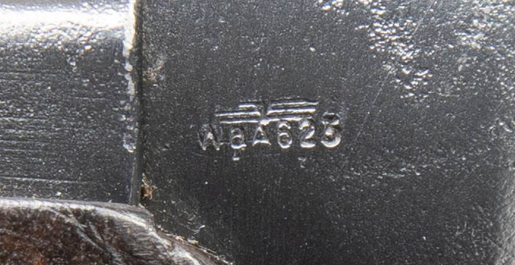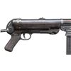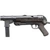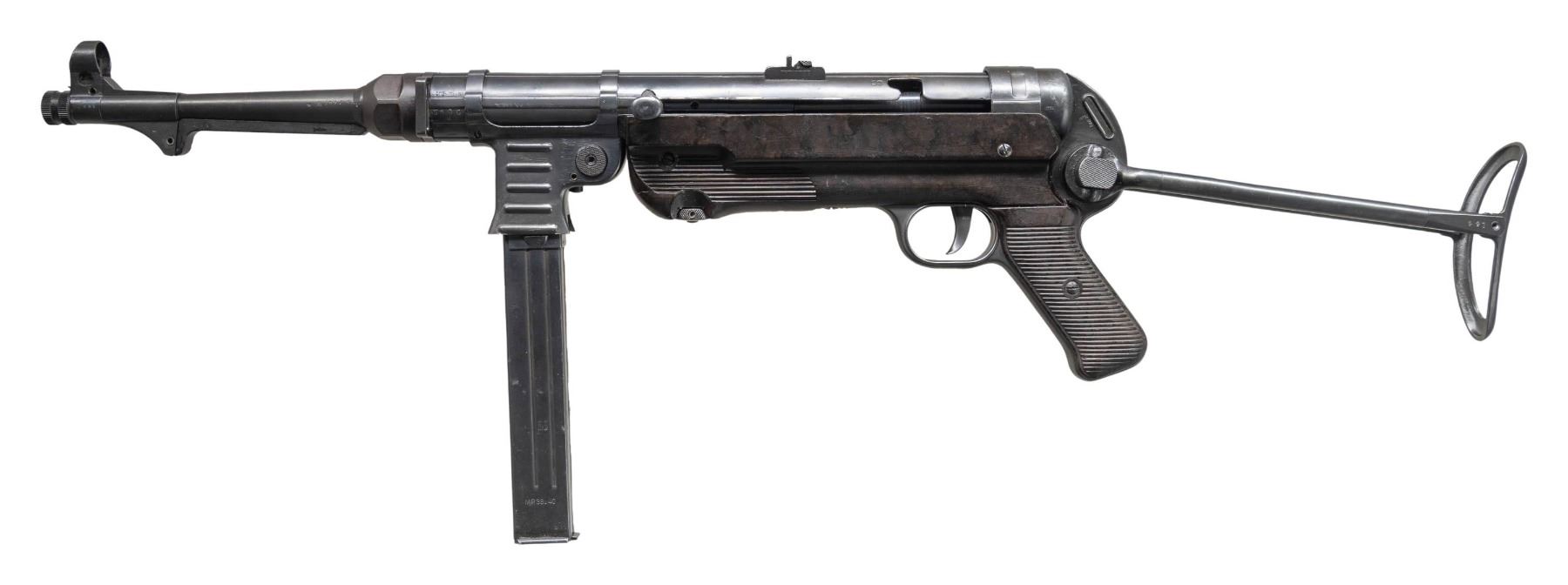 SUBMACHINE GUN. Cal. 9mm (9x19mm Parabellum). S# 5190d. Bbl. 10". MP-40 submachine gun registered by J.P. Foote & Co. Left side of the receiver is marked with Steyr's "bnz" mfg. code, followed by 2 Steyr Eagle/WaA623 proofs and the S#. Underside of receiver tube is engraved "J,P, FOOTE & CO./ MARIETTA GA". Steyr mfg. lower assembly is marked "MP40/ bnz. 42/ 7441/ d" over the top, with "bnz" and an Eagle/WaA625 proof marked on the left. "COS" marked front sight hood with Erma Eagle/280 proof on bbl. and bbl. nut. Metal components exhibit a reapplied blue finish overall. Lower assembly is complete with brown bakelite body and 2-piece grooved brown bakelite grips. Fixed blade front sight with 2-leaf rear sight graduated "200" and "400". Bbl. assembly (bbl., bbl. nut, resting bar, and front sight) does not match, but matches itself. Lower assembly (housing, trigger guard, and under-folding stock) does not match, but matches itself. Bolt assembly is mismatched. MAGS: 1 blued steel 32-rd. mag. Left side of mag. is marked "M.P.38u.40", with Steyr's "kur" mfg. code, 2-digit year of mfg. "43" and 2 Steyr Warsaw plant Eagle/WaA815" proofs marked on the rear. CONDITION: metal components retain the vast majority of their reapplied blue finish, exhibiting some light to mild operational wear along the charging handle channel, with areas of light to mild pitting present beneath the bluing. Right side of folding stock exhibits a patch of mild pitting and finish loss. Bore is relatively bright, exhibiting consistent light to mild pitting, while retaining good, albeit worn rifling throughout. Proper manual mechanics. Bakelite furniture shows scattered marks and impressions from handling and storage, with some cracking present around the takedown pin area. THIS IS A NATIONAL FIREARMS ACT ITEM REQUIRING BATF TRANSFER BEFORE TAKING POSSESSION. FULLY TRANSFERABLE. (03-1913/MLW). MODERN/CLASS III. $14,000-18,000.