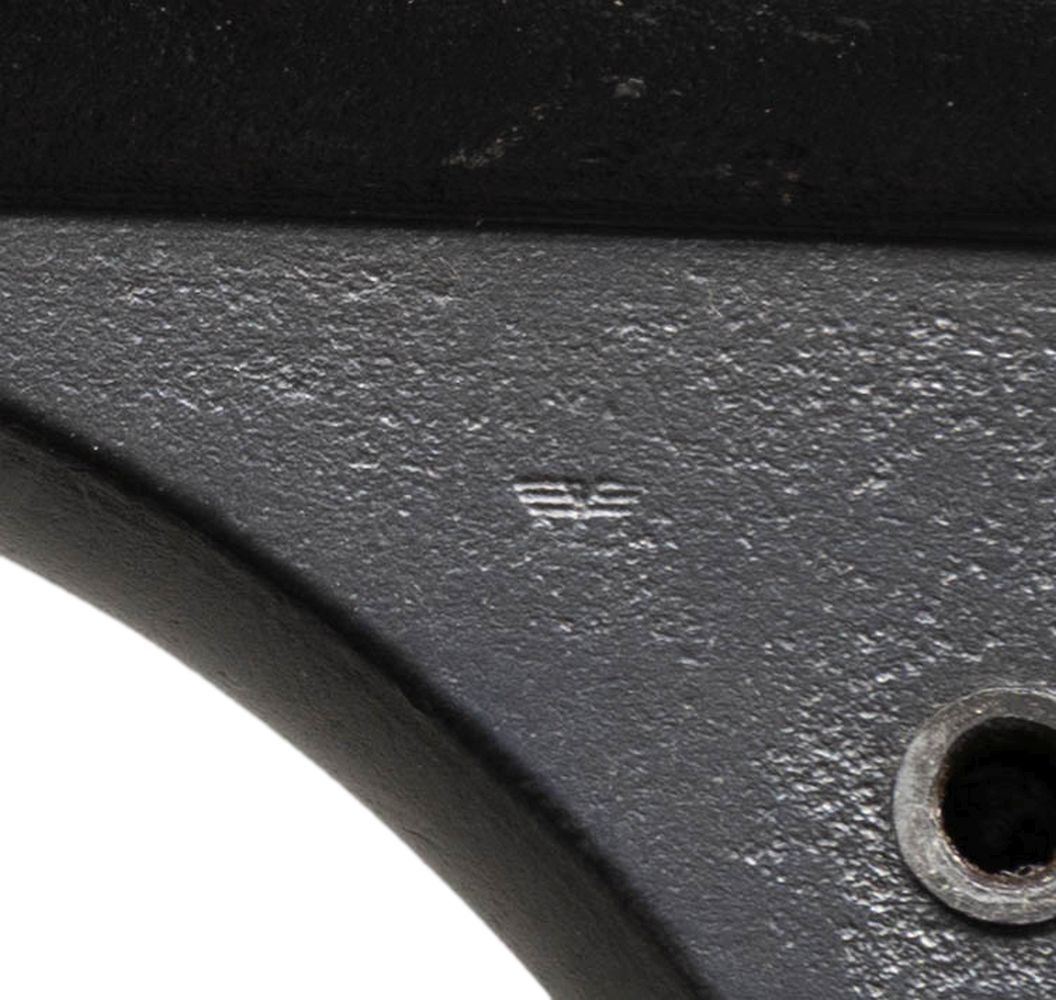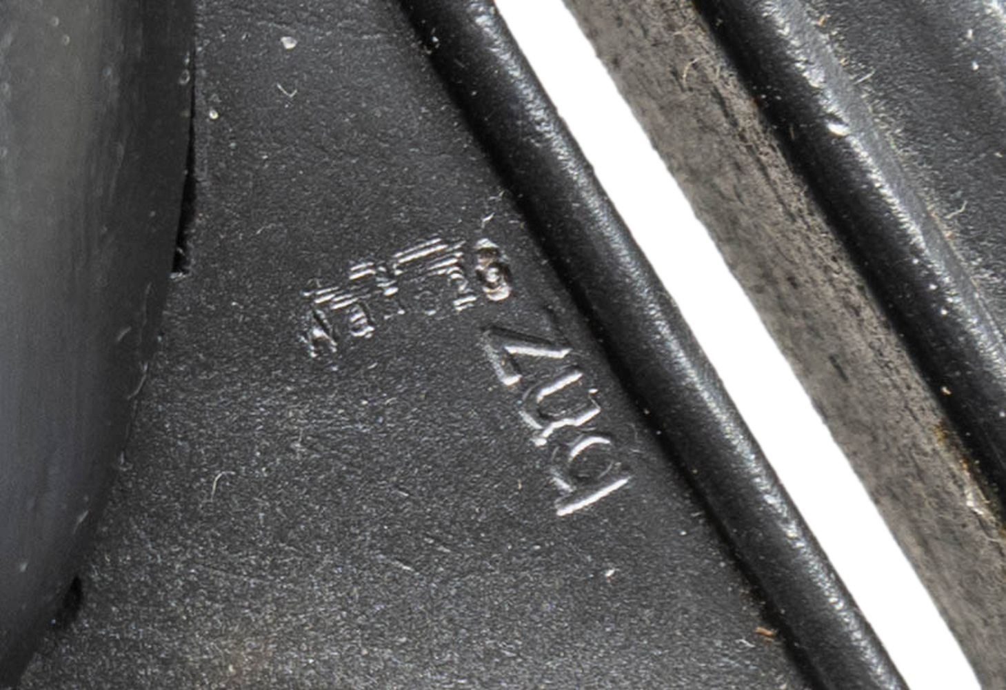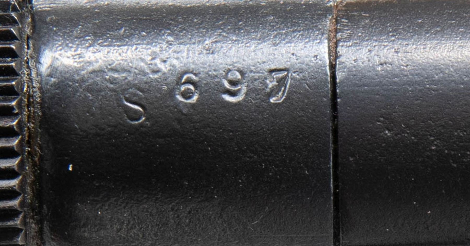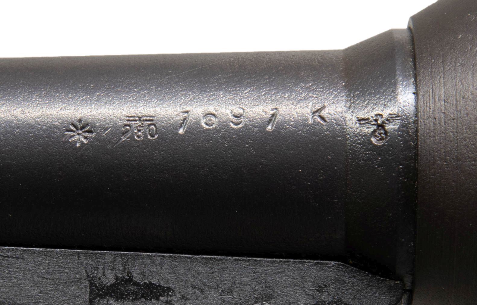 SUBMACHINE GUN. Cal. 9mm (9x19mm Parabellum). S# 5190d. Bbl. 10". MP-40 submachine gun registered by J.P. Foote & Co. Left side of the receiver is marked with Steyr's "bnz" mfg. code, followed by 2 Steyr Eagle/WaA623 proofs and the S#. Underside of receiver tube is engraved "J,P, FOOTE & CO./ MARIETTA GA". Steyr mfg. lower assembly is marked "MP40/ bnz. 42/ 7441/ d" over the top, with "bnz" and an Eagle/WaA625 proof marked on the left. "COS" marked front sight hood with Erma Eagle/280 proof on bbl. and bbl. nut. Metal components exhibit a reapplied blue finish overall. Lower assembly is complete with brown bakelite body and 2-piece grooved brown bakelite grips. Fixed blade front sight with 2-leaf rear sight graduated "200" and "400". Bbl. assembly (bbl., bbl. nut, resting bar, and front sight) does not match, but matches itself. Lower assembly (housing, trigger guard, and under-folding stock) does not match, but matches itself. Bolt assembly is mismatched. MAGS: 1 blued steel 32-rd. mag. Left side of mag. is marked "M.P.38u.40", with Steyr's "kur" mfg. code, 2-digit year of mfg. "43" and 2 Steyr Warsaw plant Eagle/WaA815" proofs marked on the rear. CONDITION: metal components retain the vast majority of their reapplied blue finish, exhibiting some light to mild operational wear along the charging handle channel, with areas of light to mild pitting present beneath the bluing. Right side of folding stock exhibits a patch of mild pitting and finish loss. Bore is relatively bright, exhibiting consistent light to mild pitting, while retaining good, albeit worn rifling throughout. Proper manual mechanics. Bakelite furniture shows scattered marks and impressions from handling and storage, with some cracking present around the takedown pin area. THIS IS A NATIONAL FIREARMS ACT ITEM REQUIRING BATF TRANSFER BEFORE TAKING POSSESSION. FULLY TRANSFERABLE. (03-1913/MLW). MODERN/CLASS III. $14,000-18,000.