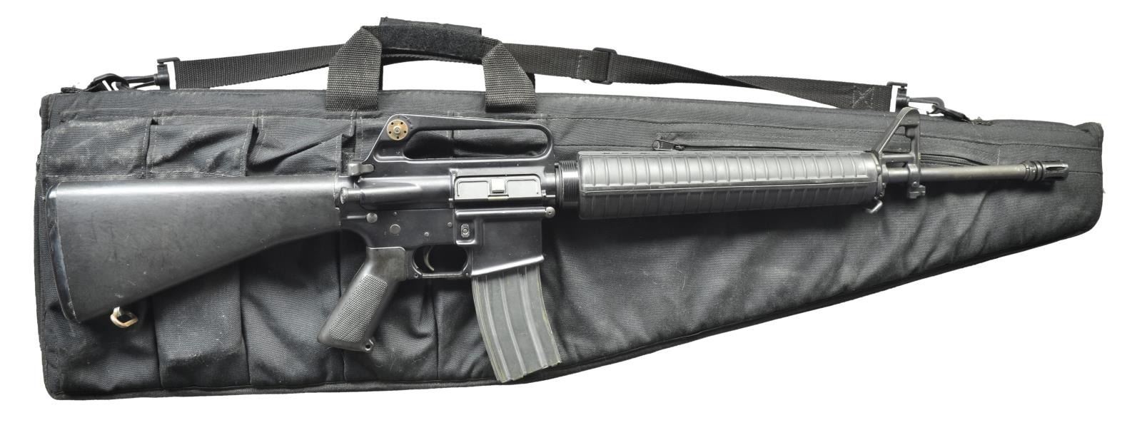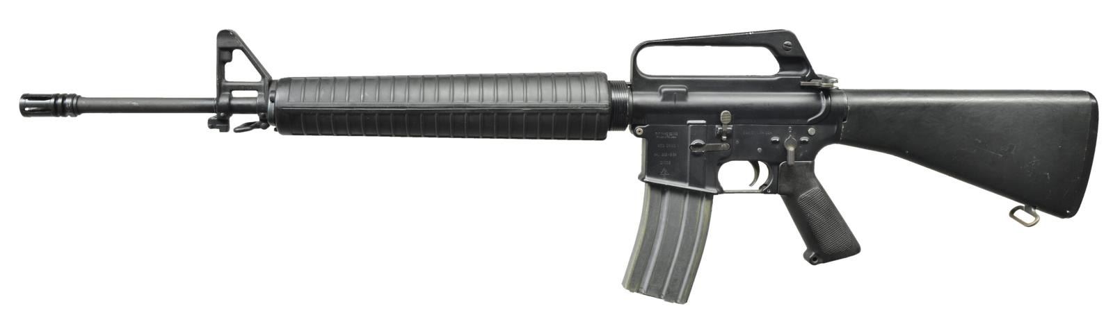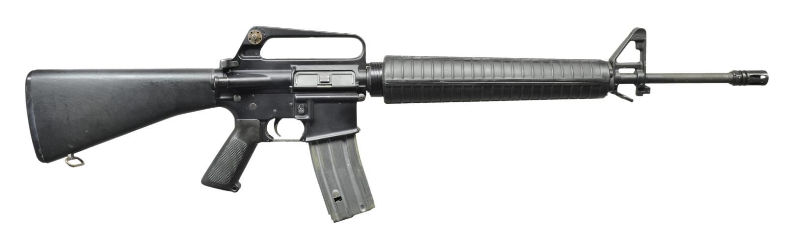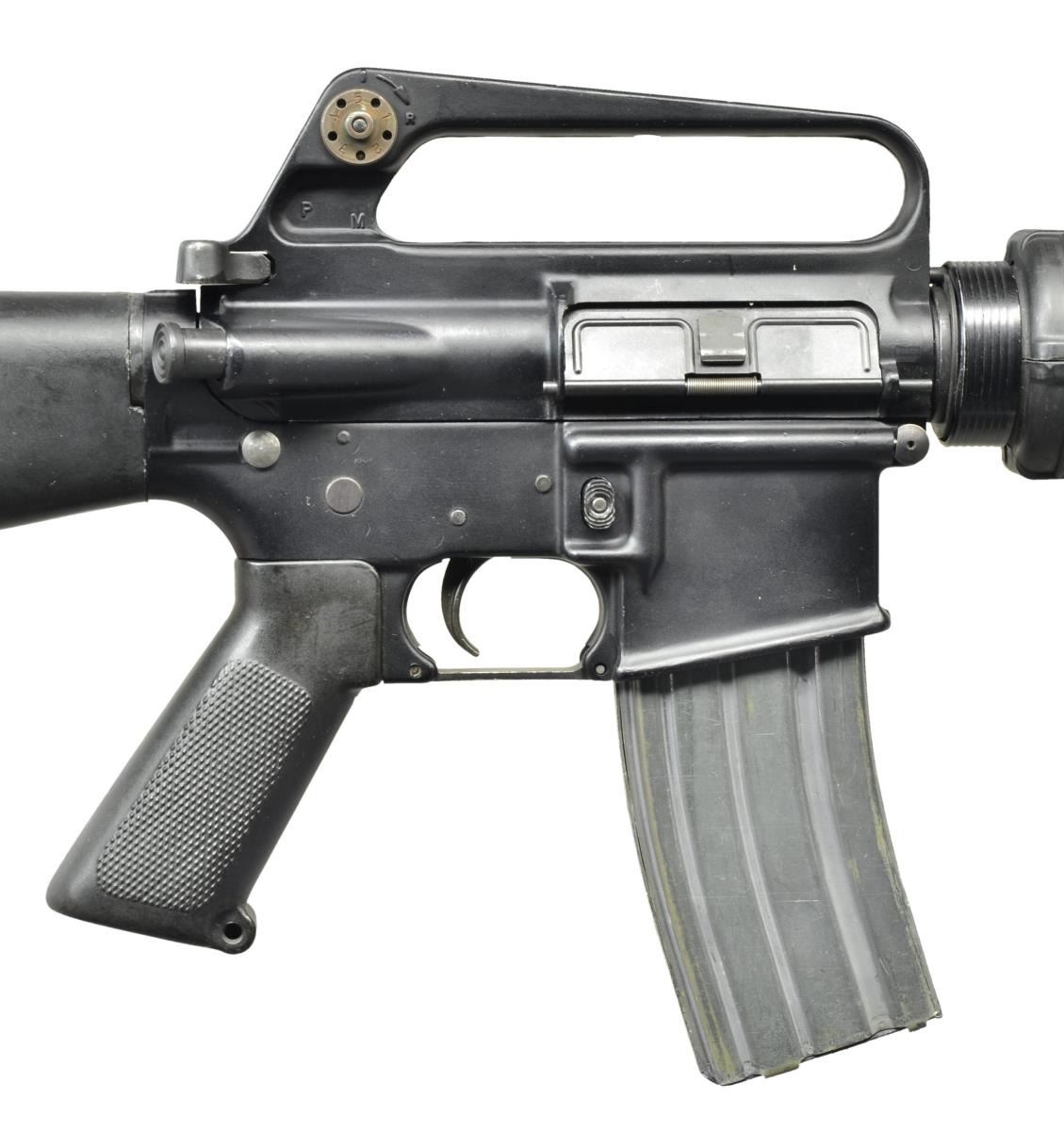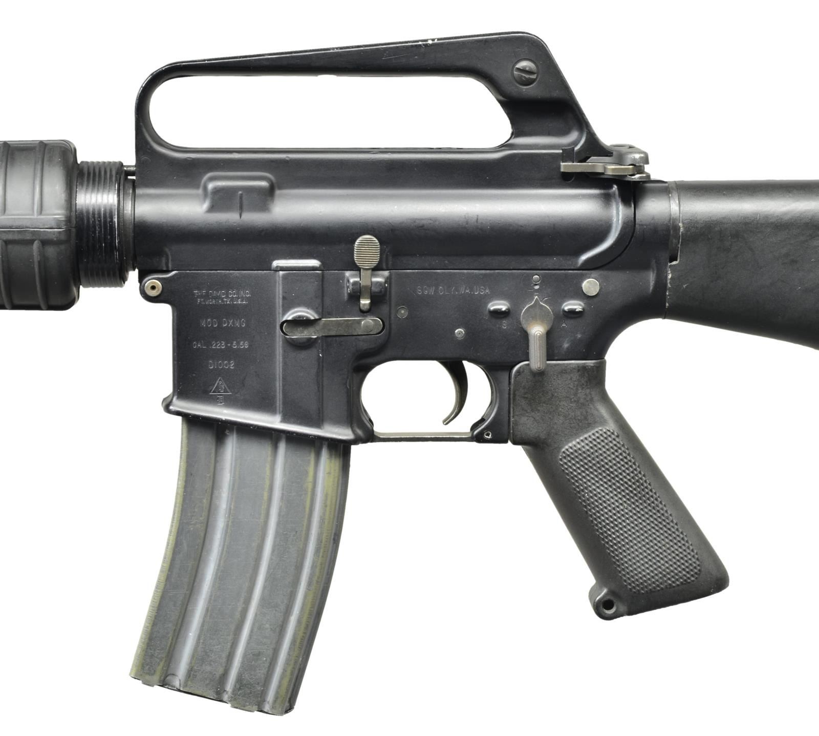 Cal. 223. S# D1002. Bbl. 20". A classic M16 A2 configuration mfg. by The David Company on an SGW Olympic receiver. Very few firearms are as recognizable & relevant as the Colt M16. From 40 year old black & white grainy news clips to current high definition video, shot in the Middle East, this time proven workhorse still remains the primary longarm today. Its semi-auto, sporting counterpart, the AR15, has been the most popular MSR in the U.S. for over a decade. Unfortunately, it’s been over 36 years since these could be mfg. for civilian ownership & they’re still as popular as ever. A2 style flash hider protected post elevation adj. front sight w/ bayonet lug & windage adj. rear peep on carry handle. Rifle length A2 circular handguards. Straight Delta ring. Rnd. forward assist. Raised fence lower receiver. No brass deflector. Factory black anodized finish. Sling swivels front & rear. 10" Trapdoor full length buttstock. Receiver markings, left side above mag. well: “THE DAVID CO. INC. / FT WORTH TX U.S.A. / MOD DXMG / CAL 223 – 5.56 / D1002”, left side above trigger: “SGW OLY WA USA”, selector marked “S – F – A”. No right side receiver markings. MAGS: 2 aluminum Parsons Precision Products 30 rd. mags. UNATTACHED ACCESSORIES: black nylon Bagmaster No. 42 transport case w/ sling. CONDITION: upper & lower receiver finish matches in color quite closely which is unusual for many aftermarket M16 conversions. Scattered light handling marks mostly on high surfaces. Furniture appears used but in great condition. Trapdoor functions correctly. SAK chrome bore pencil bbl. remains shiny w/ strong rifling. Fire control mechanism appears to function correctly when cycled by hand. NATIONAL FIREARMS ACT MG REQUIRING BATF TRANSFER BEFORE TAKING POSSESSION. FULLY TRANSFERABLE. (03-1541/JZ). MODERN CLASS III. $10,000-14,000.