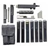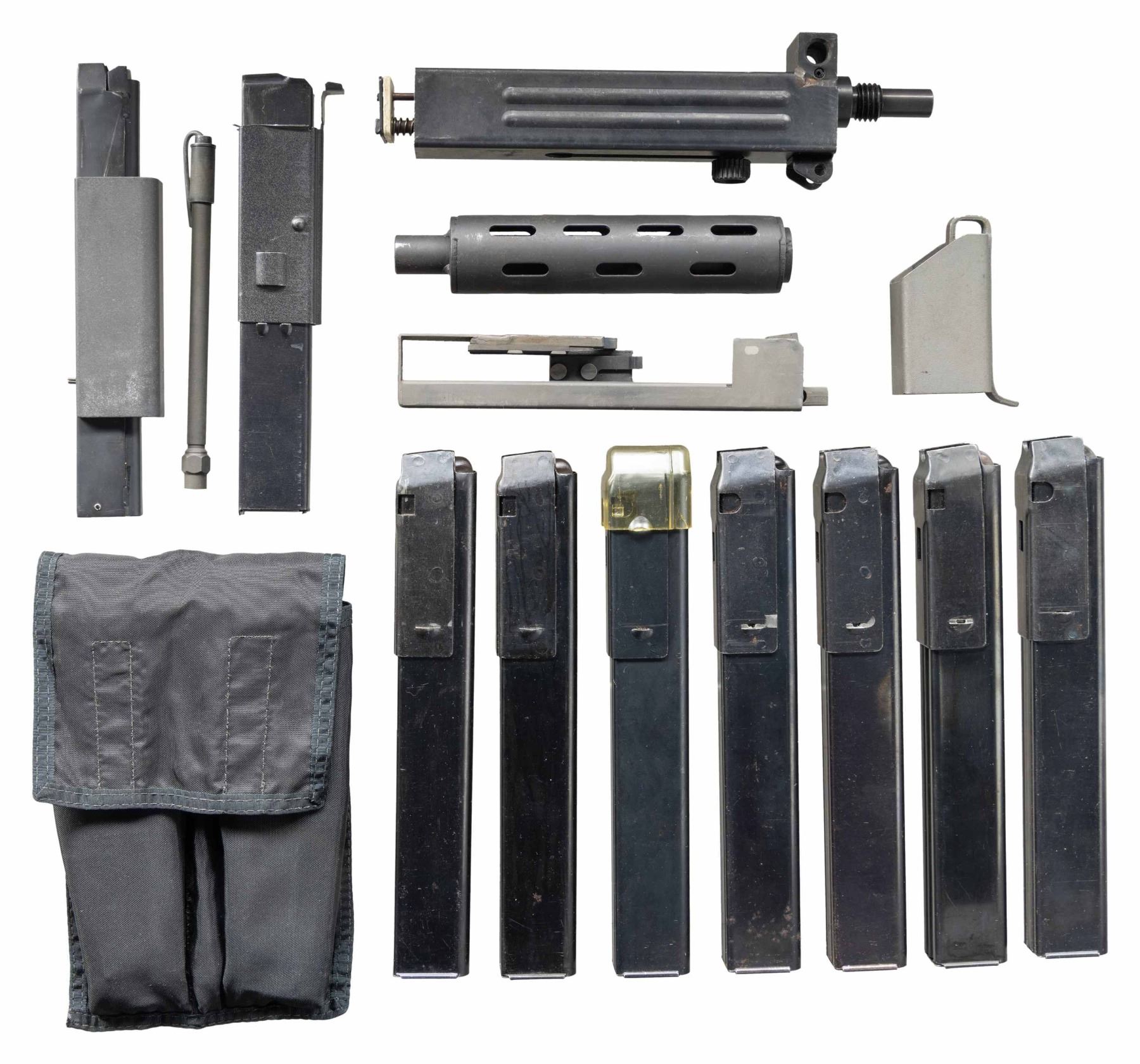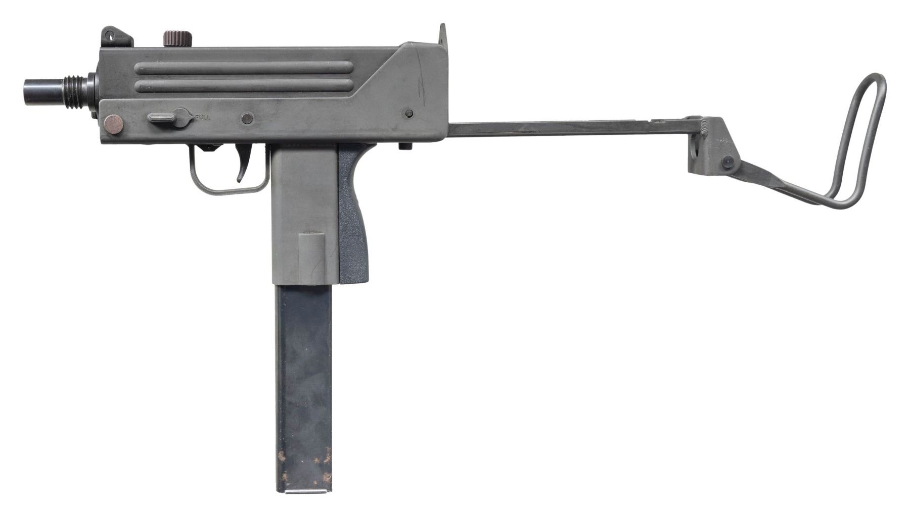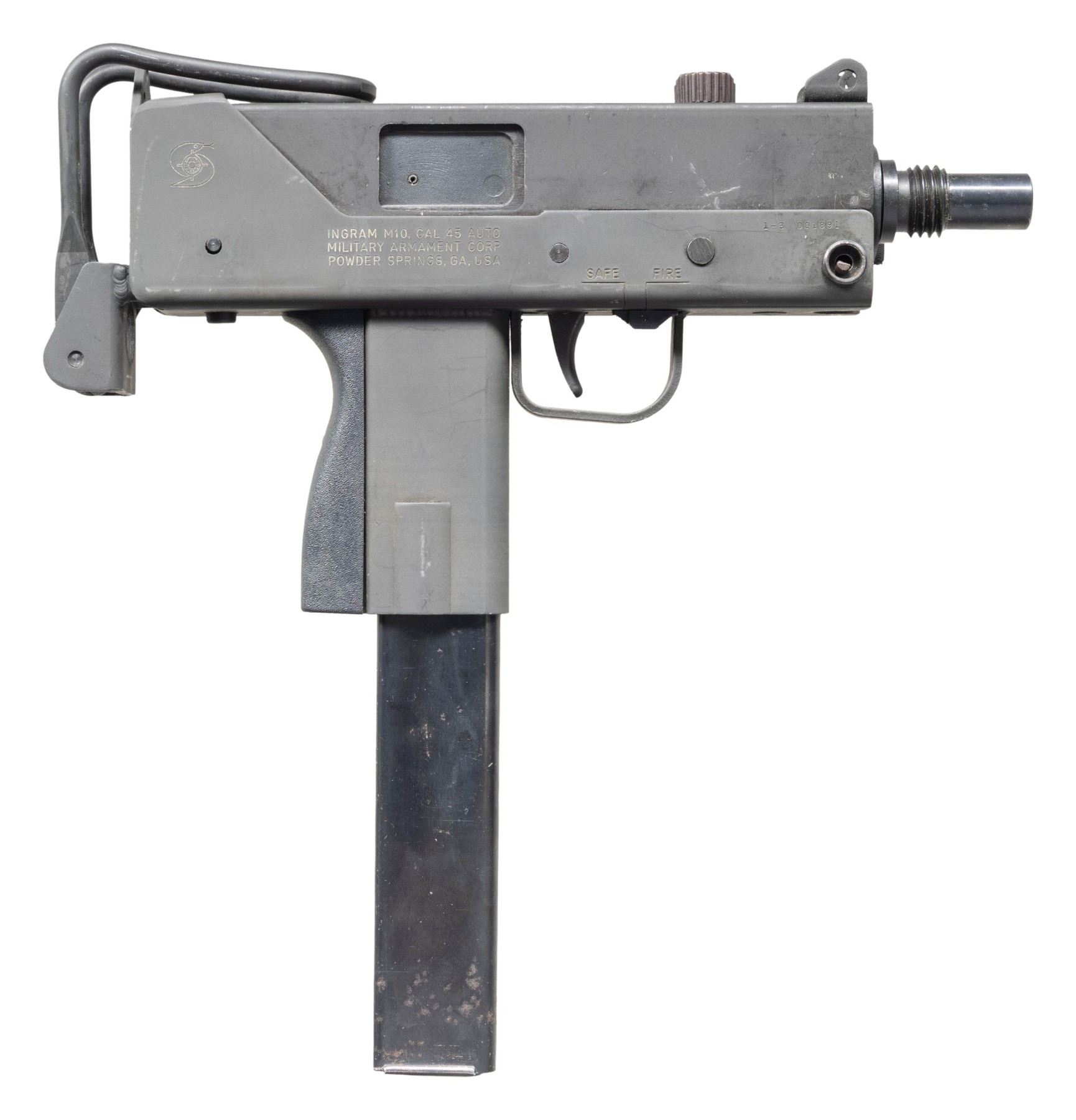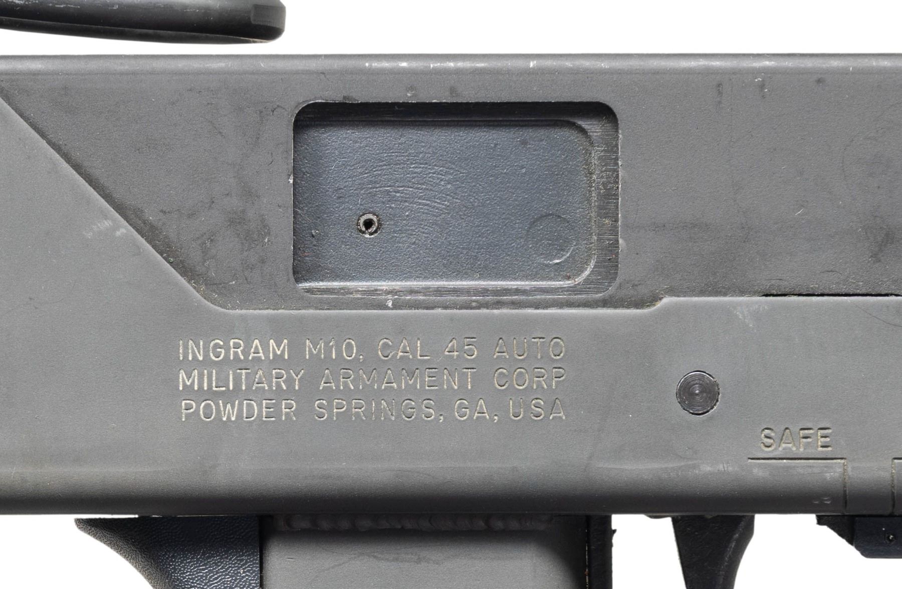 TURN KEY PACKAGE. Cal.45ACP. S# 1-3001891. Bbl. 6". There are very few firearms that conjure up the imagination of the general public more than the mere mention of the MAC 10. The Ingram Model 10 was originally designed in 1964. It would become the 1st of many small, simplistic SMGs to contrast the expensive & labor intensive earlier SMG variants such as the Thompson & Reising M50. Ingram's 2 basic guidelines while designing the Model 10 "simple & cheap" while remaining effective & reliable. Made famous mostly by Hollywood, the M10 had appearances on the silver screen & on television eventually earning the infamous title of "The Gun That Made The 80's Roar" starting w/ John Wayne utilizing a suppressed 9mm M10 in the 1974 movie "McQ". A favorite example used by the organized anti-gun movement, the Mac 10 was eventually, incorrectly & inaccurately synonymous w/ every crime committed for a long period of time. Here we have an Ingram variant manufactured in Powder Springs, GA. Chambered in 45 ACP. Protected post fixed front sight & rear peep sight that is integral w/ the receiver. Select fire, open bolt, blowback action. Selector on left side of receiver. Safety inside trigger guard. Telescoping shoulder stock. Front hang strap. MAGS: (9 total) 3 steel 30 rd. modified 45ACP grease gun, 4 steel 30 rd. unmodified 45 ACP grease gun, 1 steel 36 rd. 9mm, 1 steel Sentinel Corp .22LR w/ adapter. UNATTACHED ACCESSORIES: complete 9mm barreled upper receiver & mag. adapter, Sentinel rimfire conversion kit, including bolt, barrel, mag. & adapter, 45acp loading tool. CONDITION: exposed metal surfaces enjoy a parkerized finish w/ complete coverage throughout. Very few handling marks & drag lines,as typical of these. Collapsible wire stock locks correctly in both open & closed positions as does the folding shoulder section. Bores all retain descent rifling. Fire control mechanism appears to function correctly when cycled by hand. NATIONAL FIREARMS ACT MG REQUIRING BATF TRANSFER BEFORE TAKING POSSESSION. FULLY TRANSFERABLE.(03-1911/JZ). CURIO CLASS III. $6,500-9,500.