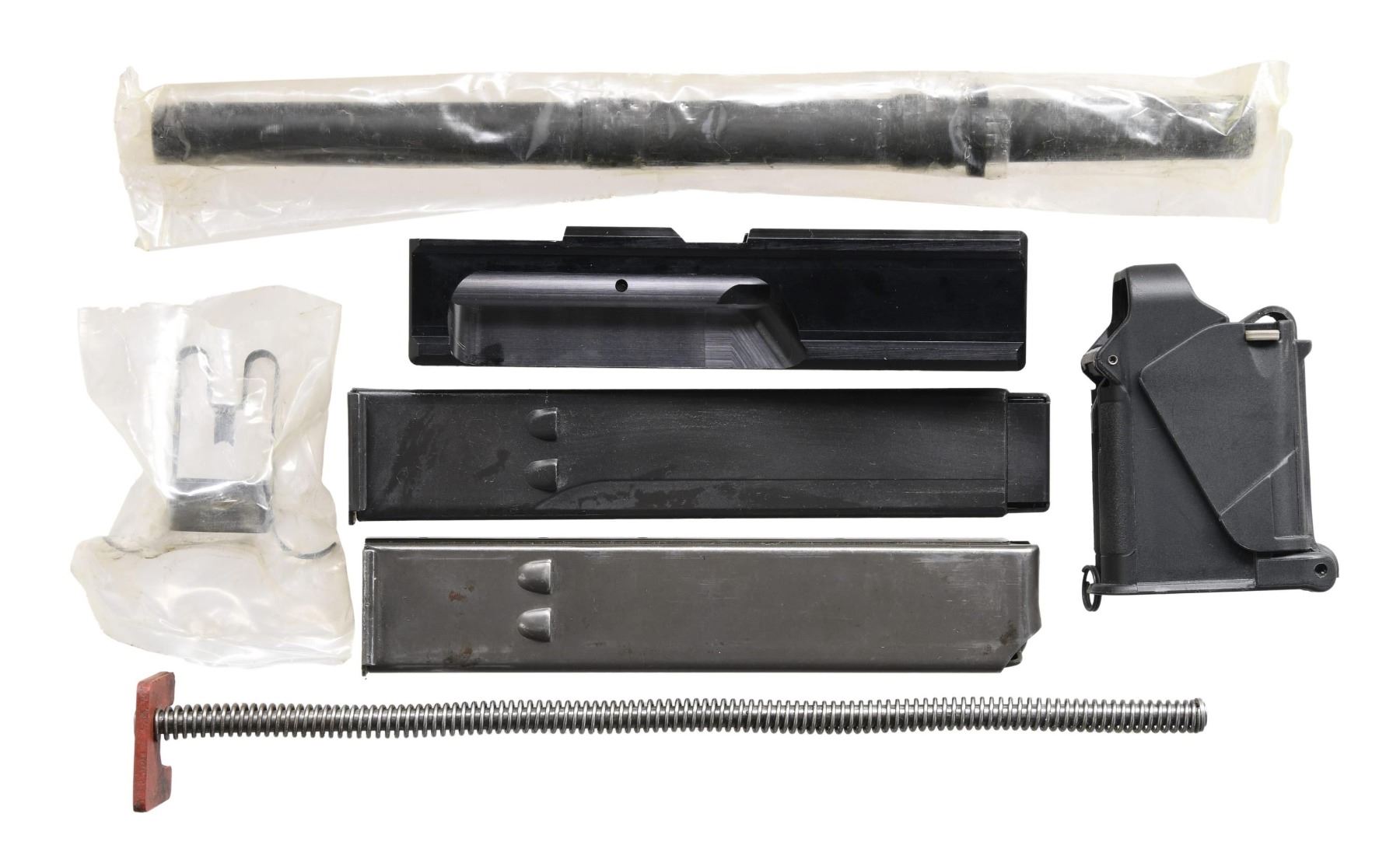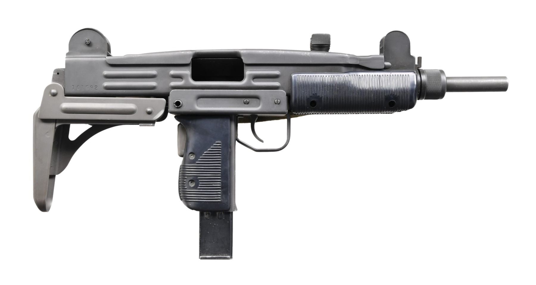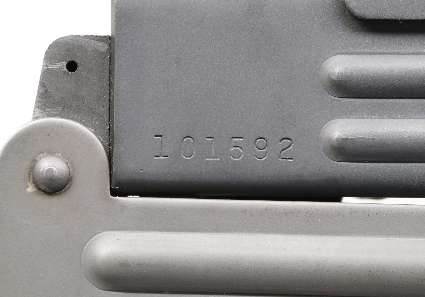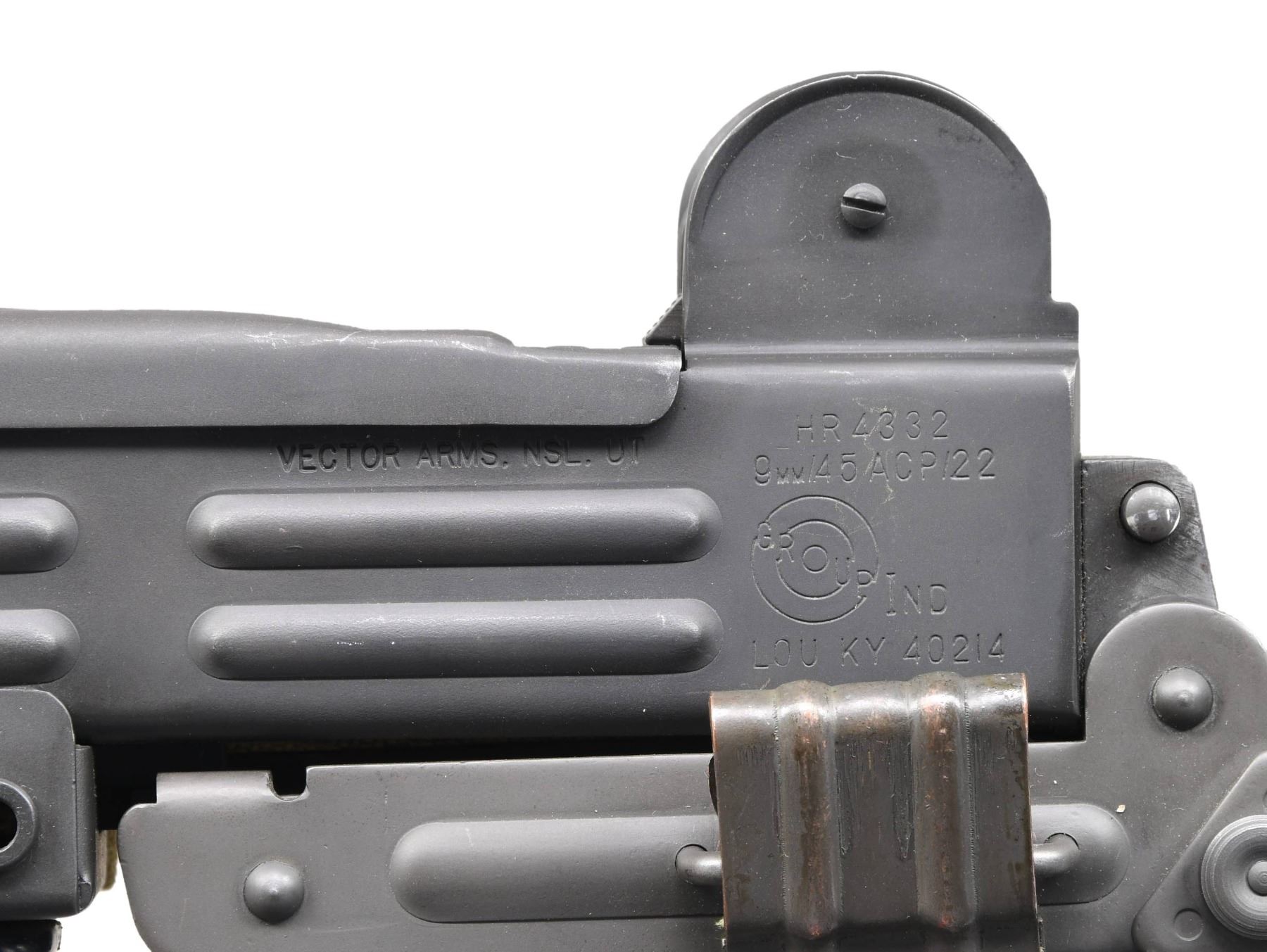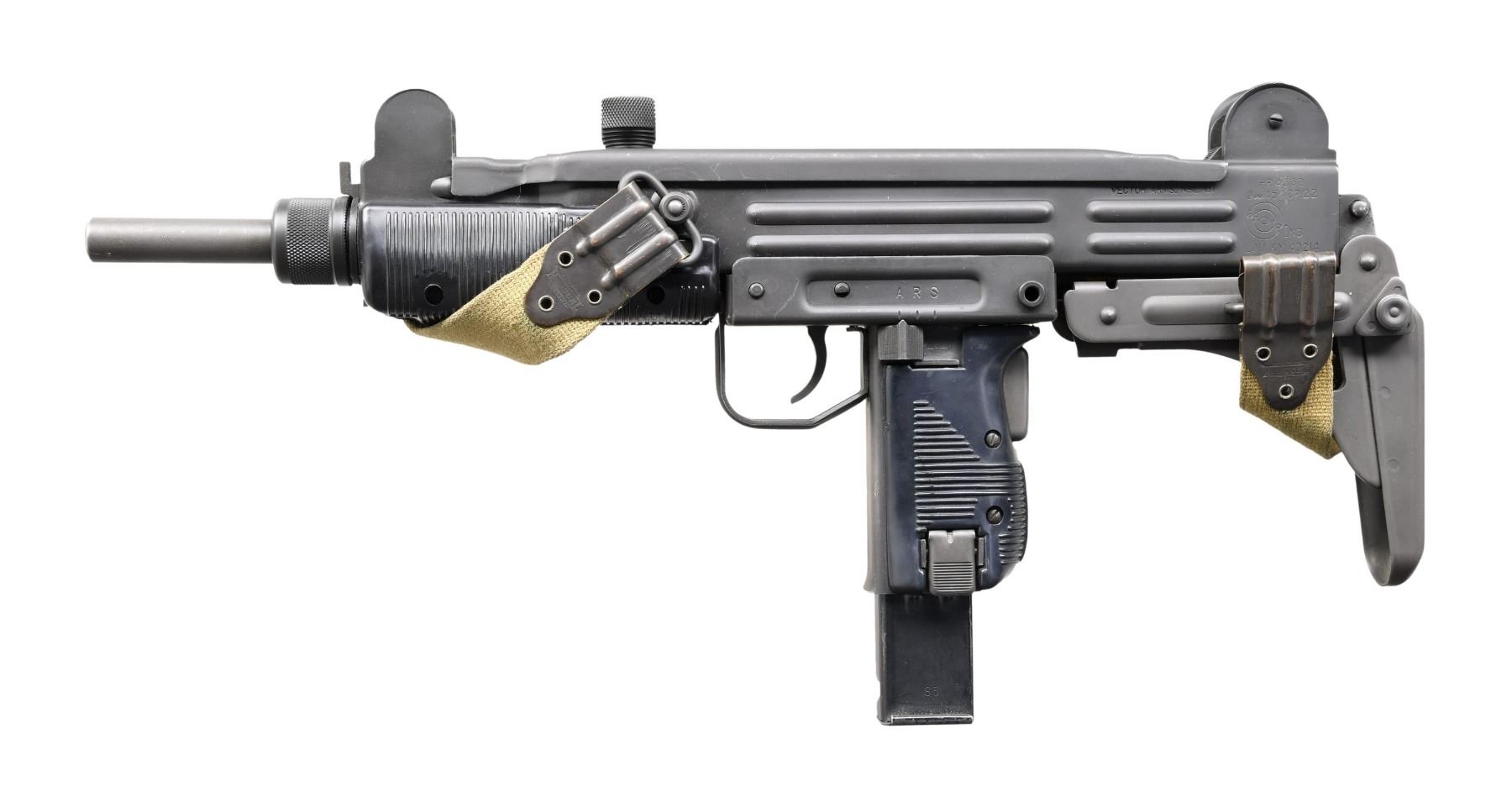 Cal. 9mm. S# 101592. Bbl. 10 1/4". Model HR4332 is one of the most sought after Uzi Platforms on the market. These guns were purpose built as machine guns w/ proper heat treating & available in several calibers. While they are often stamped in multiple calibers, the vast majority were actually offered in 9mm parabellum. The original Uzi SMG is an open bolt, select fire mechanism that is light years ahead of its technology when it comes to use, it can be utilized in its collapsed, concealable configuration, yet takes only moments to extend the rear stock w/ a simple slap of the control hand pulling it into its extended position. The Uzi bbl. only appears to be a couple inches in length which greatly minimizes its signature for use in tight quarters, but because of the ingenious design it actually extends back inside of the bolt giving the operator over 10" of rifled bbl. to increase hit probability immensely. Its ratcheting top cover is an important safety factor when utilizing an open bolt mechanism. Those that are familiar w/ the 1911 family of firearms will appreciate the grip safety integrated into the mechanism. This particular example has black plastic furniture, bottom front mounted bayonet lug & sling swivels on left side of receiver & stock, currently sporting tan canvas sling. Windage & elevation adjustable, protected post front sight. Dual aperture rear sight. Left side markings "A-R-S" above safety/selector. Left rear receiver markings "VECTOR ARMS ASL. UT / HR4332 / 9MM/45 ACP/22 / GROUP IND (inside target logo) / LOU KY 40214". Right side receiver markings include S# 101592. MAGS: (4 total) 2 steel 25 rd. & 2 steel 32 rd. UNATTACHED ACCESSORIES: Vector Arms .22LR subcaliber kit, . UpLula pistol mag loader, CONDITION: all exposed metal surfaces are black parkerized w/ some gentle thinning in areas of mechanical intervention & a few light drag lines typical of nominal use. All outward appearances indicate this firearm has seen very little use. Stock locks tight & positive in both open & closed position. Fire control mechanism appears to function correctly when cycled by hand. Bright bore w/ strong rifling. NATIONAL FIREARMS ACT MG REQUIRING BATF TRANSFER BEFORE TAKING POSSESSION. FULLY TRANSFERABLE. (03-1753/JZ). MODERN CLASS III. $8,000-12,000.