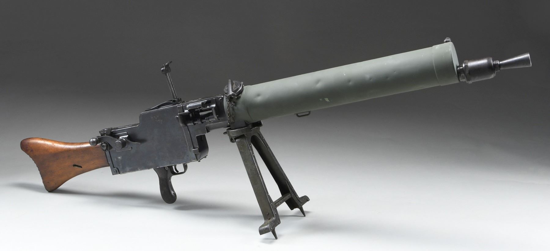 MG08/15 MACHINE GUN. CURIO. Cal. 7.92 Mauser. S# 4357. Bbl. 28". 1917 German Erfurt Maxim 08/15 transferable water-cooled MG. Manufactured as a more portable variant of the famous Maschinengewehr 08, or MG08, Germany's standard machine gun in World War I. Both are direct evolutions of Sir Hiram Maxim's original 1884 Maxim gun. The MG08-15 utilizes a shoulder stock and forward mounted pistol grip & trigger for firing prone from a bipod. While retaining a similar water jacket, fusee cover and knuckle-buster charging system to Sir Hiram Maxim's original design, it has a much smaller receiver signature and is intended to be fired in a similar fashion to a traditional rifle, without the necessity of a heavy mount. This example was originally manufactured by Erfert in 1917. BATFE paperwork states the manufacturer as "Erfurt WWI Germany". Much of it still retains matching numbers including the top cover, left sideplate, & external charging mechanism. Easily serviced and upgraded parts at the armory level have been changed and display different numbers, such as the bolt, bearing #2751 and the fusee cover, bearing #5603, which is common. Finish on the receiver is blued, matching the top cover as well. Markings are clear and strong throughout. Blade front sight. Rear sight graduated from 400 meters to 2000 meters. The water jacket has been painted green whole the muzzle booster retains is original bluing. Hardwood shoulder stock and checkered pistol grip. Bipod is also painted an older shade of green. MAGS: 1 WWI era Cloth belt w/ brass tabs. UNATTACHED ACCESSORIES: 1 Drum hanger, water hose. CONDITION: Blued finish on receiver enjoys fairly full coverage with areas of thinning, w/ some areas turned typical brown in areas. Fussee cover finish has spots thinned back to the original metal. All possess clear, legible original stampings in several areas. Top cover has additional number on top "37". Water jacket & bipod each possess their own shade of paint, & while the water jacket is complete, obviously painted most recently, it demonstrates some light dings. Wooden shoulder stock has several typical impressions and a few light cracks, though nothing appears to have affected the structural integrity. Pistol grip is checkered with only a few impressions. Drum hanger has broken & needs to be rewelded to be functional. Bore is quite bright but still retains strong rifling. Fire control mechanism appears to function correctly when cycled by hand. NATIONAL FIREARMS ACT MG REQUIRING BATF TRANSFER BEFORE TAKING POSSESSION. FULLY TRANSFERABLE. PROVENANCE: From the Lifelong Collection of Brian Linde. (03-1808/JZ). CURIO CLASS III. $9,000-$14,000