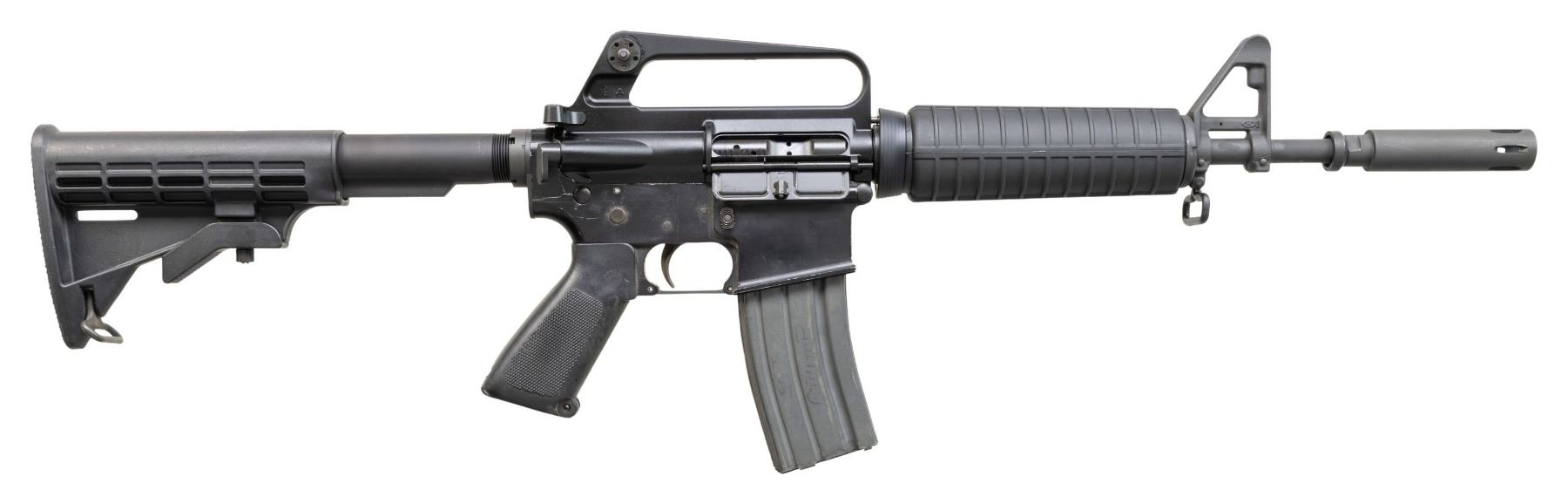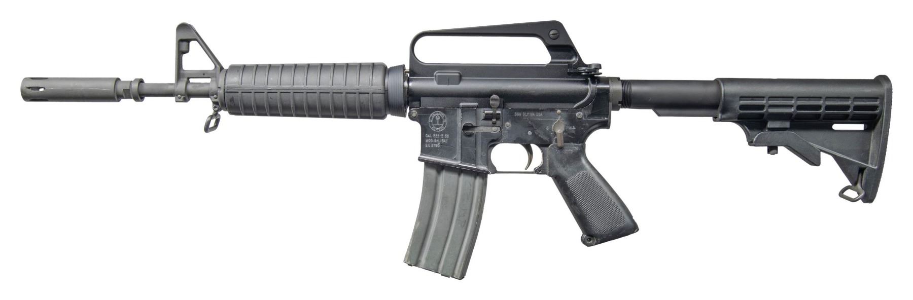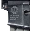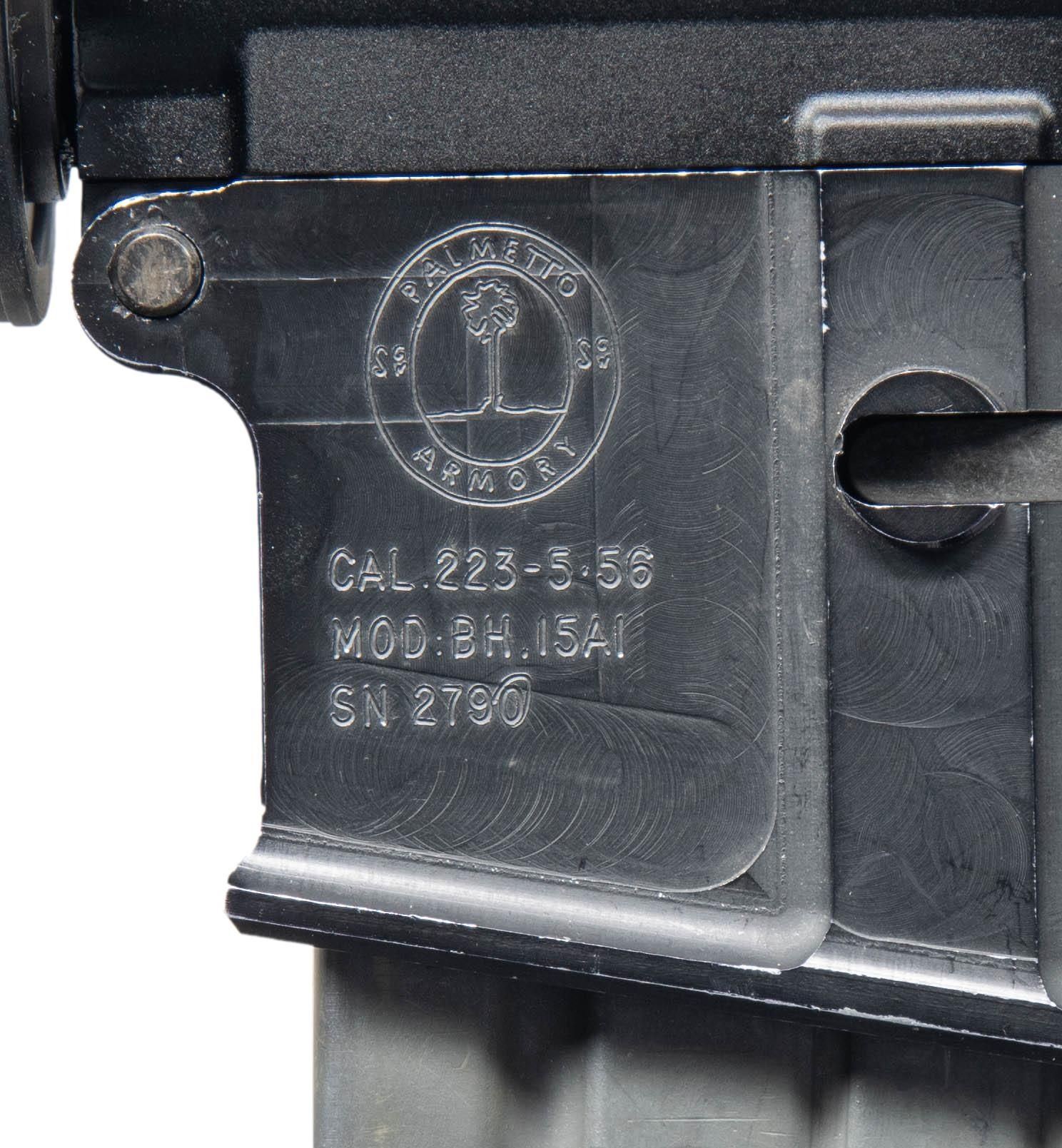AR-15 CARBINE. Cal. 223. S# 2790. Bbl. 11". An SGW converted select fire,Palmetto Armory BH15A1. Muzzle terminated w/ 4.75" flash hider. Protected post front sight / gas block w/ no bayonet lug. Round, carbine handguards retained w/ tapered delta ring. Carry handle upper receiver w/ forward assist & dual aperture rear peep sight. 6 position collapsible shoulder stock. Sling swivels front & rear. BATF paperwork model marked AR-15. MAGS: 1 aluminum 30 rd. CONDITION: upper receiver illustrates very little evidence of use, while lower receiver is more period correct w/ some high spot thinning & a few drag lines. Internal finish never replaced after full auto conversion which wasn't uncommon. M16 profile bolt carrier. Fire control mechanism appears to function correctly when cycled by hand. Bright bore w/ strong rifling. NATIONAL FIREARMS ACT MG REQUIRING BATF TRANSFER BEFORE TAKING POSSESSION. FULLY TRANSFERABLE.(03-1943/JZ). MODERN CLASS III. $15,000-20,000.