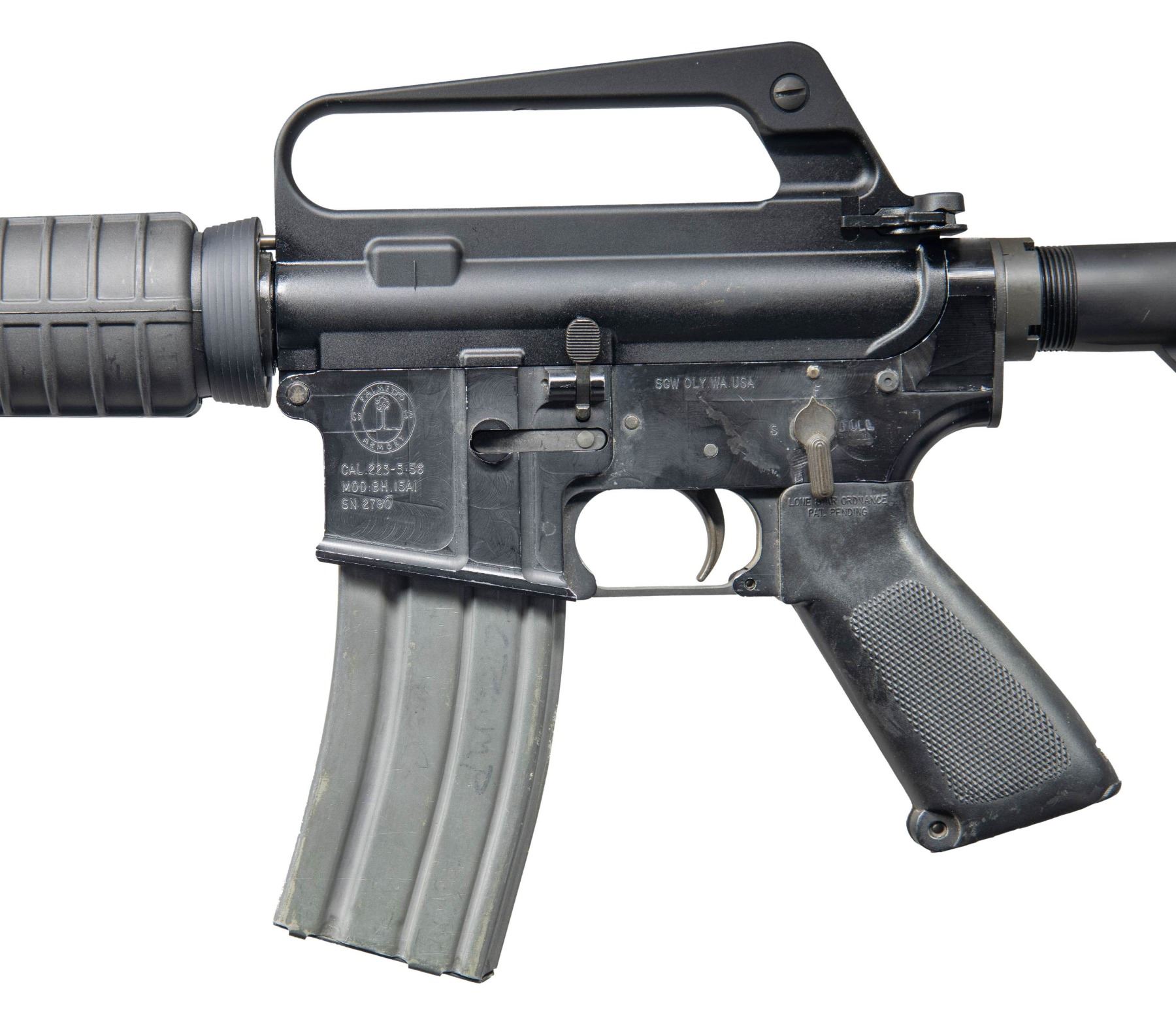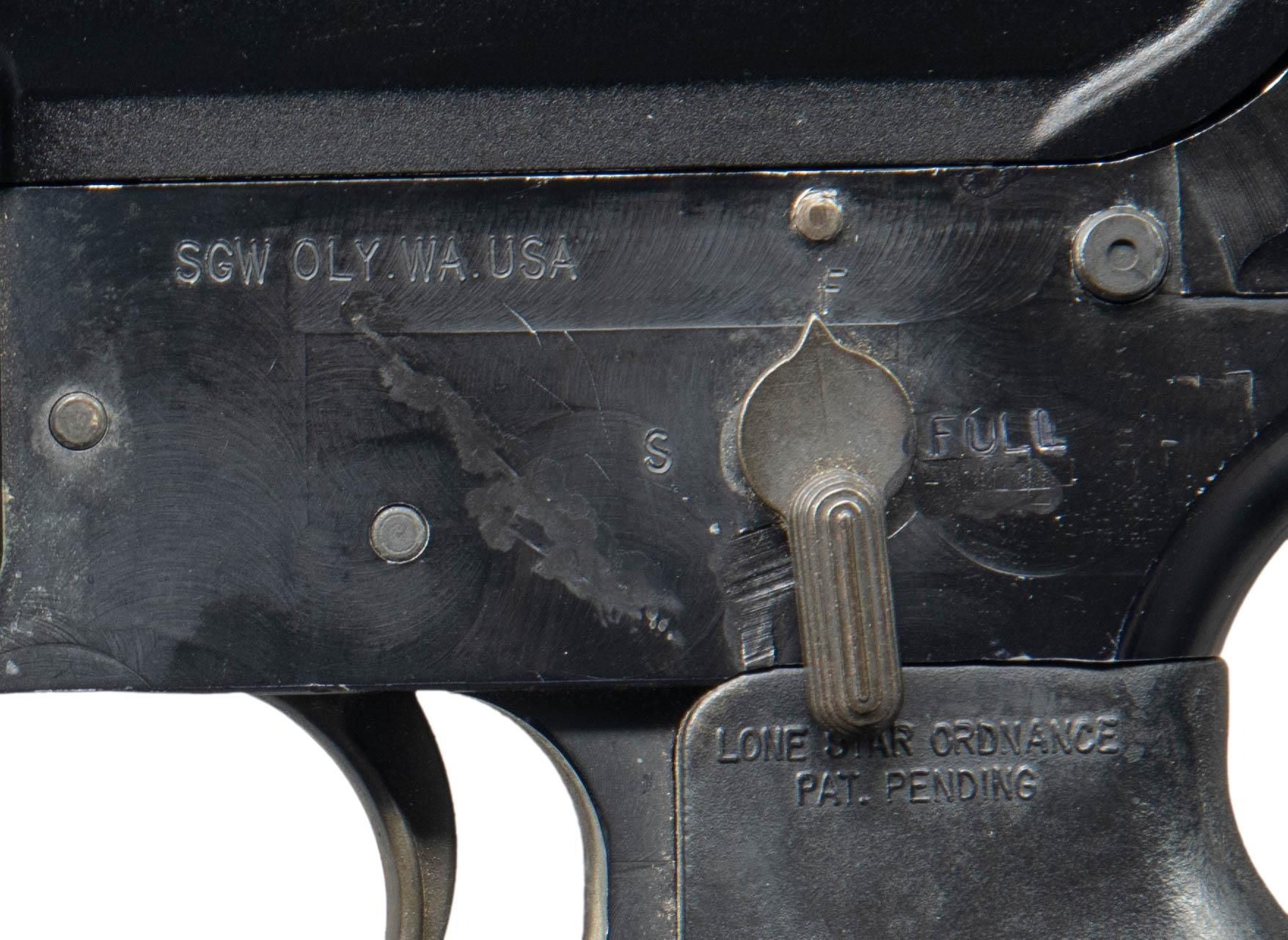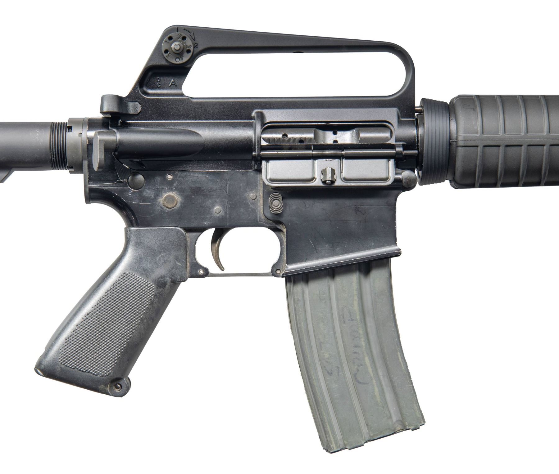 AR-15 CARBINE. Cal. 223. S# 2790. Bbl. 11". An SGW converted select fire,Palmetto Armory BH15A1. Muzzle terminated w/ 4.75" flash hider. Protected post front sight / gas block w/ no bayonet lug. Round, carbine handguards retained w/ tapered delta ring. Carry handle upper receiver w/ forward assist & dual aperture rear peep sight. 6 position collapsible shoulder stock. Sling swivels front & rear. BATF paperwork model marked AR-15. MAGS: 1 aluminum 30 rd. CONDITION: upper receiver illustrates very little evidence of use, while lower receiver is more period correct w/ some high spot thinning & a few drag lines. Internal finish never replaced after full auto conversion which wasn't uncommon. M16 profile bolt carrier. Fire control mechanism appears to function correctly when cycled by hand. Bright bore w/ strong rifling. NATIONAL FIREARMS ACT MG REQUIRING BATF TRANSFER BEFORE TAKING POSSESSION. FULLY TRANSFERABLE.(03-1943/JZ). MODERN CLASS III. $15,000-20,000.