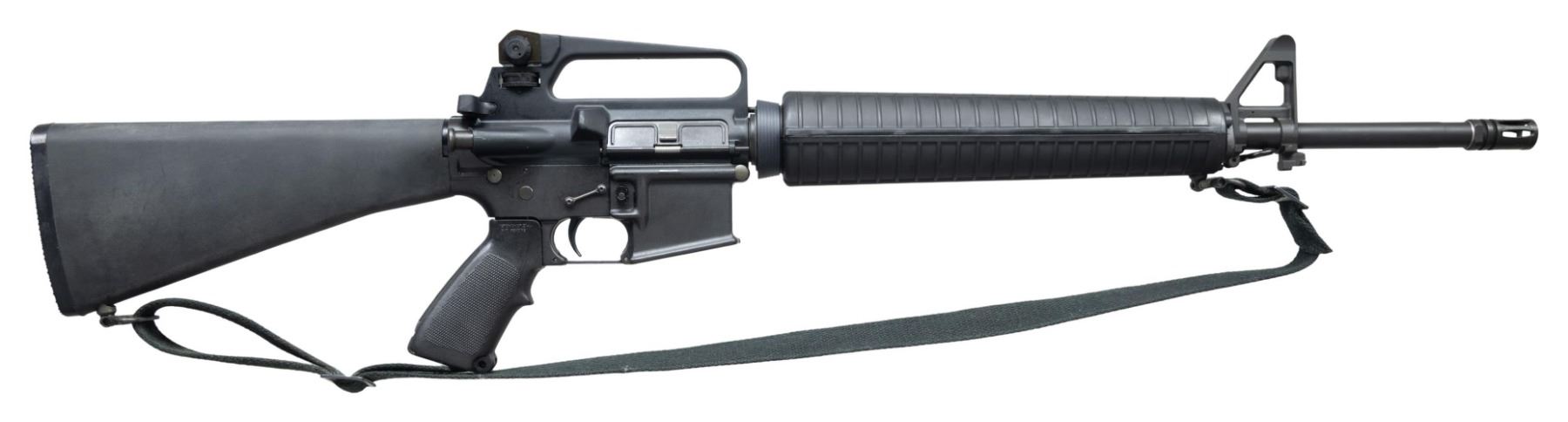 Cal. 5.56mm. S# P0235A. Bbl. 20". An Olympic Arms / P.A.W.S. ZX-16A1 registered receiver rifle in the A2 rifle configuration. 20" barrel w/ threaded muzzle, terminated w/ A2 style flash hider. Protected post front sight / gas block / bayonet lug. Full length A2 rifle handguards, retained by tapered Delta ring. Carry handle upper receiver w/ brass deflector, round forward assist & windage & elevation adjustable, dual aperture, rear peep sight. Full length A2 style shoulder stock w/ trap door. Selector marked "SAFE / FIRE / AUTO" on left side. Anti-walk trigger / hammer pins. Front & rear sling swivels. CONDITION: Finish complete & consistent. Upper receiver a little darker than lower receiver. Bore is bright w/ strong rifling. Fire control mechanism appears to function correctly when cycled by hand. NATIONAL FIREARMS ACT MG REQUIRING BATF TRANSFER BEFORE TAKING POSSESSION. FULLY TRANSFERABLE.(03-1882/JZ). MODERN. CLASS III. $20,000-30,000.