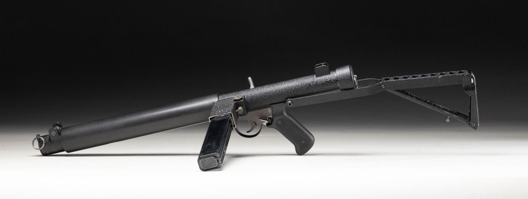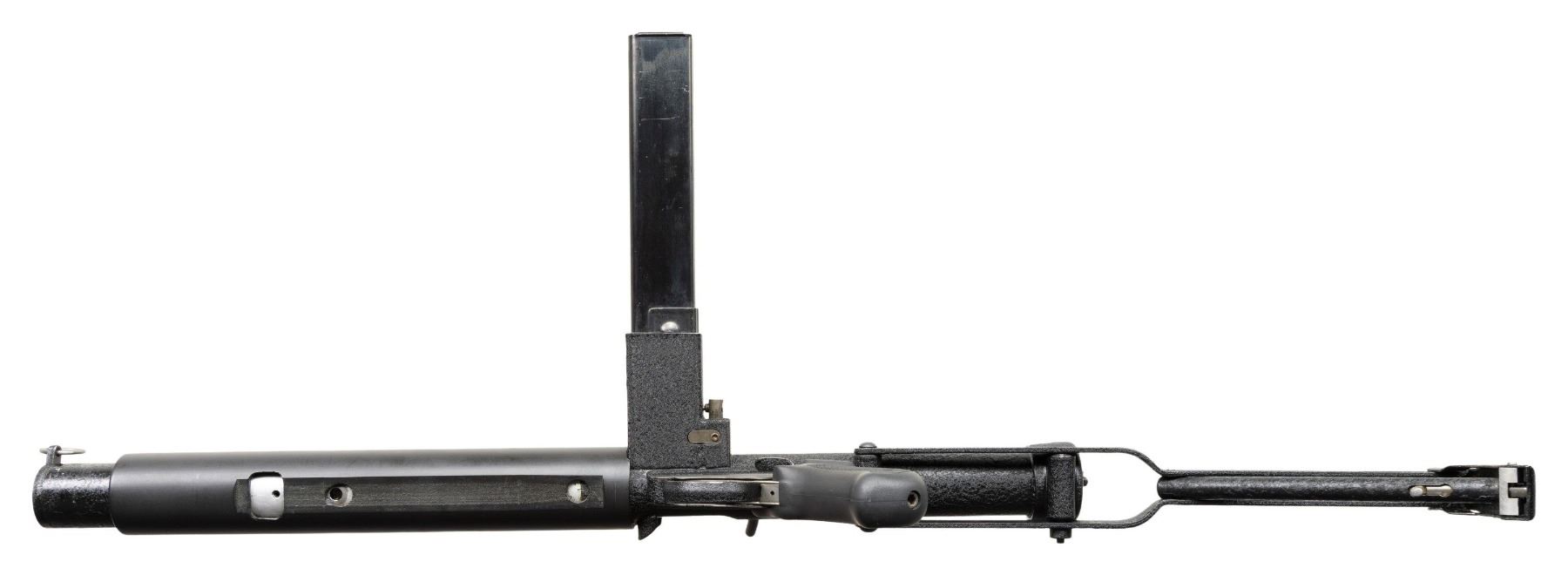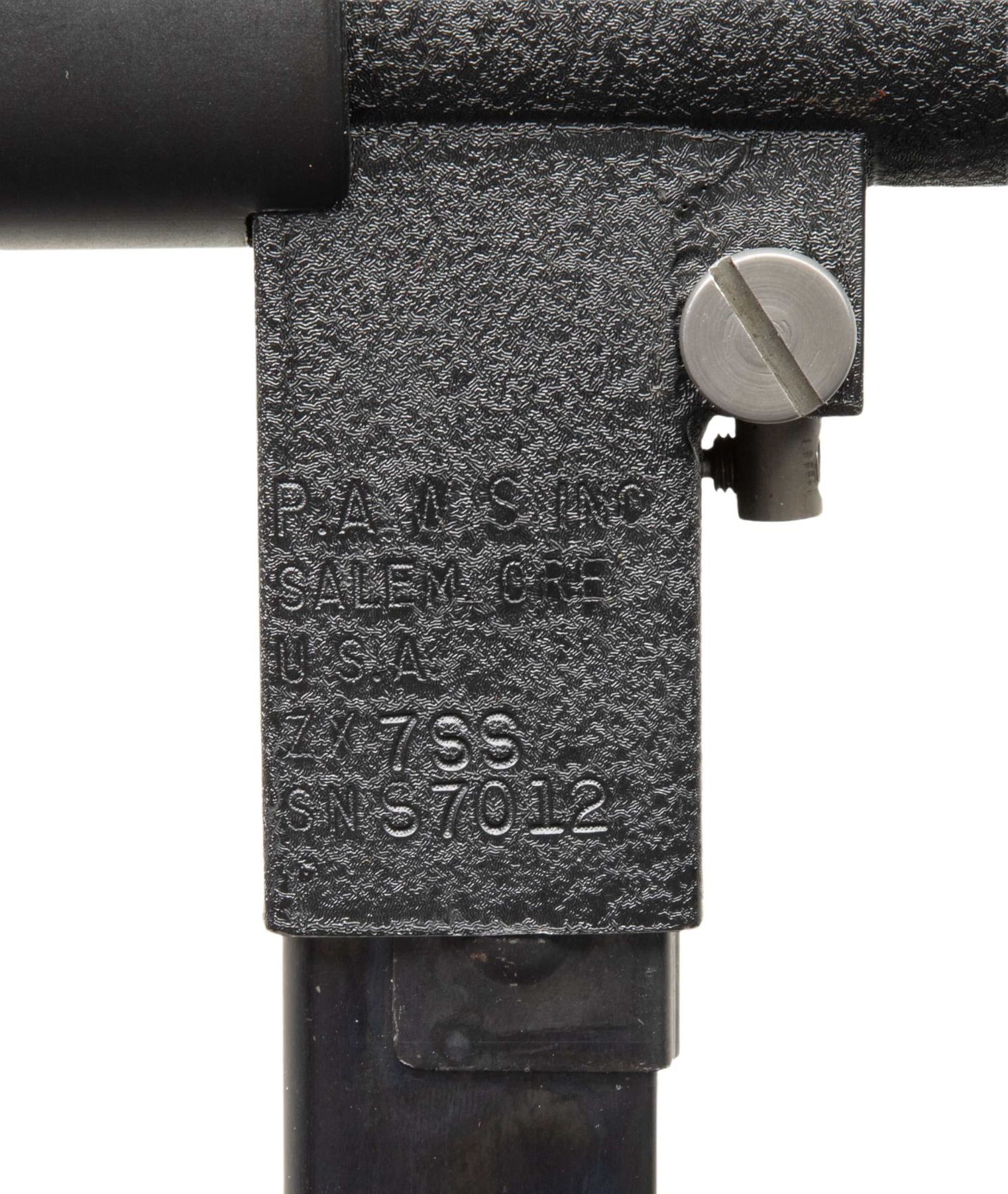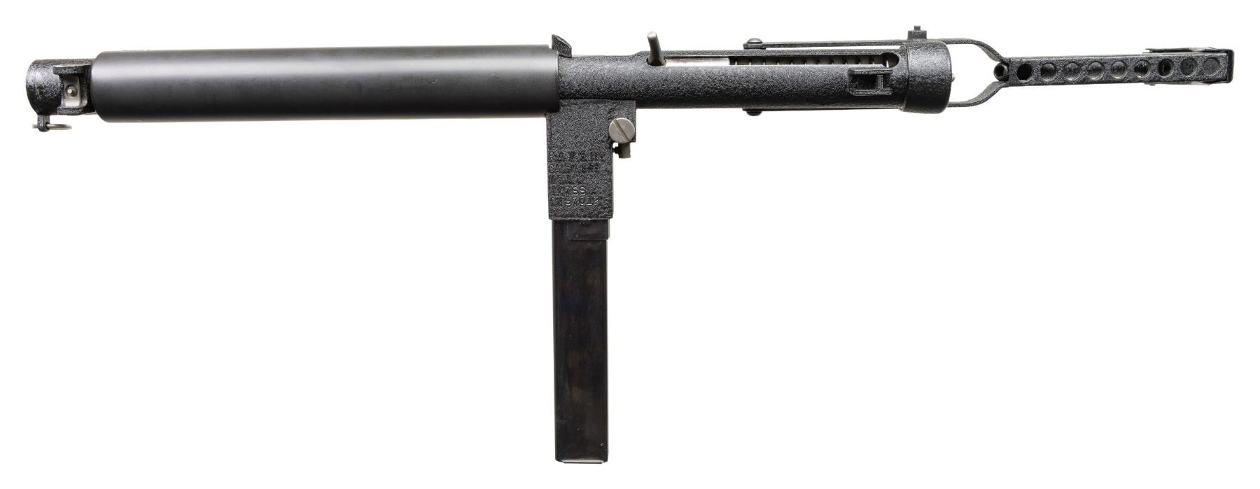SUPPRESSED SUBMACHINE GUN. Cal 45 ACP. S#S7012. Bbl is 13 1/2" with post protected eared front sight. Fixed protected peep sight. The P.A.W.S. ZX6 Carbine was manufactured in Salem, Oregon by Bob Imel, who had a long interest in the Sterling design. In 1967, the process was initiated with Sterling to import their L2A3 SMGs into the United States, but the Gun Control Act of 1968 banned their importation for sale to civilians. Moving forward, Imel started the process w/ Sterling, to manufacture them domestically, utilizing their tooling & parts. When the deal had not consummated by the mid-1970s, Imel founded Police Automatic Weapon Services (P.A.W.S.) & began making them himself. This example has a permanently affixed sound suppressor that transfers on single ATF form. Top of magazine well is marked PAWS Inc/Salem, ORE./U.S.A/ZX7SS/SN S7012". Three position selector. Checkered hard plastic grip. MAGS: 1-30 Round. CONDITION: overall very fine original black pebbled finish with a few scattered mild handling marks. Bright bore with sharp rifling. PROVENANCE: Military Museum Collection of Shooters Outpost, Hooksett NH. NATIONAL FIREARMS ACT MG / SOUND SUPPRESSOR REQUIRING BATF TRANSFER BEFORE TAKING POSSESSION. FULLY TRANSFERABLE (03-1994/ZAL). MODERN. CLASS III. $14,000-18,000.