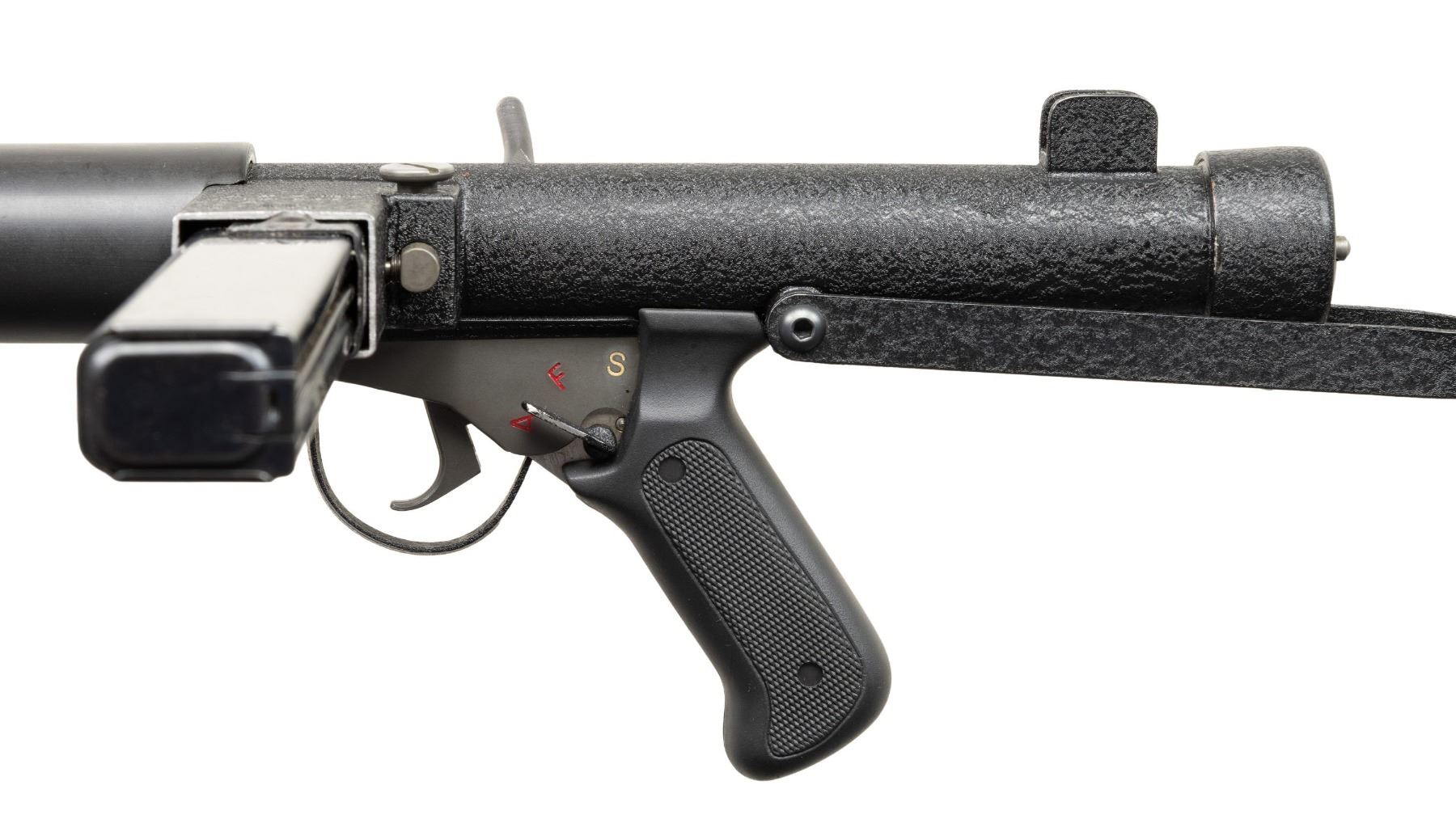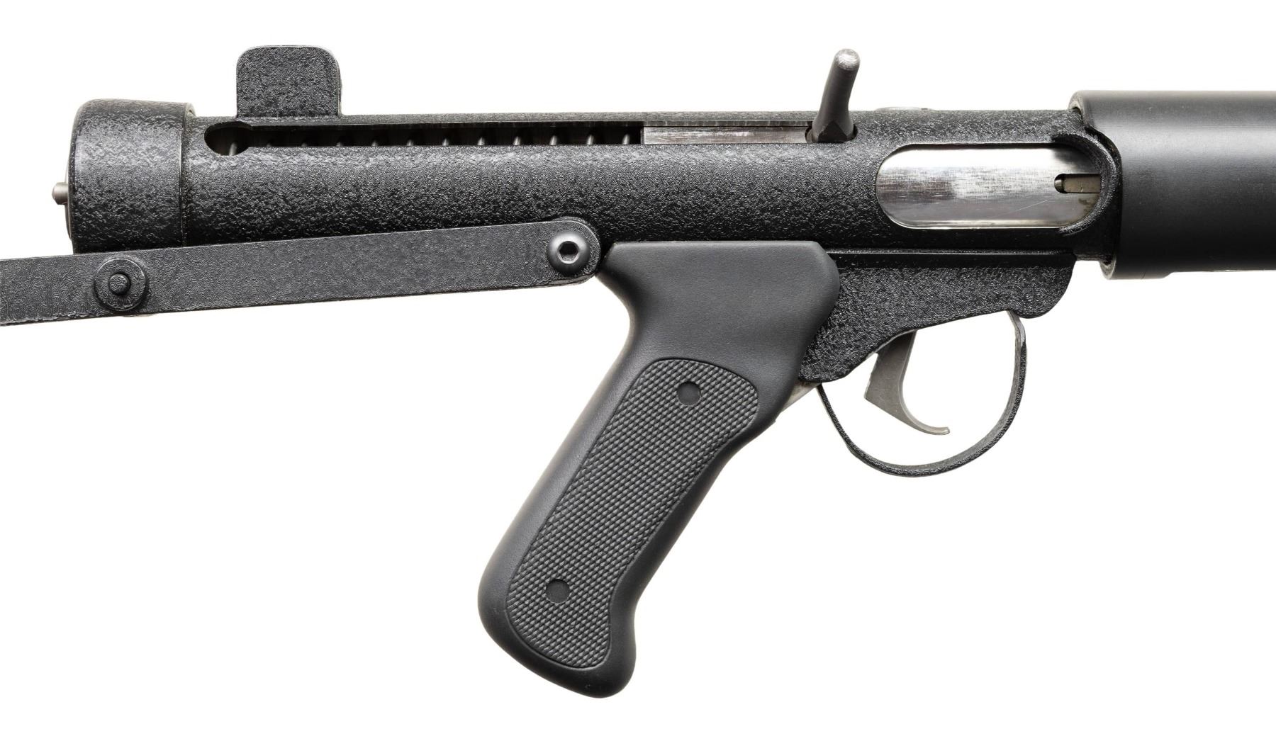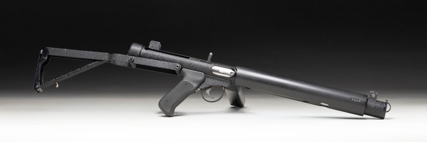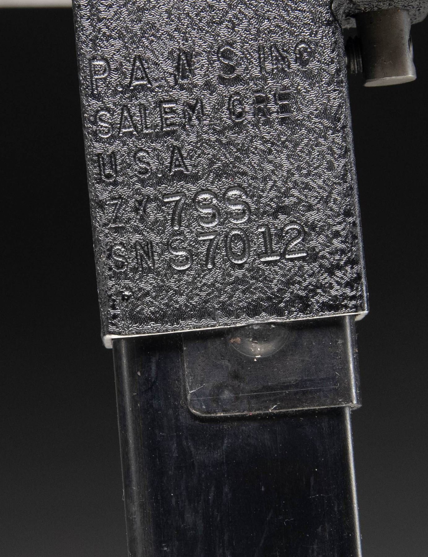SUPPRESSED SUBMACHINE GUN. Cal 45 ACP. S#S7012. Bbl is 13 1/2" with post protected eared front sight. Fixed protected peep sight. The P.A.W.S. ZX6 Carbine was manufactured in Salem, Oregon by Bob Imel, who had a long interest in the Sterling design. In 1967, the process was initiated with Sterling to import their L2A3 SMGs into the United States, but the Gun Control Act of 1968 banned their importation for sale to civilians. Moving forward, Imel started the process w/ Sterling, to manufacture them domestically, utilizing their tooling & parts. When the deal had not consummated by the mid-1970s, Imel founded Police Automatic Weapon Services (P.A.W.S.) & began making them himself. This example has a permanently affixed sound suppressor that transfers on single ATF form. Top of magazine well is marked PAWS Inc/Salem, ORE./U.S.A/ZX7SS/SN S7012". Three position selector. Checkered hard plastic grip. MAGS: 1-30 Round. CONDITION: overall very fine original black pebbled finish with a few scattered mild handling marks. Bright bore with sharp rifling. PROVENANCE: Military Museum Collection of Shooters Outpost, Hooksett NH. NATIONAL FIREARMS ACT MG / SOUND SUPPRESSOR REQUIRING BATF TRANSFER BEFORE TAKING POSSESSION. FULLY TRANSFERABLE (03-1994/ZAL). MODERN. CLASS III. $14,000-18,000.