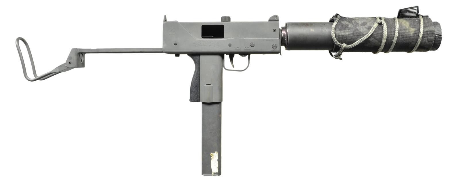 Cal. 45. S# 1-3002918 SMG / D195 SUP. Bbl. 6". There are very few firearms that conjure up the imagination of the general public more than the mere mention of the MAC 10. The Ingram Model 10 was originally designed in 1964. It would become the 1st of many small simplistic SMGs to contrast the expensive & labor intensive earlier variants such as the Thompson & Reising M50. Ingram’s 2 basic guidelines while designing the Model 10 “simple & cheap” while remaining effective & reliable. Made famous mostly by Hollywood, the M10 had appearances on the silver screen & on television eventually earning the infamous title of “The Gun That Made The 80’s Roar” starting w/ John Wayne utilizing a suppressed 9mm M10 in the 1974 movie “McQ”. A favorite example used by the organized anti-gun movement, the Mac 10 was eventually, incorrectly & inaccurately synonymous w/ every crime committed for a long period of time. Here we have an Ingram variant manufactured in Powder Springs, GA. Chambered in 45 ACP. Protected post fixed front sight & rear peep sight that is integral w/ the receiver. Select fire, open bolt, blowback action. Selector on left side of receiver. Safety inside trigger guard. MAGS: 2-30 rd. metal grease gun style mags.  UNATTACHED ACCESSORIES: original SWD sound suppressor w/ nomex cover. CONDITION: exposed metal surfaces enjoy a parkerized finish w/ complete coverage throughout. Very few handling marks consisting of very light scratches & thinning in areas of mechanical intervention.   Collapsible wire stock locks tightly in both open & closed positions as does the folding shoulder section. Bore is clean w/ strong rifling. Fire control mechanism appears to function correctly when cycled by hand. NATIONAL FIREARMS ACT SMG / SUPPRESSSOR REQUIRING BATF TRANSFER BEFORE TAKING POSSESSION. FULLY TRANSFERABLE. (03-1567 & 03-1568/JZ). MODERN. CLASS III. $4,500-6,500.
