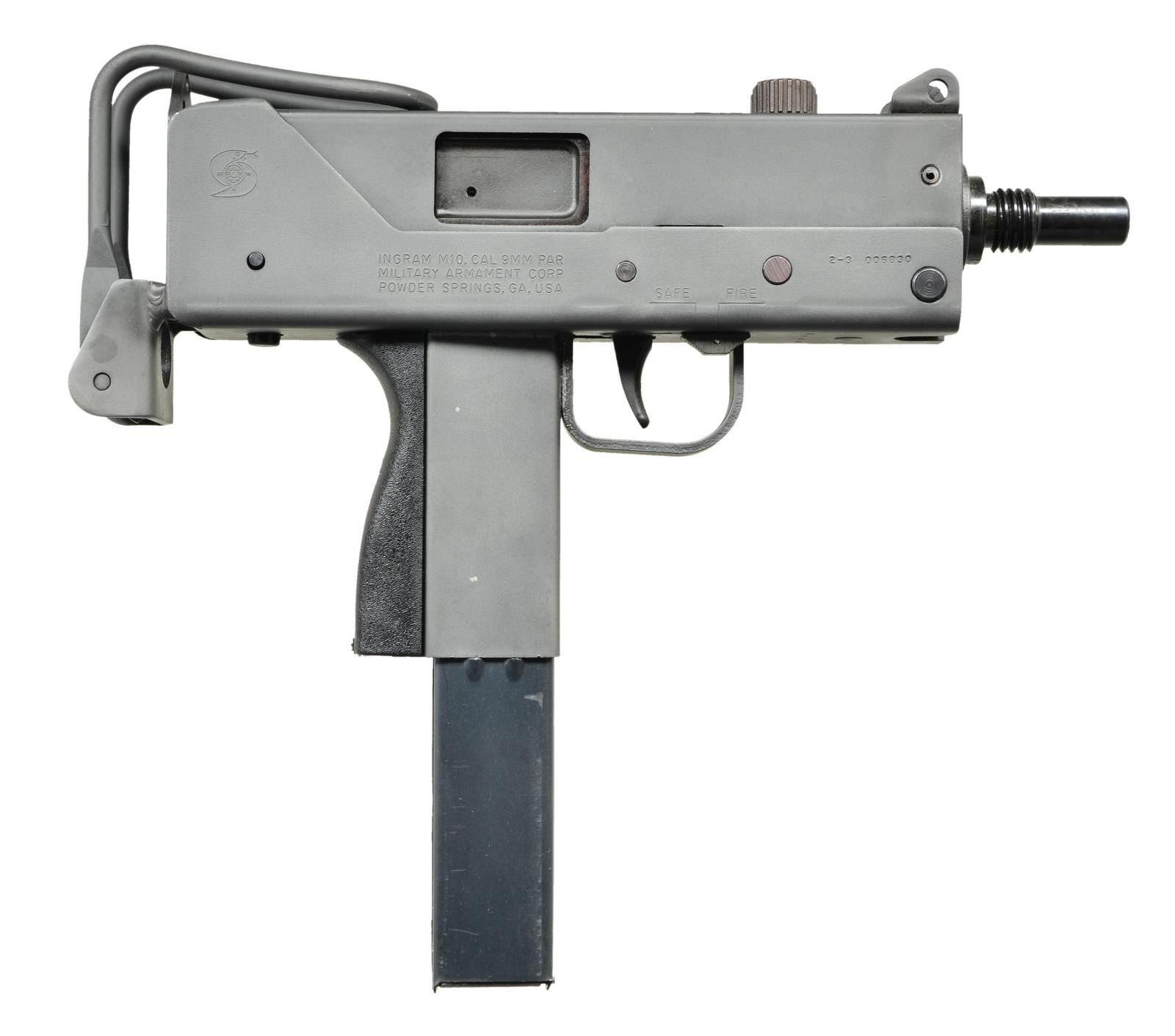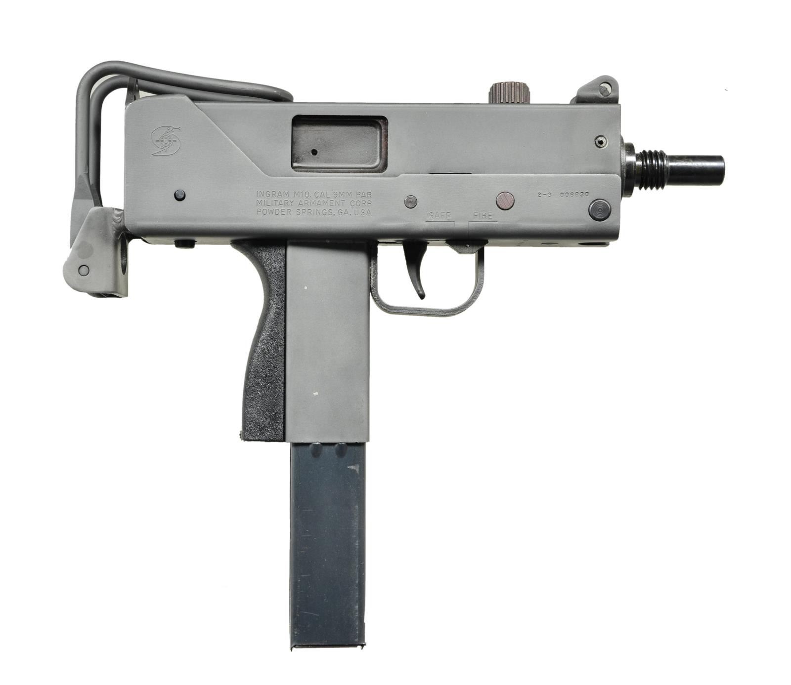 Cal. 9mm. S# 23006830. Bbl. 6". There are very few firearms that conjure up the imagination of the general public more than the mere mention of the MAC 10. The Ingram Model 10 was originally designed in 1964. It would become the 1st of many small simplistic SMGs to contrast the expensive & labor intensive earlier variants such as the Thompson & Reising M50. Ingram’s 2 basic guidelines while designing the Model 10 “simple & cheap” while remaining effective & reliable. Made famous mostly by Hollywood, the M10 had appearances on the silver screen & on television eventually earning the infamous title of “The Gun That Made The 80’s Roar” starting w/ John Wayne utilizing a suppressed 9mm M10 in the 1974 movie “McQ”. A favorite example used by the organized anti-gun movement, the Mac 10 was eventually, incorrectly & inaccurately synonymous w/ every crime committed for a long period of time. Here we have an Ingram variant manufactured in Powder Springs, GA. Chambered in 9mm. Protected post fixed front sight & rear peep sight that is integral w/ the receiver. Select fire, open bolt, blowback action. Collapsible stock that folds over the top rear of the receiver when not in use. Selector on left side of receiver. Safety inside trigger guard on right side. MAGS: 1 steel 36 rd. CONDITION: exposed metal surfaces enjoy a parkerized finish w/ complete coverage throughout. Very few handling marks consisting of very light scratches & thinning in areas of mechanical intervention. Collapsible wire stock locks tightly in both open & closed positions as does the folding shoulder section. Bore is clean w/ strong rifling. Fire control mechanism appears to function correctly when cycled by hand. NATIONAL FIREARMS ACT SMG / REQUIRING BATF TRANSFER BEFORE TAKING POSSESSION. FULLY TRANSFERABLE. (03-1614/JZ). MODERN. CLASS III. $4,500-6,500.