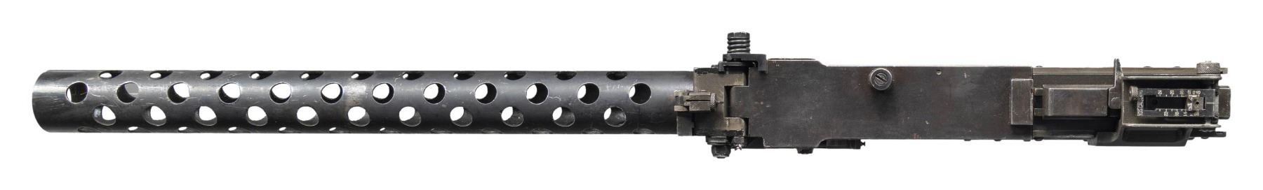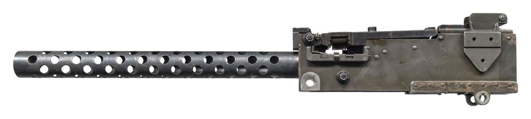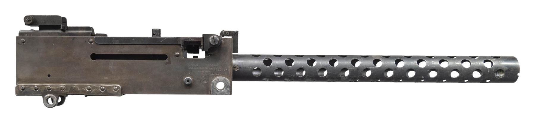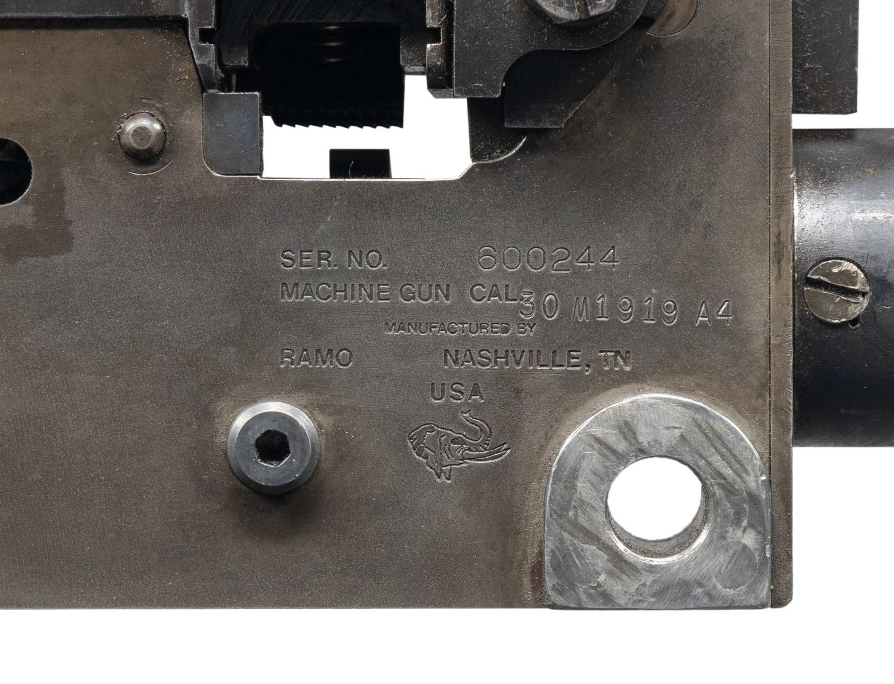 MACHINE GUN. Cal. 30. S# 600244. Bbl. 24". Mfg. by RAMO. The 1919 is one of the most iconic ground & vehicle mounted machine guns in U.S. Military history w/ such a long range of service, from the early 1920's through Vietnam, video footage as well as Hollywood films have featured this weapon system in countless reels. Originally it was intended to be the "go-to" Browning design tank gun in WWI, though it was introduced a little too late. It utilizes a heavier bbl. than its water cooled predecessor & traded the massive water jacket for a much slimmer slotted bbl. shroud for air cooling. The 1919A4 is one of the most commonly encountered & was originally issued in both a fixed & flexible platform. The fixed gun was often used on WW2 vehicles, while the flexible had a focus as an infantry company level machine gun. Numerous mounting options were available, including several tripod variants, pedestal mounts & even an A6 variation, which utilized a bipod & shoulder stock, w/ the intention of making it more user friendly. Today, these guns are highly sought after by recreational shooters & reenactors. They saw such a long period of service that spare parts are fairly readily available. This specific offering is comprised of an original part set & is assembled on a RAMO sideplate. Black parkerized finish on all exposed surfaces. Flip up blade style front sight & flip up rear sight w/ adj. peep for windage & elevation up to 2400 yds. Currently chambered in 30-06. UNATTACHED ACCESSORIES: Spare barrel shroud. CONDITION: all exposed metal parts enjoy period typical parkerized coverage w/ high spot thinning. Missing receiver internals, though these parts are readily available. NATIONAL FIREARMS ACT MG REQUIRING BATF TRANSFER BEFORE TAKING POSSESSION. FULLY TRANSFERABLE. (03-1881/JZ). MODERN CLASS III. $12,000-18,000.